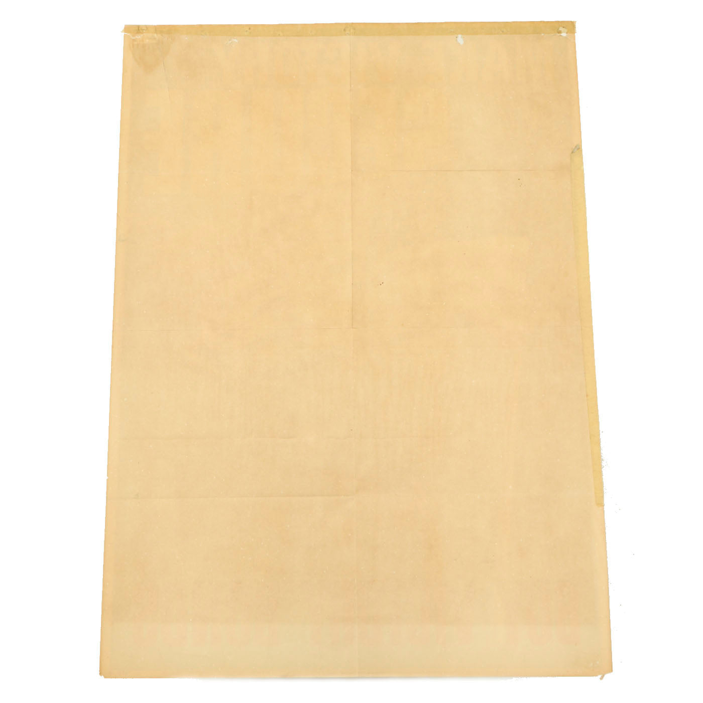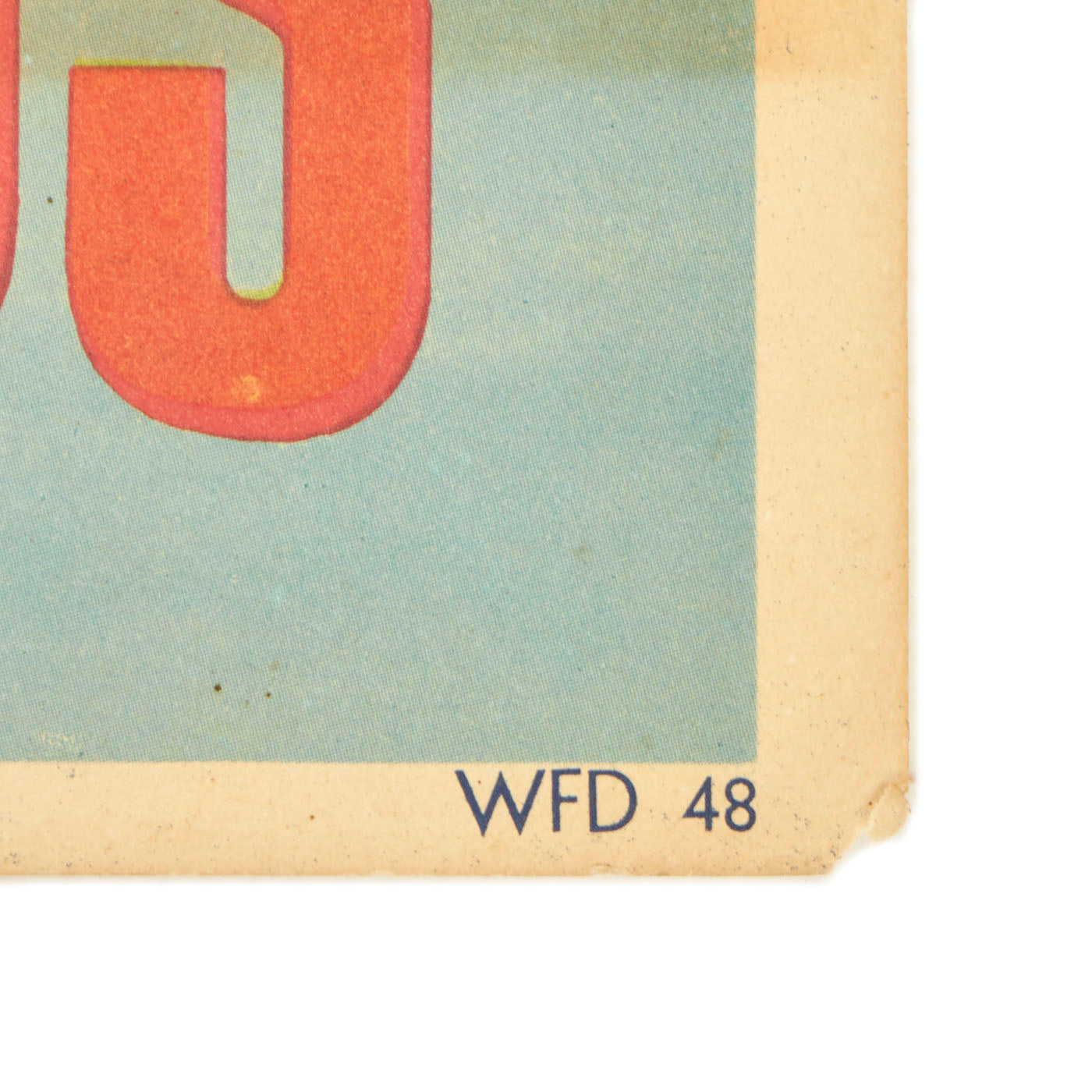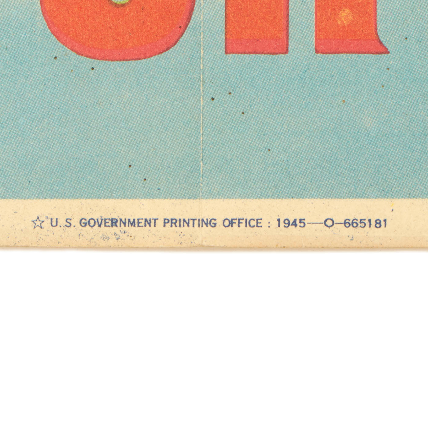 The poster measures 26” x 18 ½” and is in lovely condition. There is, however, minor damage on the top. There is a slight tear in the upper right corner and a few small holes along the top border. The edges and corner display signs of light wear. The original fold marks were created for the shipping process during the war and are still present.