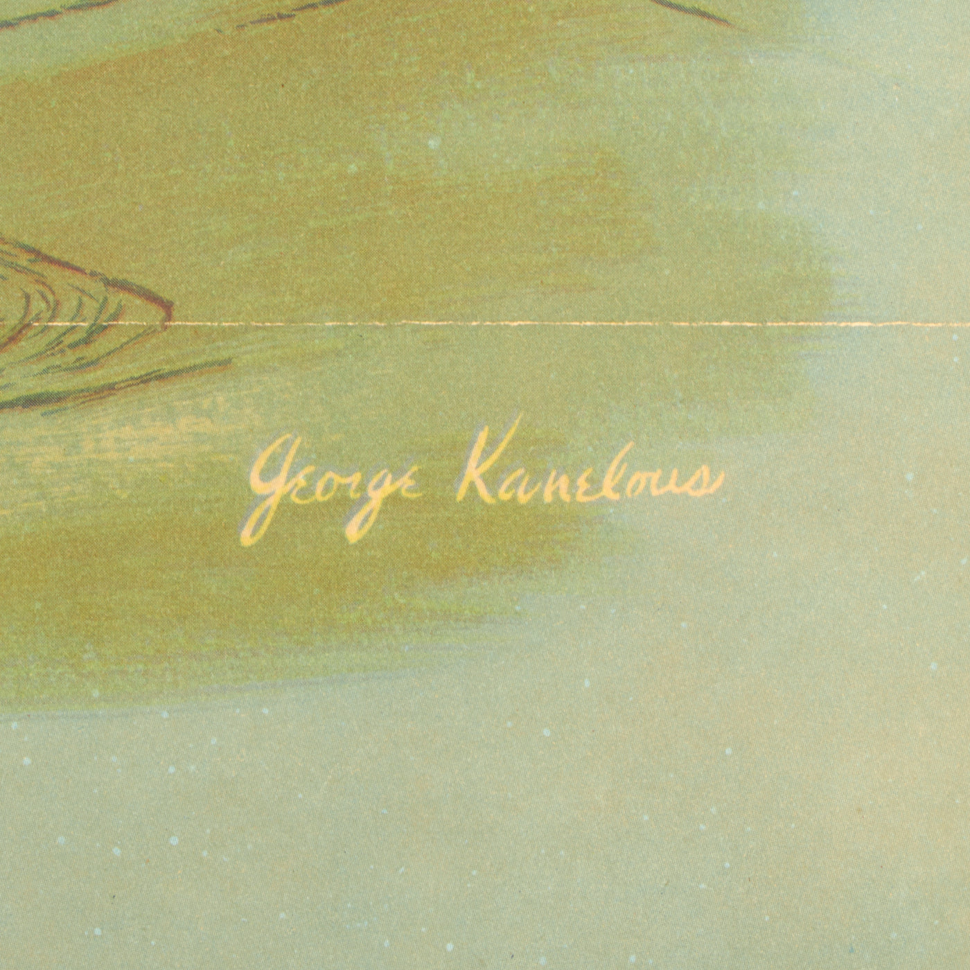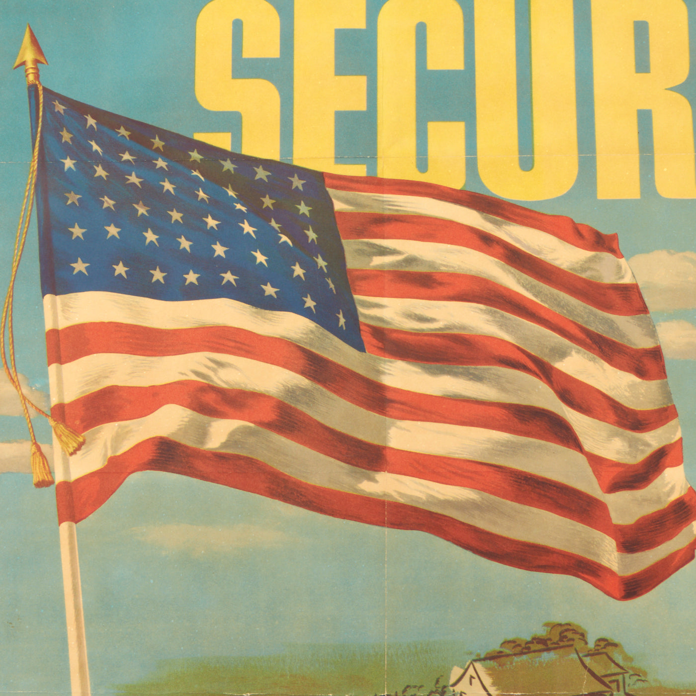 This poster with artwork by George Kanelous and was distributed in 1945 by the U.S. Government Printing Office. The poster features a particularly effective image of the American flag flying over a lightly sketched rural farm scene and was painted by George Kanelous (1915-1998). Kanelous, born in Uruguay of Greek parents, came to the United States at age three. He participated in the WPA mural projects and was known as an illustrator for magazines as well as for his commercial art.
