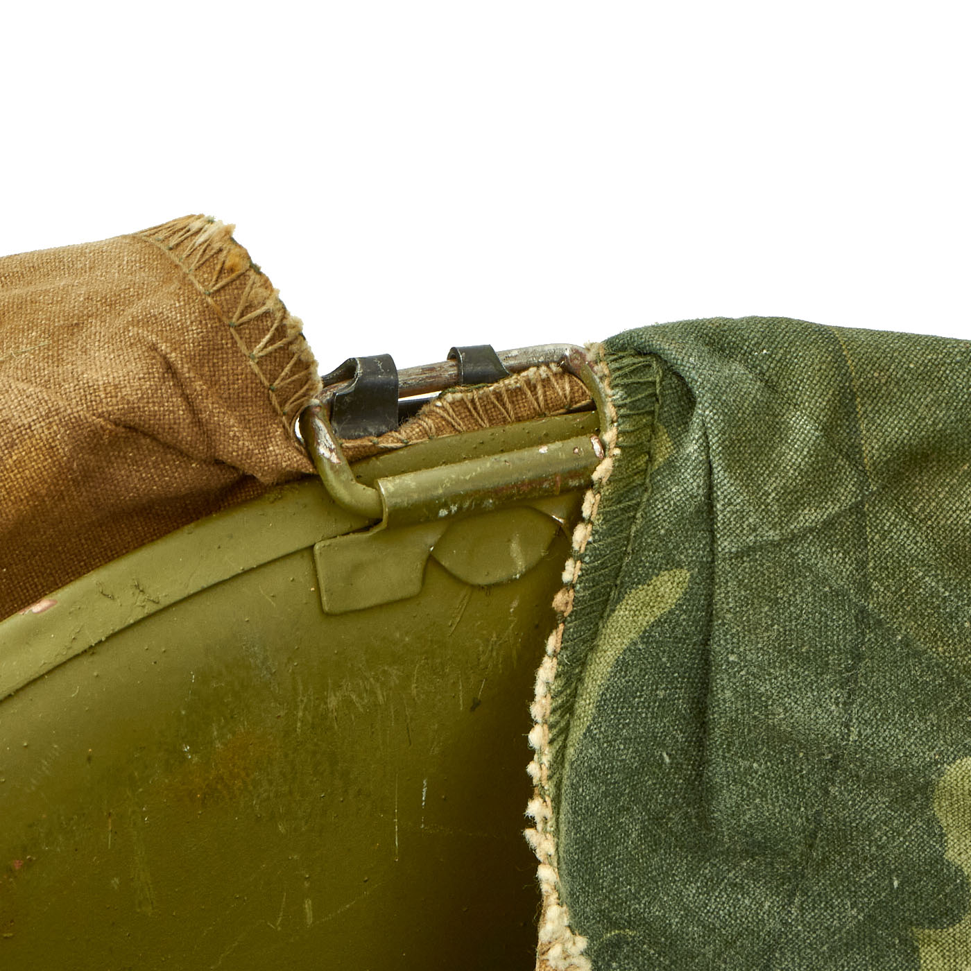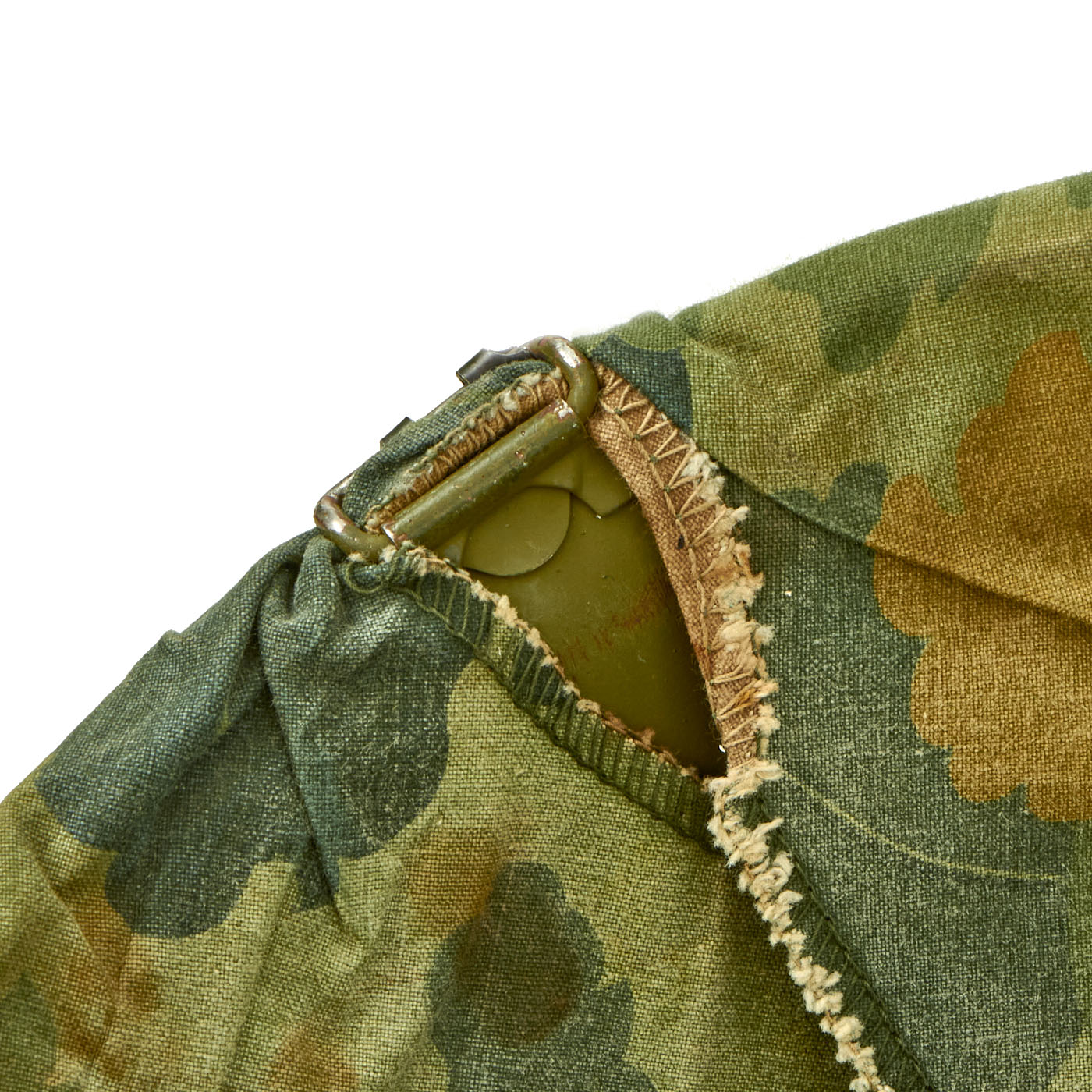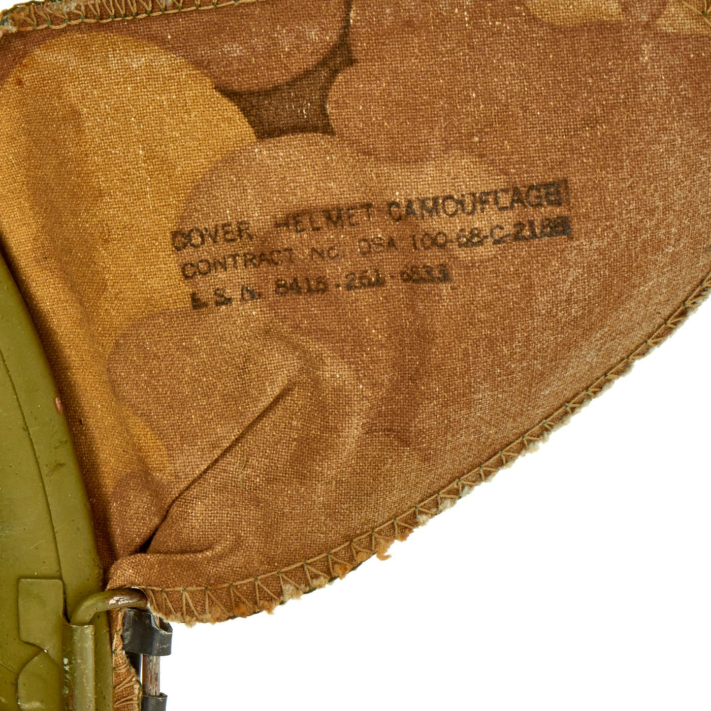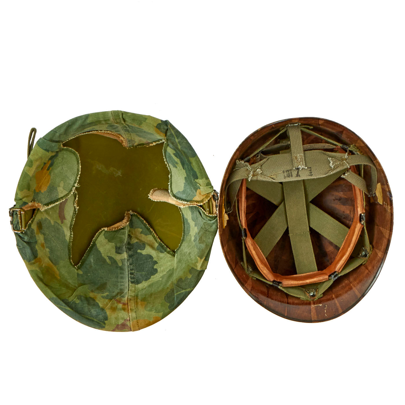 This helmet is a fine example and still retains all of its original Vietnam War parts and the shell has all original corked grain paint. The cover appears to have been removed from the shell, with the cover not molded to the shape and contours of the helmet shell.