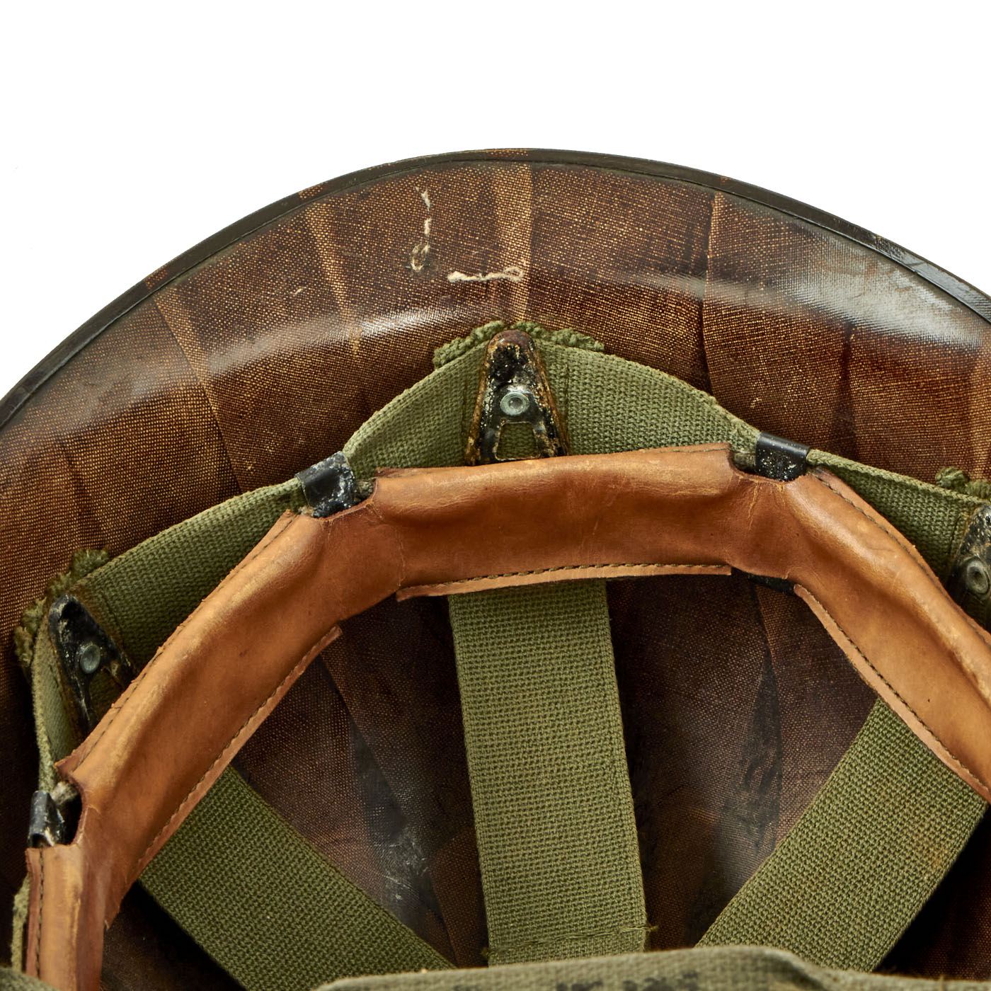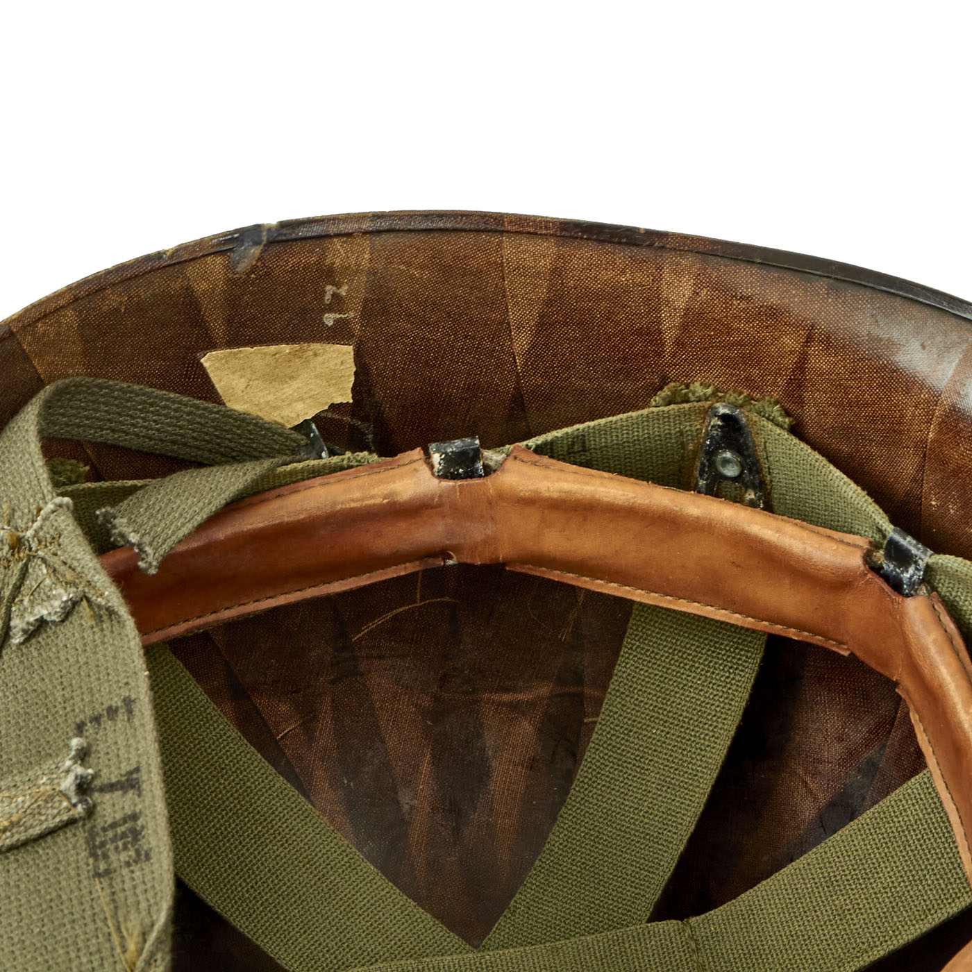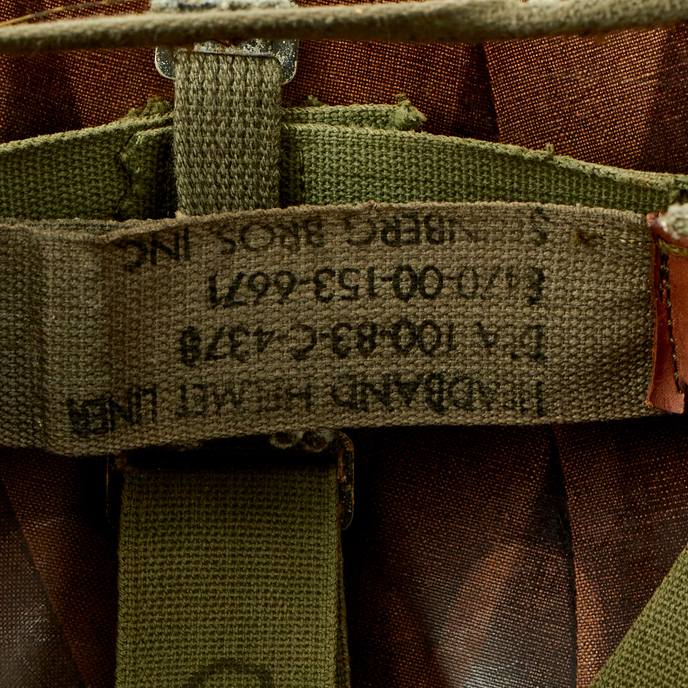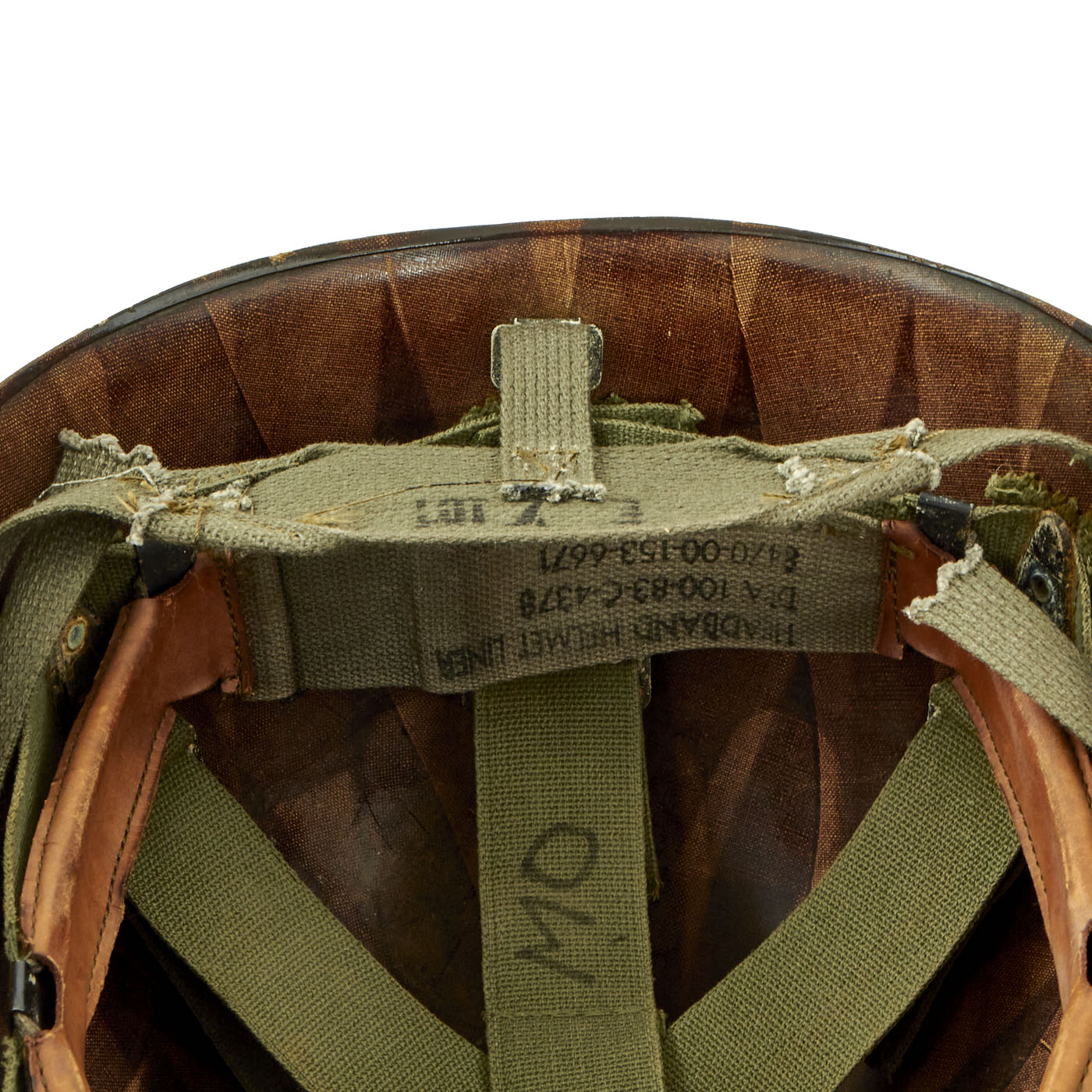 The liner is a correct high pressure 1960s issue liner with a replaced 1983 dated sweatband. The rigging is intact and in great shape, with original markings visible on the sweat band, and just a bit of cracking on the sweat band leather. The rear lower nape strap is present. The liner itself shows honest wear in a hot, humid, environment, but is in good condition overall.