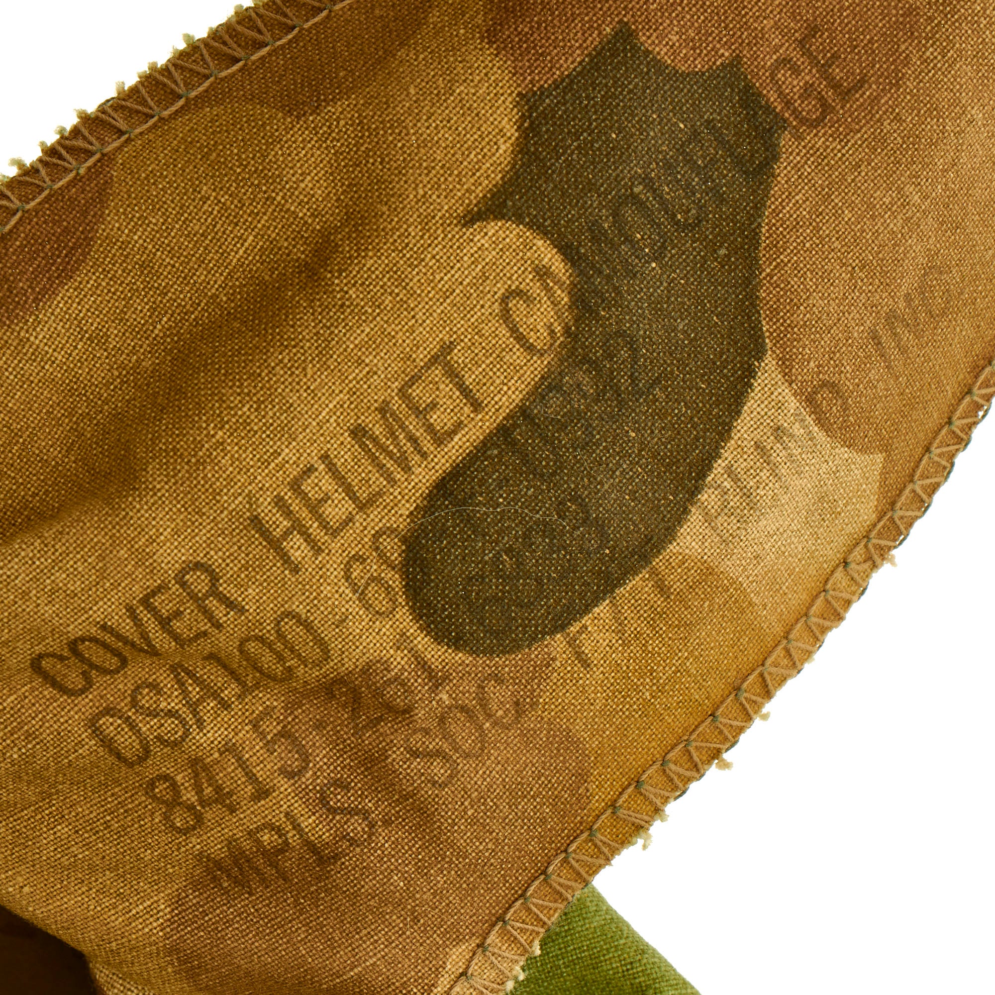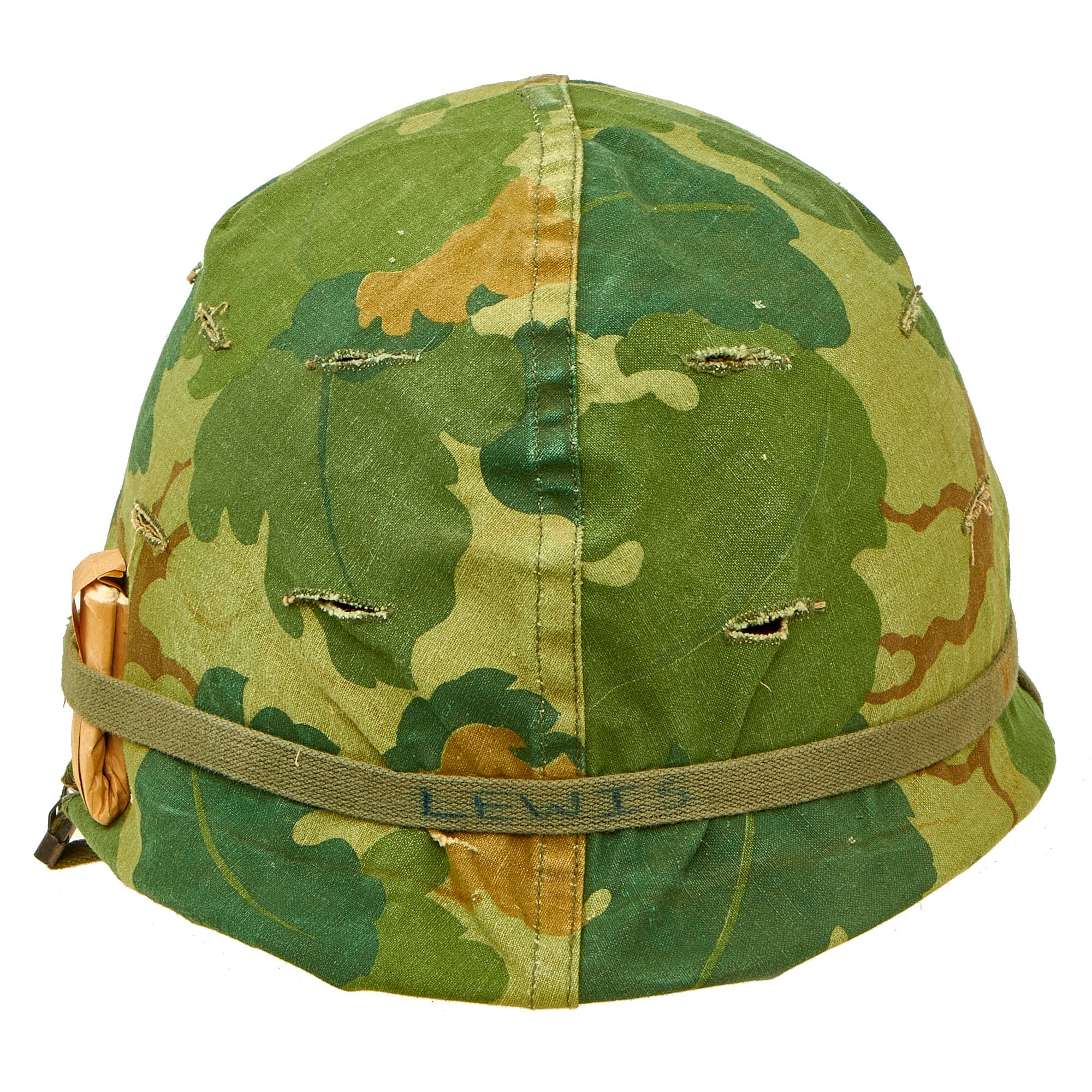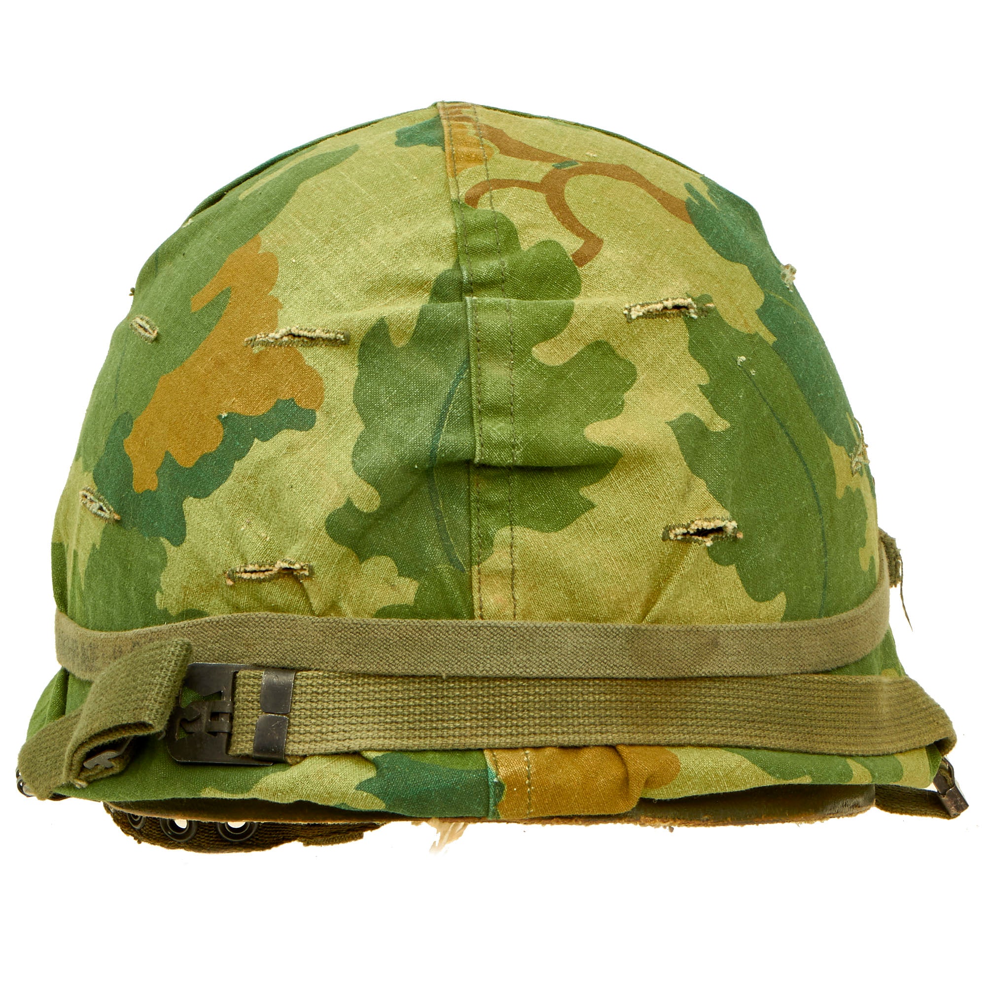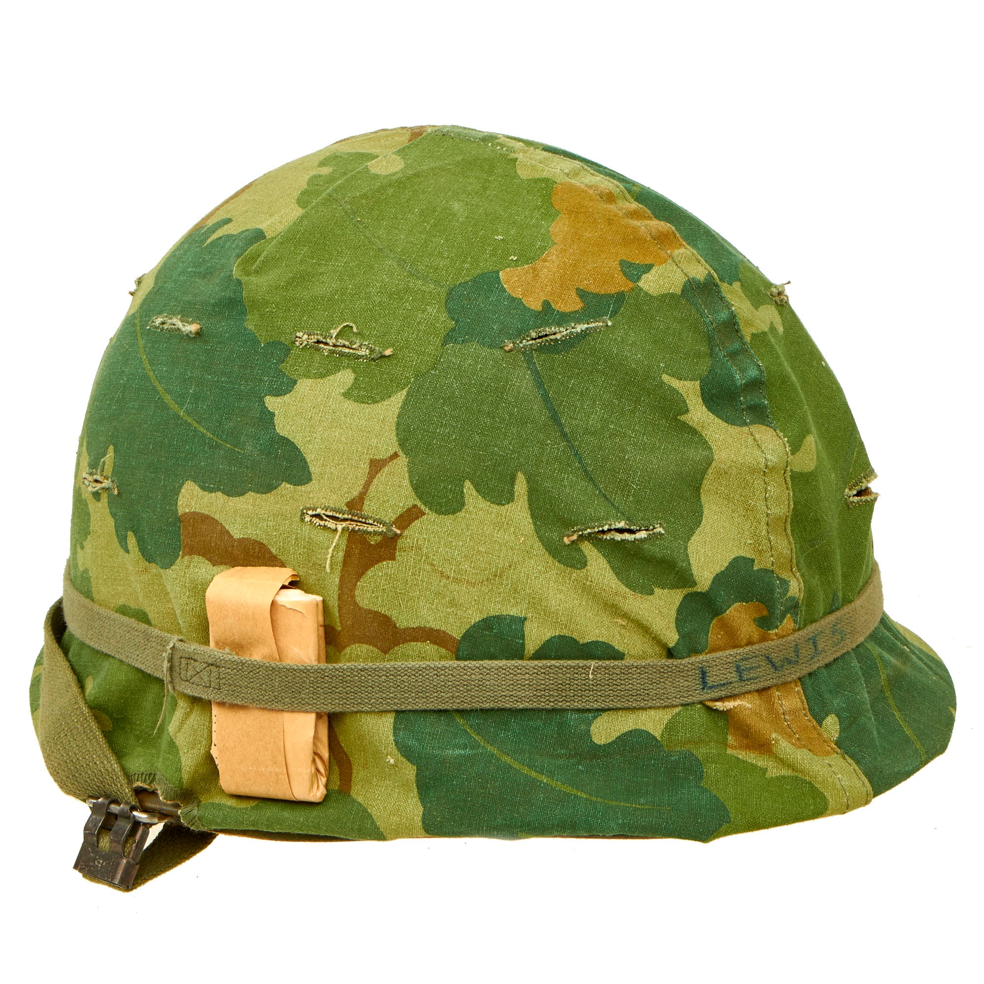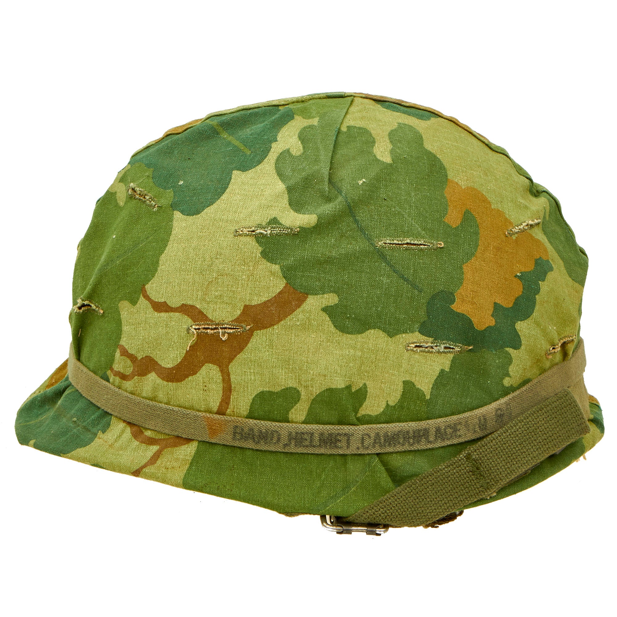 The Mitchell pattern camouflage cover is in good condition and bears an early “FSN” stock number. The cover shows reasonable wear, only from honest use and handling. It comes with an original foliage elastic helmet band that is in excellent condition as well. Tucked in the band is an original pack to ration toilet paper, a common practice by GIs in Vietnam to keep the “moon floss” dry and handy.
