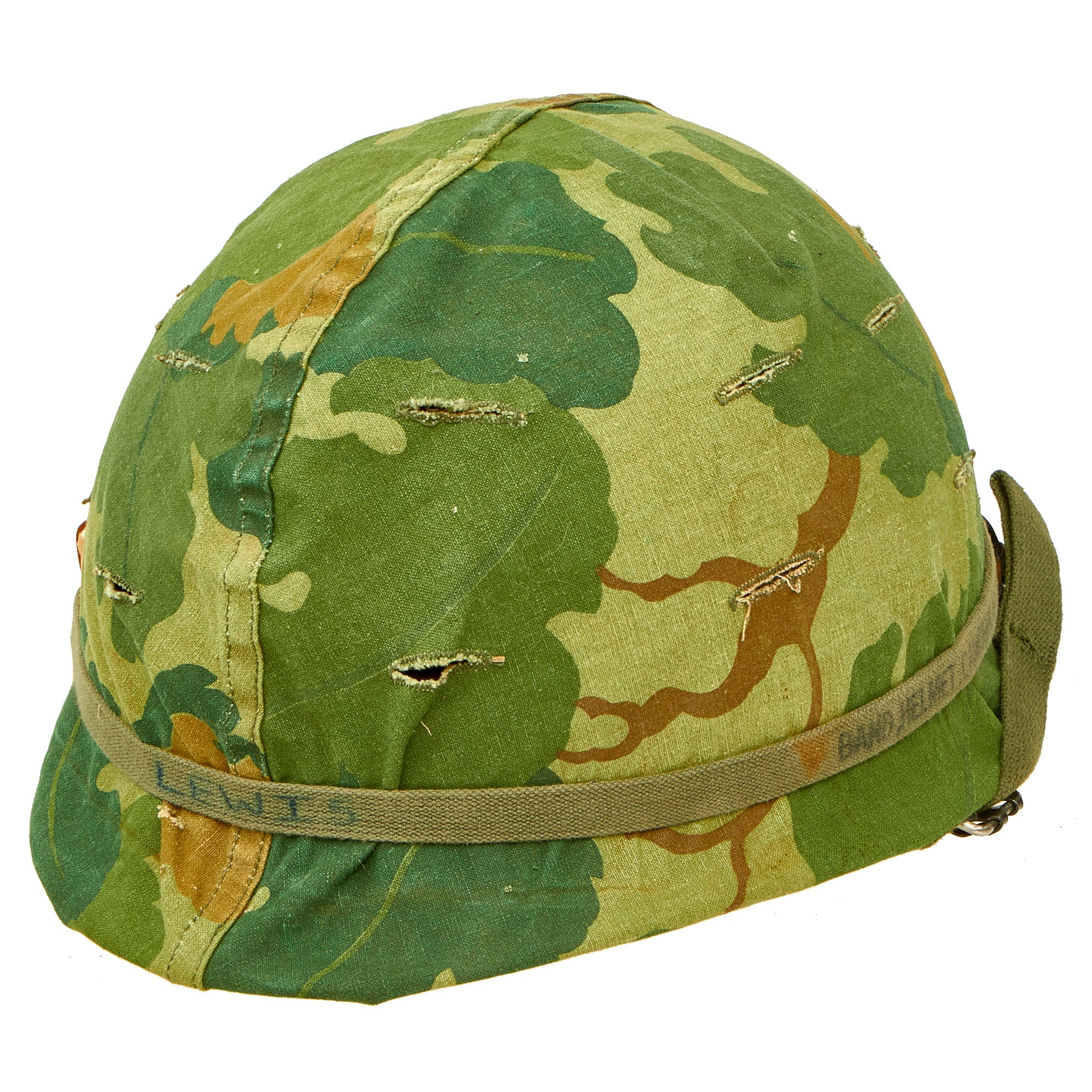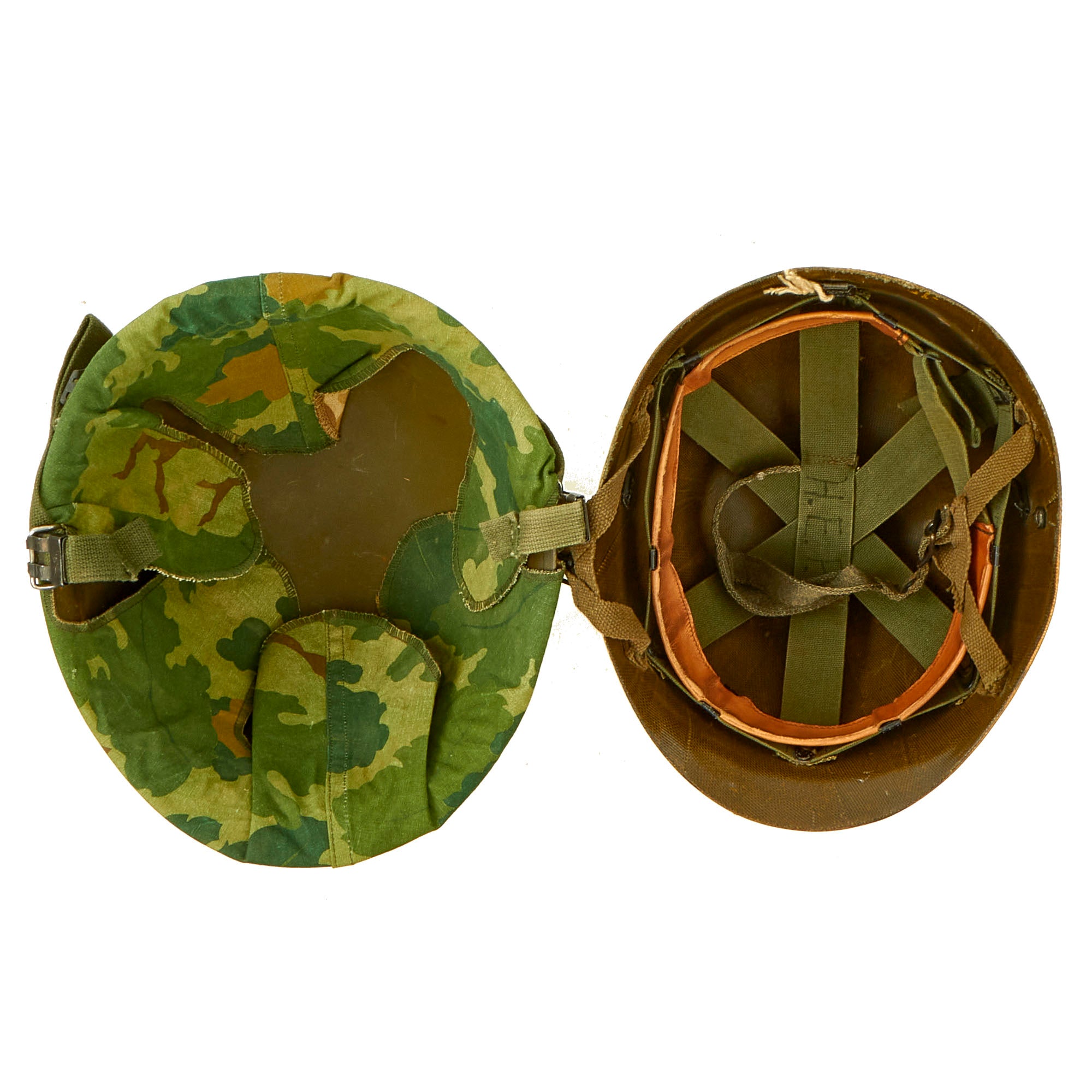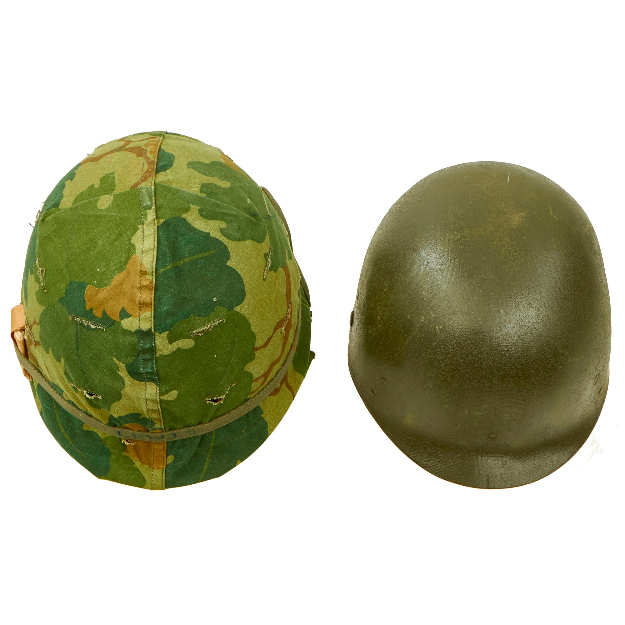 This Vietnam War Helmet M-1. The helmet shell has a set of swivel (movable) chinstrap loops called bales and a stainless steel rim. These rims were both rust resistant and had non-magnetic qualities that reduced the chance of error readings when placed around certain sensitive equipment (such as a compass). The helmet shows signs of being reconditioned in a military depot, which was common during the period for late WWII/Korean War helmets.