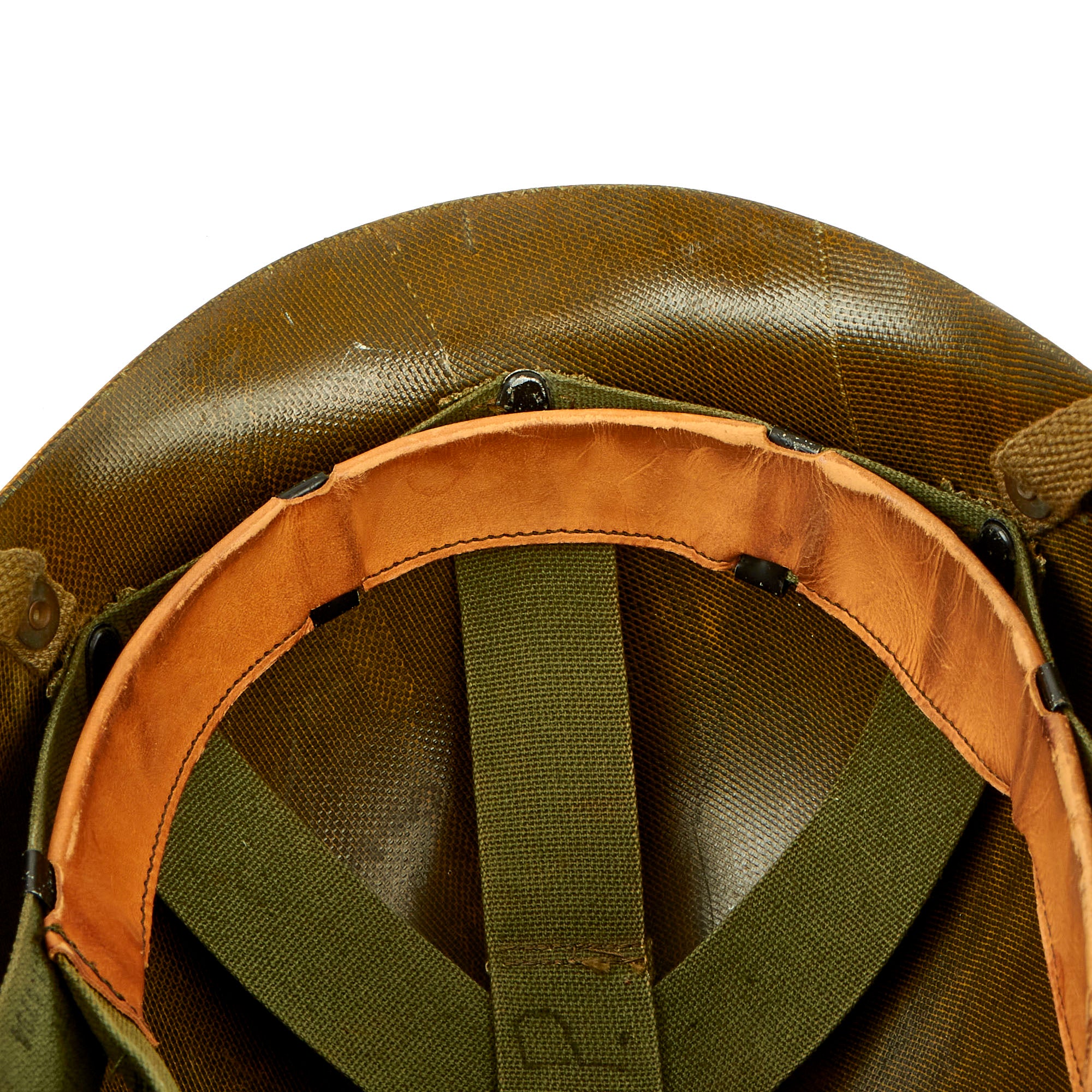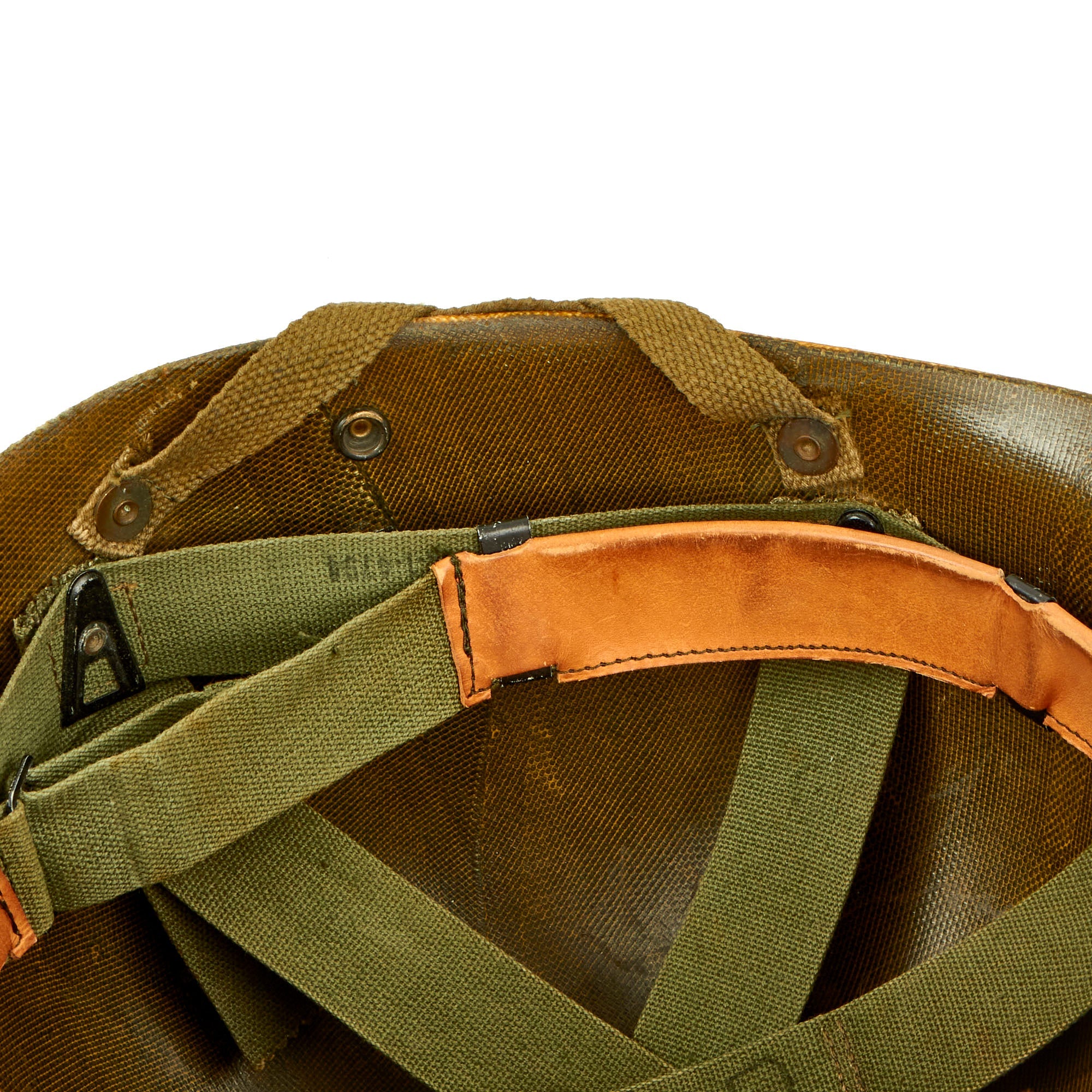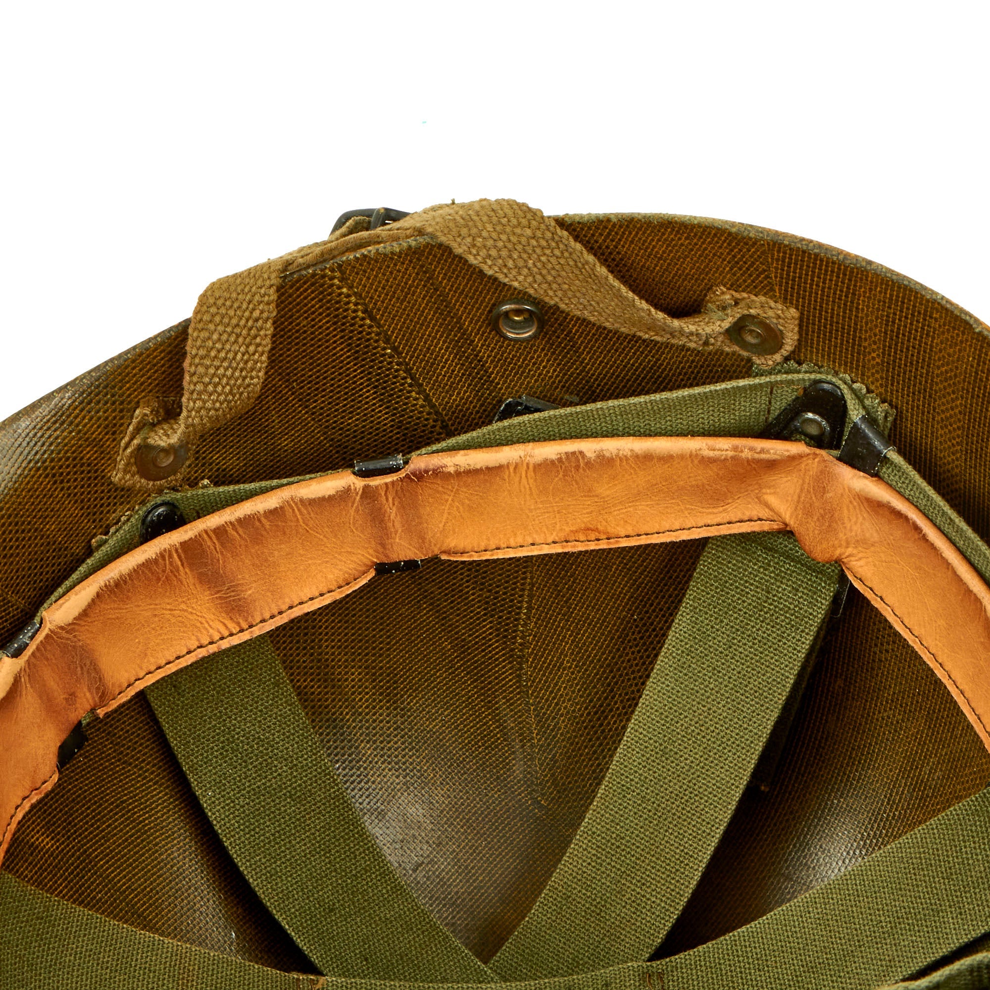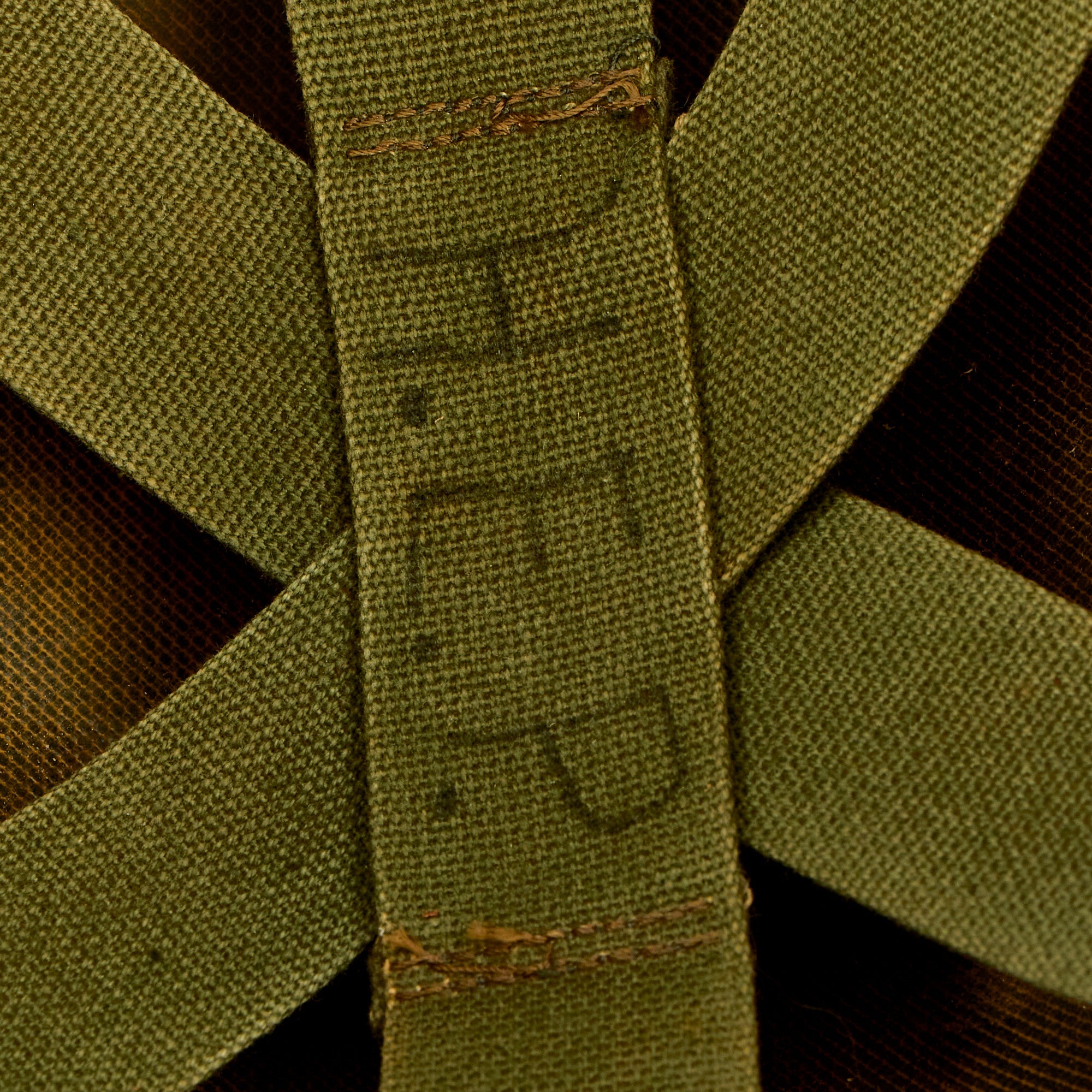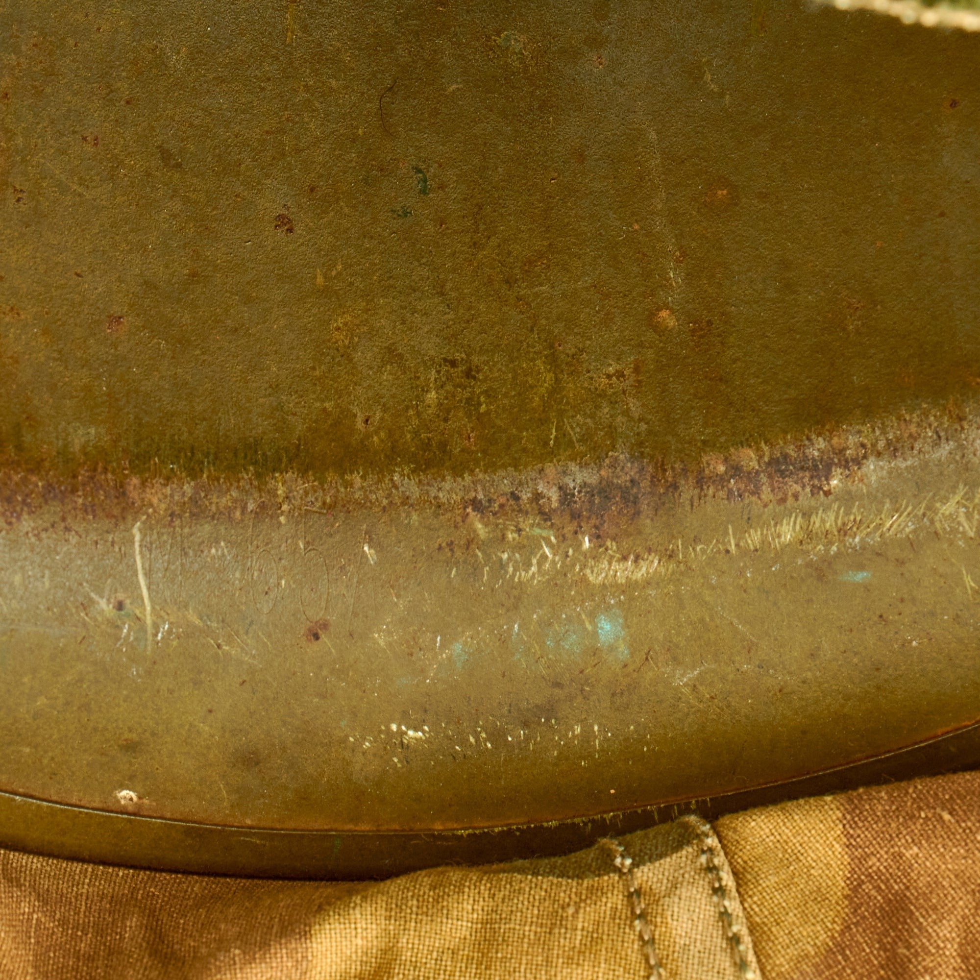 The helmet liner is in decent original condition, showing signs of being worn in a hot humid environment. Markings are present on the liner suspension but are unfortunately illegible. The “U.S.” stamp on the chin strap is still visible as well. The rear nape strap is also intact, although the date is illegible as well.