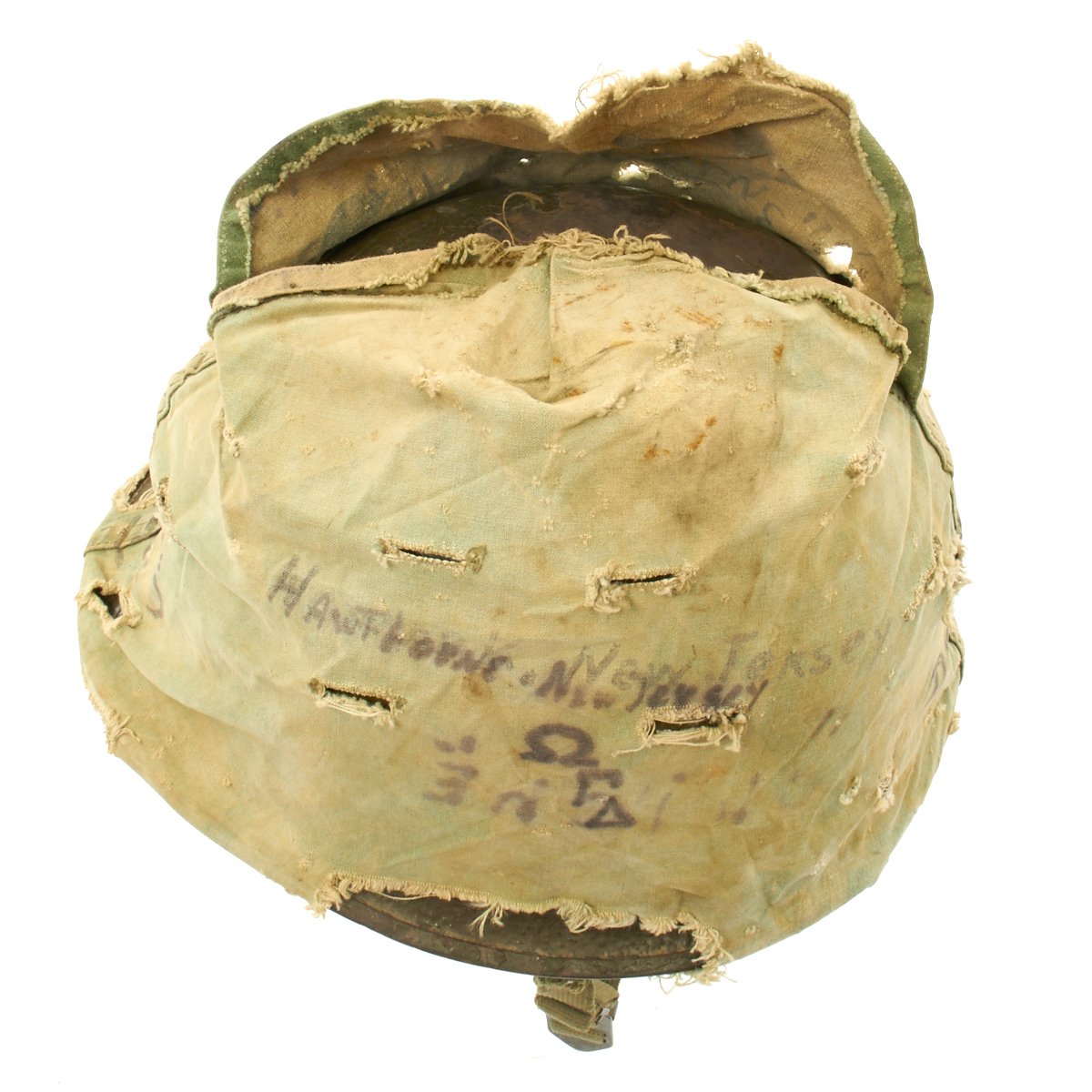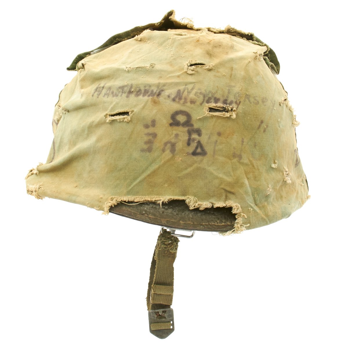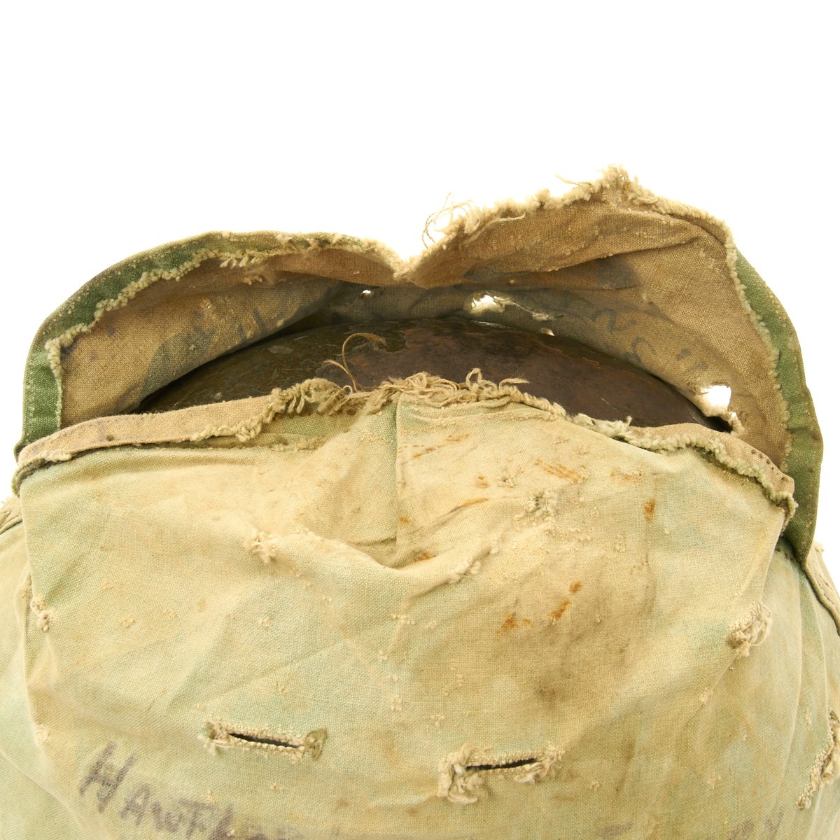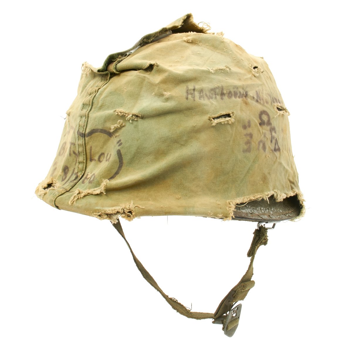 The liner is correct high pressure 1960s issue liner marked M14. The the rigging is intact and in great shape, with original markings visible on the sweat band, and just a bit of cracking on the sweat band leather. The helmet liner does not have the extra rear liner support sometimes seen. The shell chin strap is original, and the USMC cover is original and in fair condition. It has stains, fading, small holes around the edge and split in the center. Of note is the writing on the cover which includes: