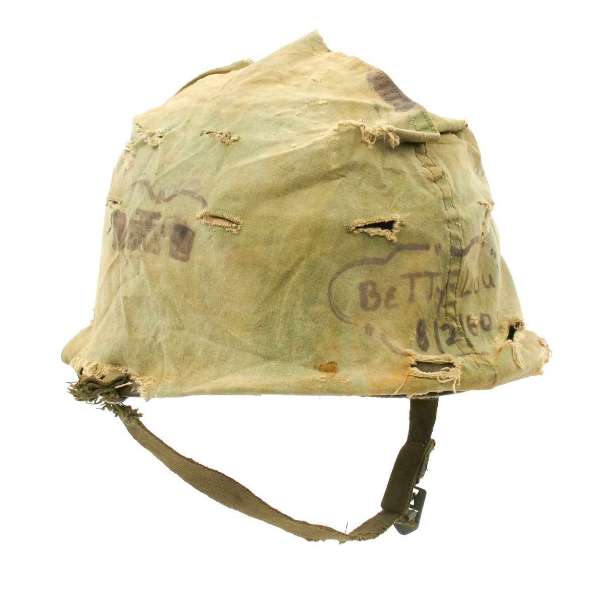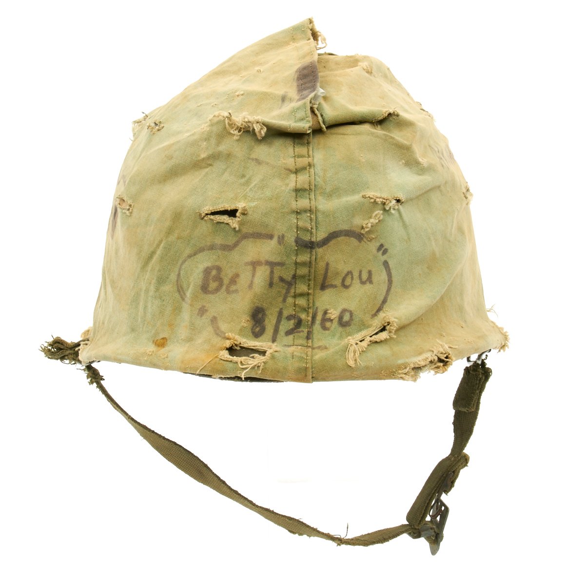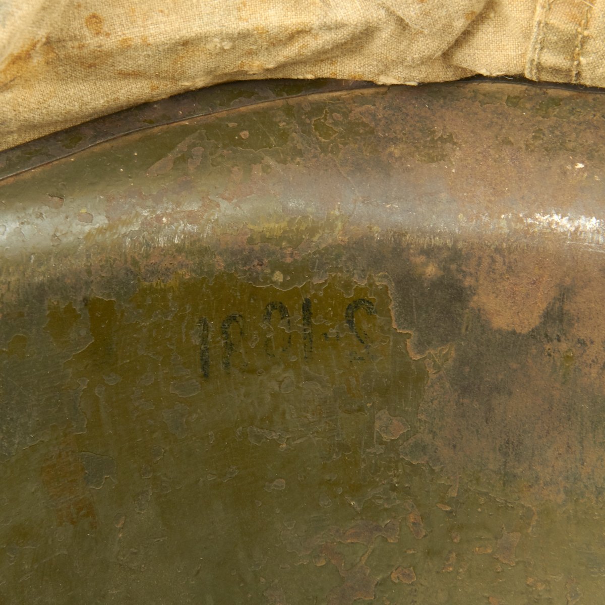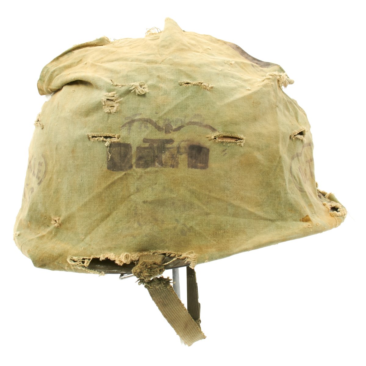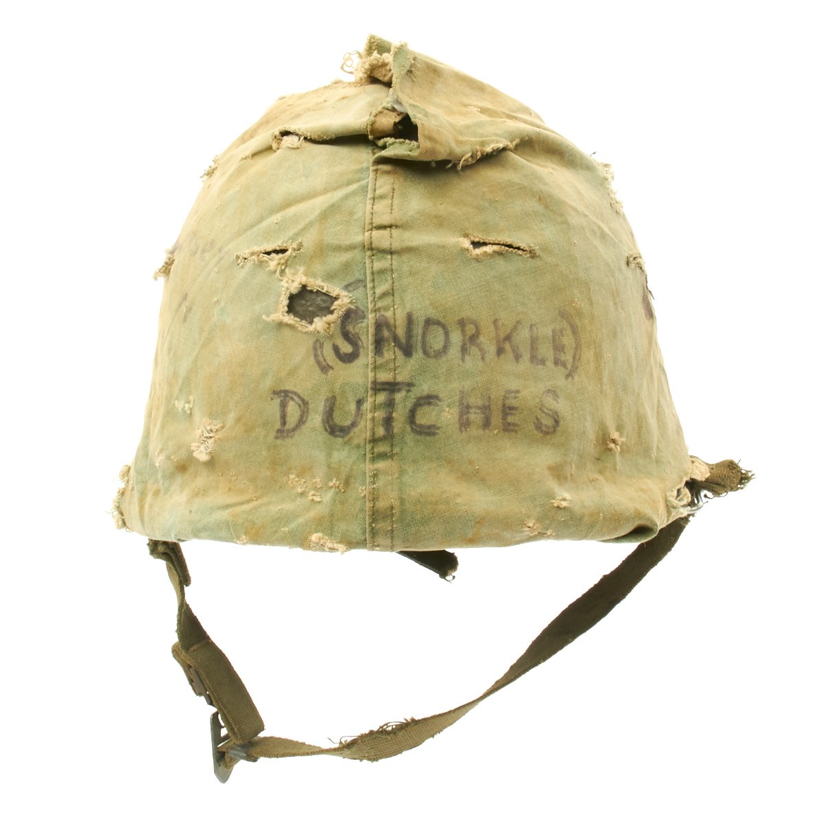 The liner is correct high pressure 1960s issue liner marked M14. The the rigging is intact and in great shape, with original markings visible on the sweat band, and just a bit of cracking on the sweat band leather. The helmet liner does not have the extra rear liner support sometimes seen. The shell chin strap is original, and the USMC cover is original and in fair condition. It has stains, fading, small holes around the edge and split in the center. Of note is the writing on the cover which includes: