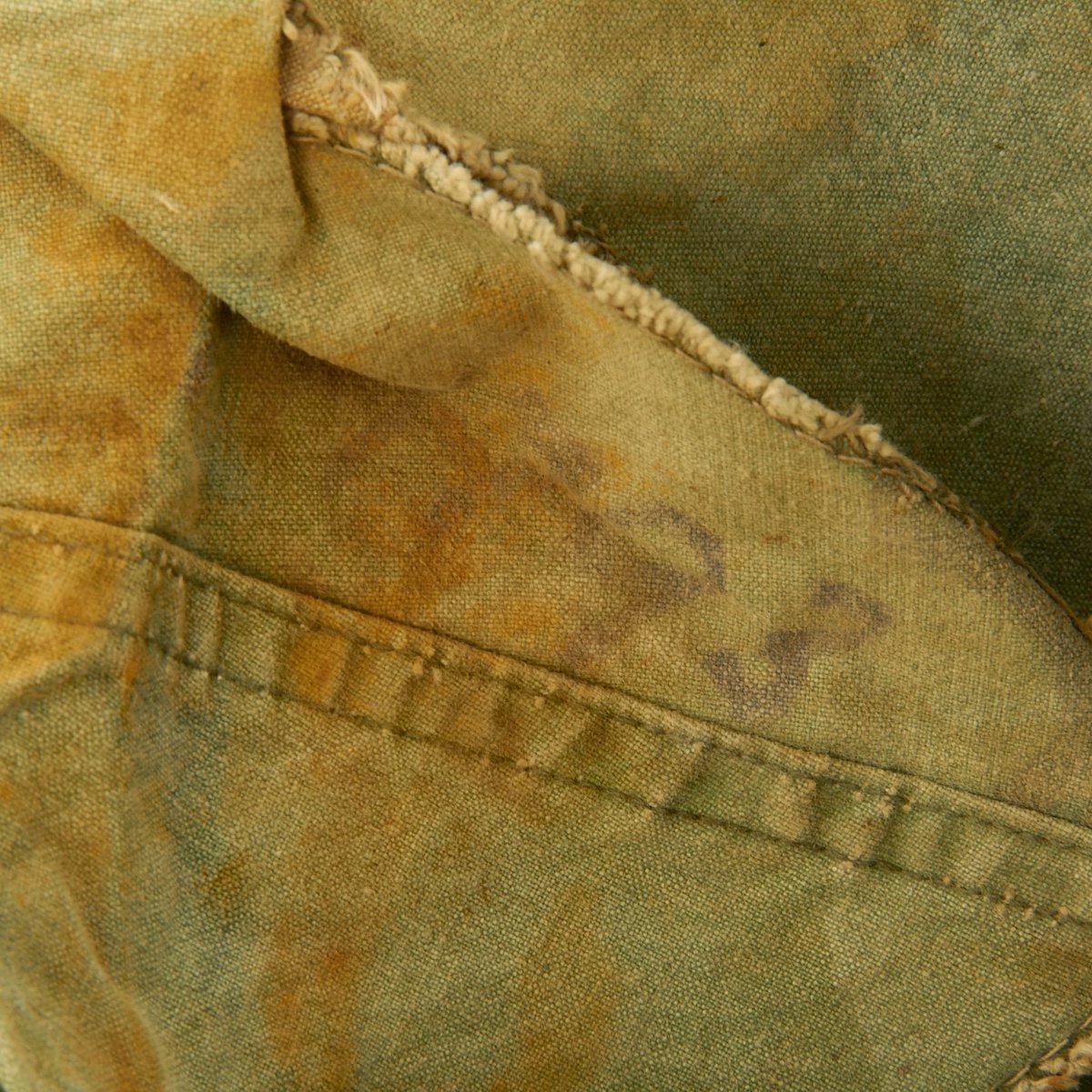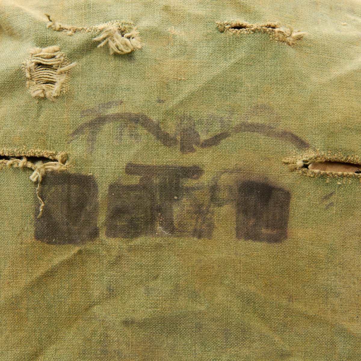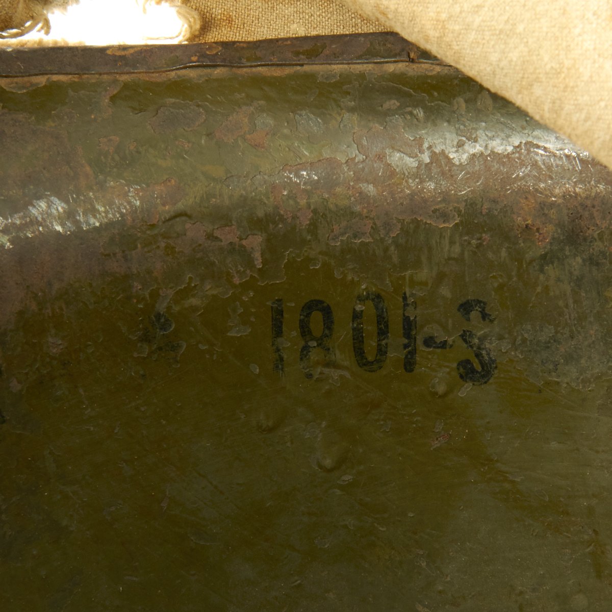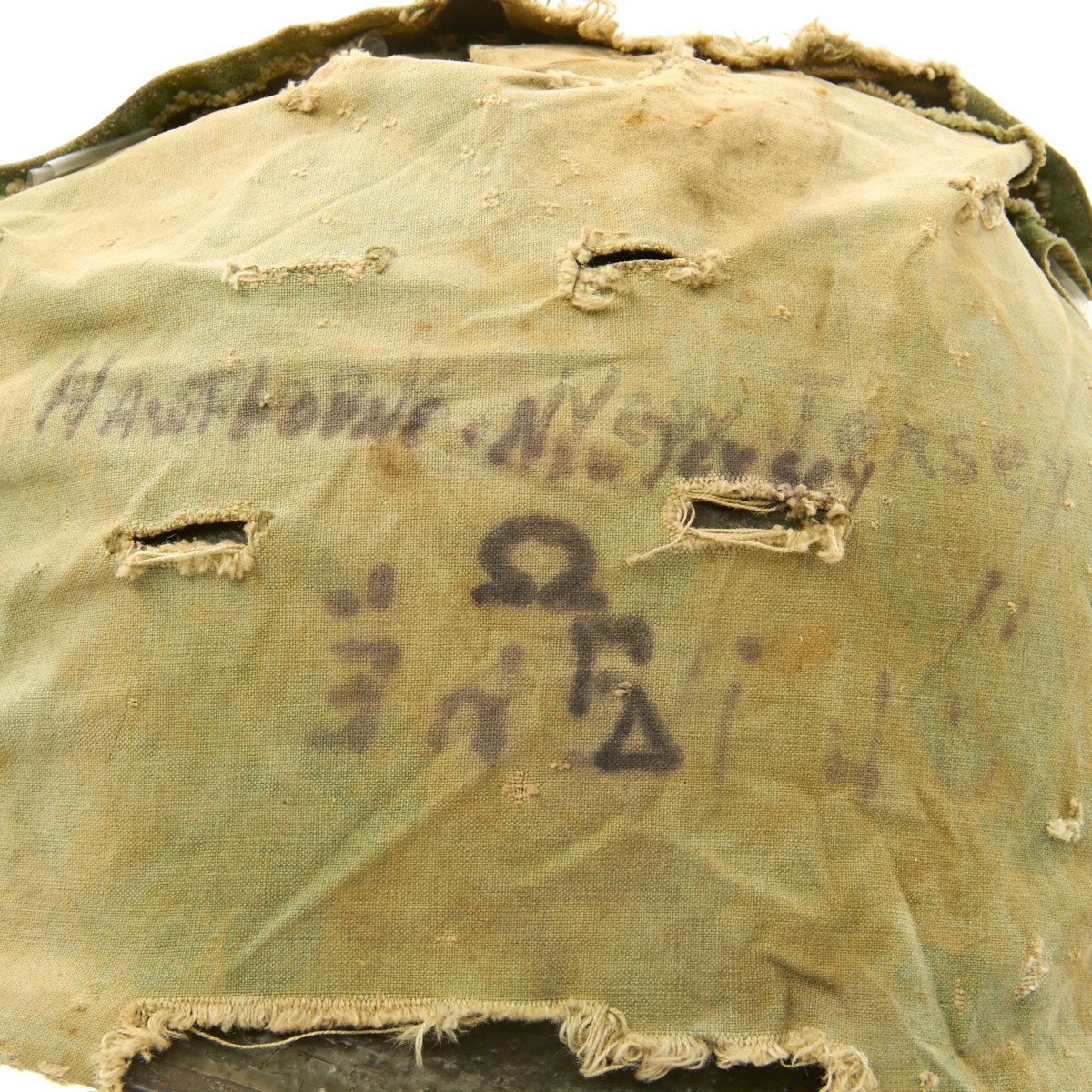 The liner is correct high pressure 1960s issue liner marked M14. The the rigging is intact and in great shape, with original markings visible on the sweat band, and just a bit of cracking on the sweat band leather. The helmet liner does not have the extra rear liner support sometimes seen. The shell chin strap is original, and the USMC cover is original and in fair condition. It has stains, fading, small holes around the edge and split in the center. Of note is the writing on the cover which includes: