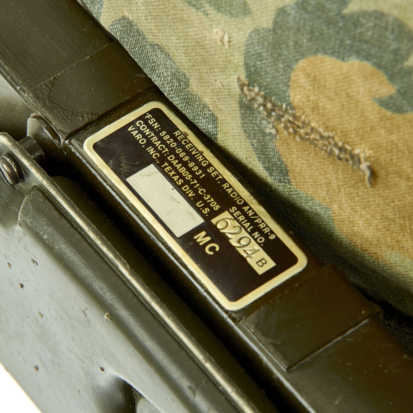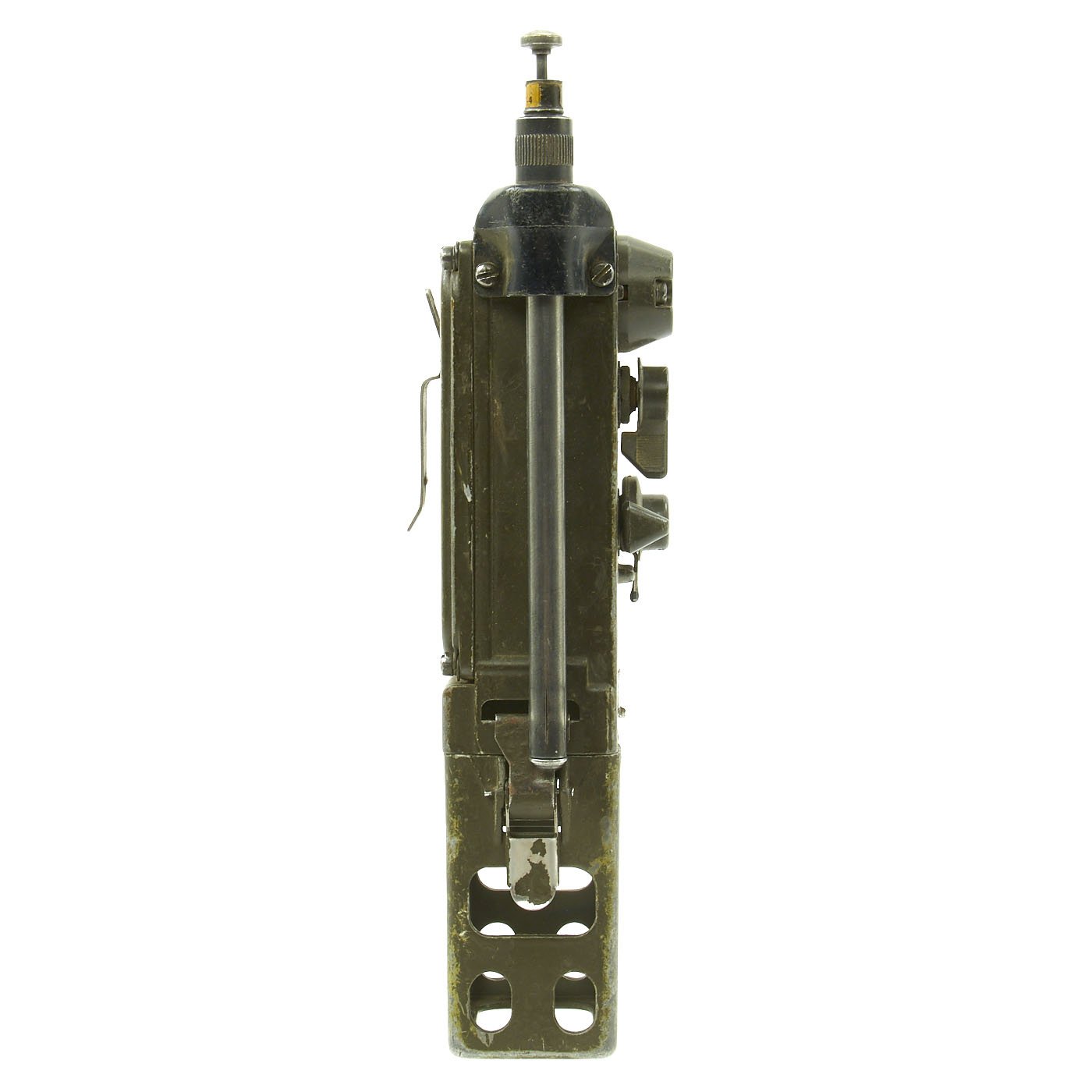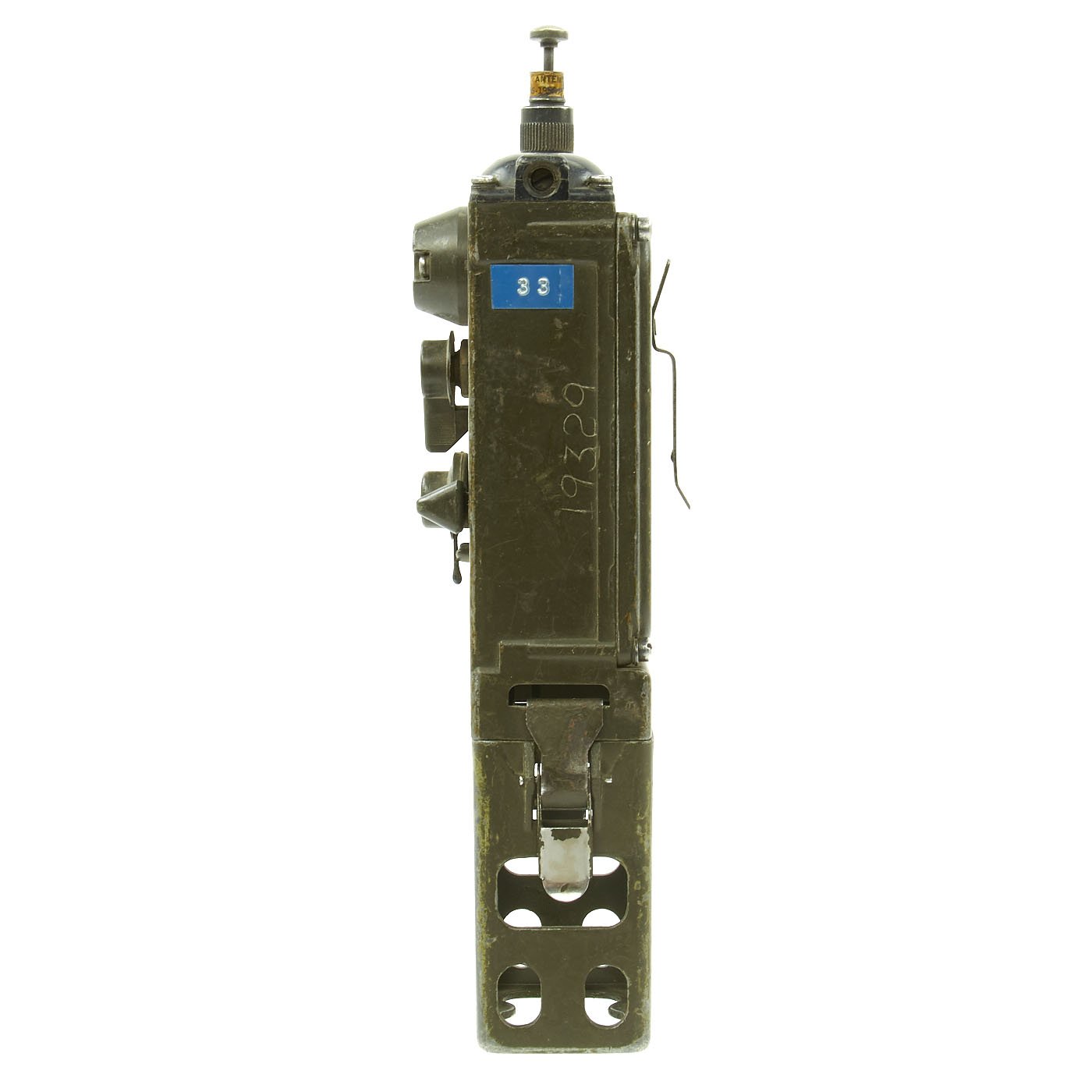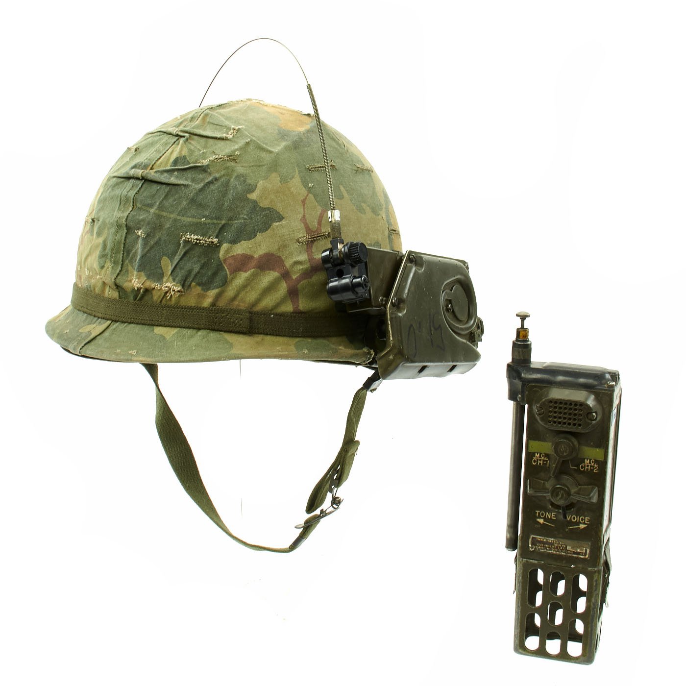 Also included is a genuine Vietnam War Era issue AN/PRR-9 radio receiver already mounted to the helmet offered in very good condition. It has not been tested for functionality but appears complete and undamaged. These receivers were intended to work with the PRT-4 squad radio transmitter. They were intended to replaced the bulky PRC-6, which had been in use since the Korean war. Also included is a transmitter AN/PRT-4A which carried in the hand or on the belt. It is missing the battery.