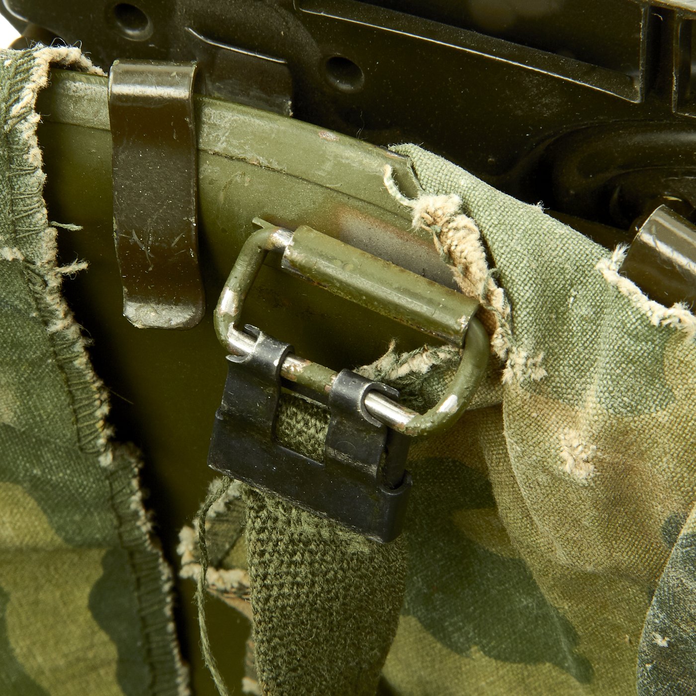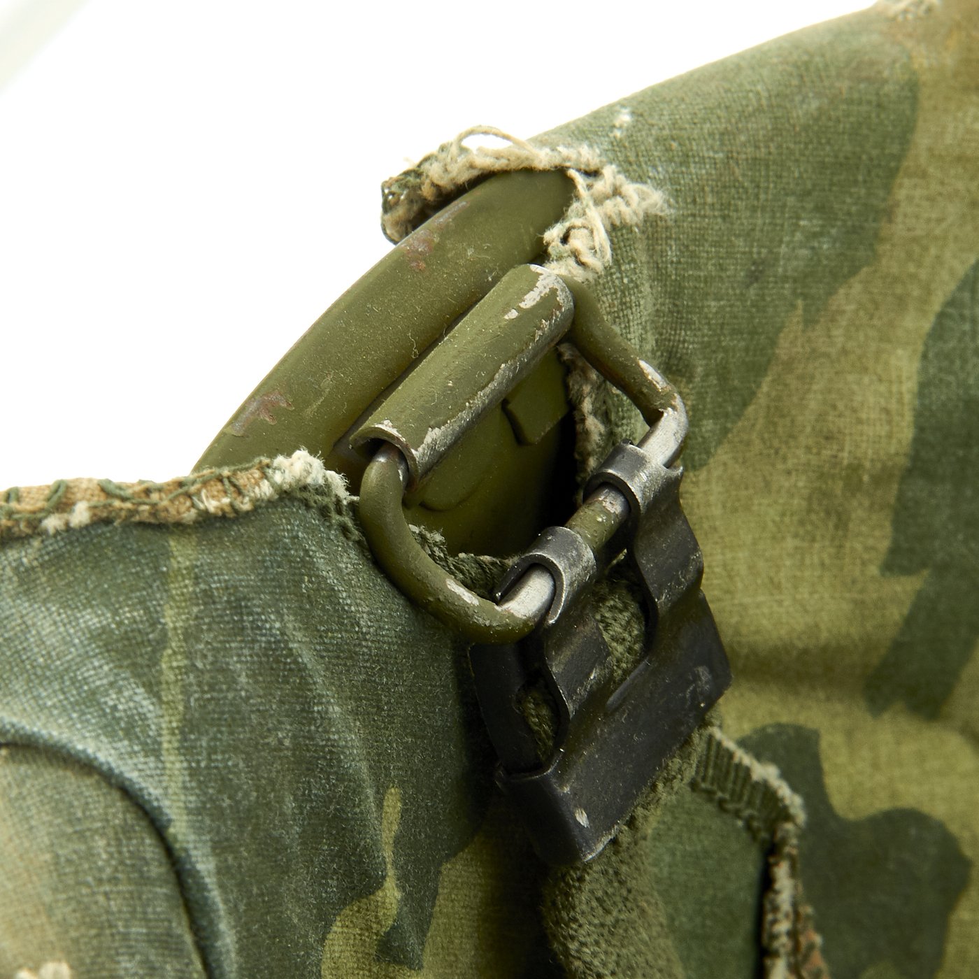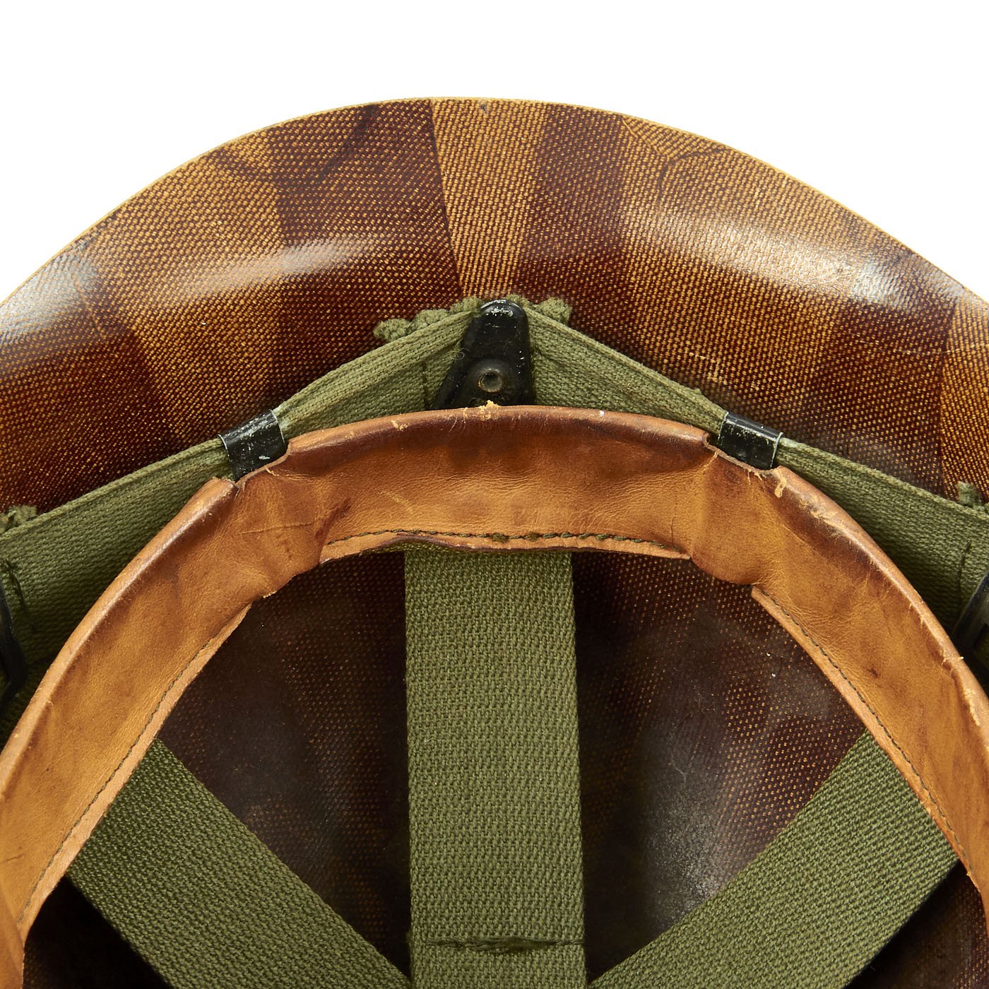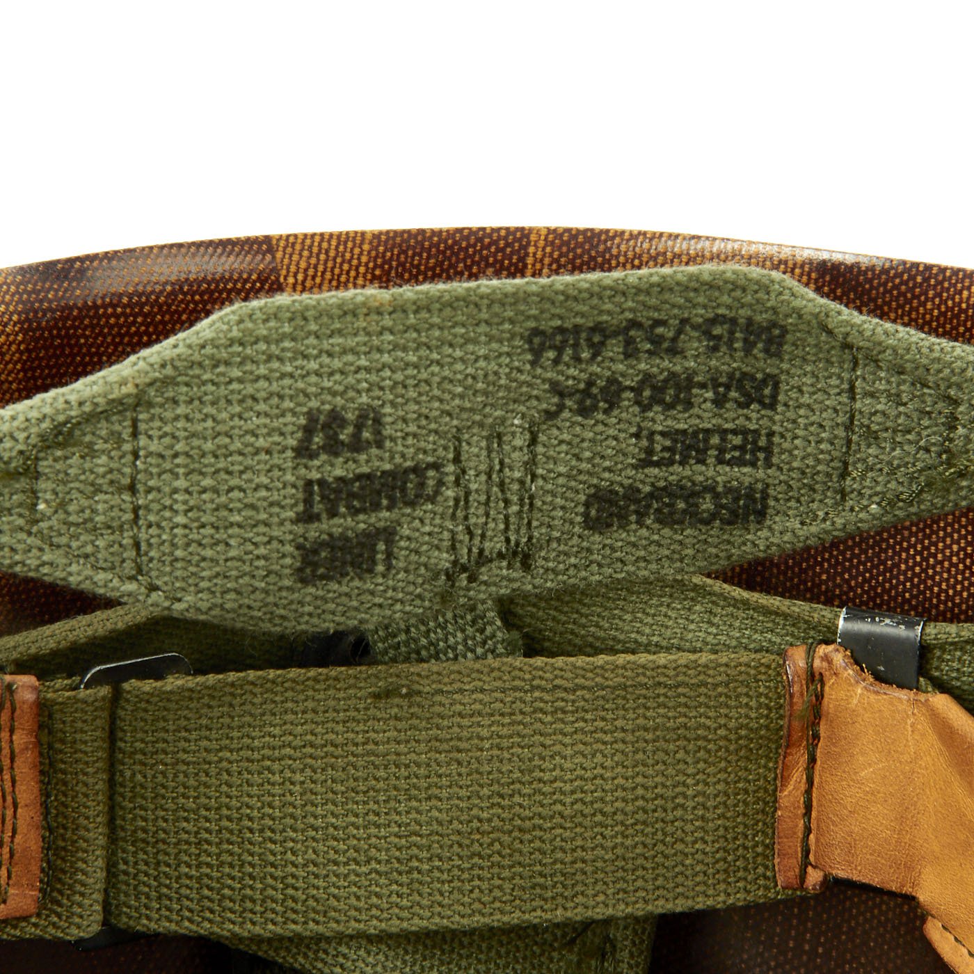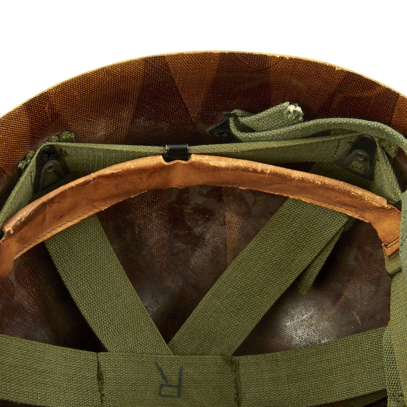 The liner is correct high pressure 1960s issue liner. The the rigging is intact and in great shape, with nice sweat band. The USMC Mitchell Pattern cover is original and in very good condition. It has some stains and small holes around the edge, but is definitely solid. It is marked on the underside of one of the flaps:
