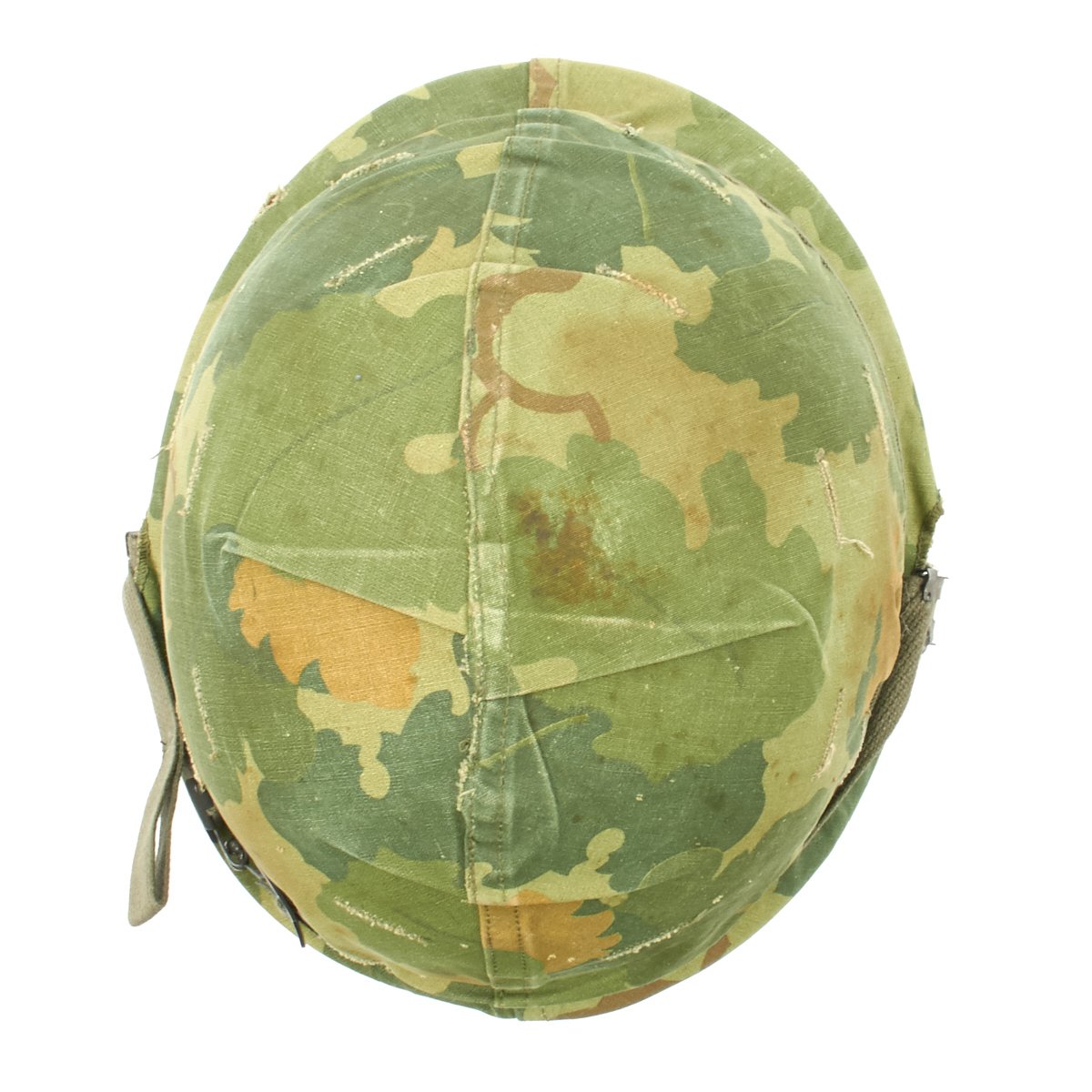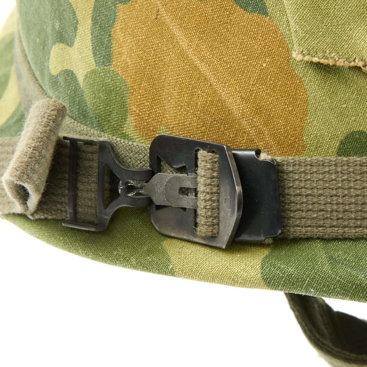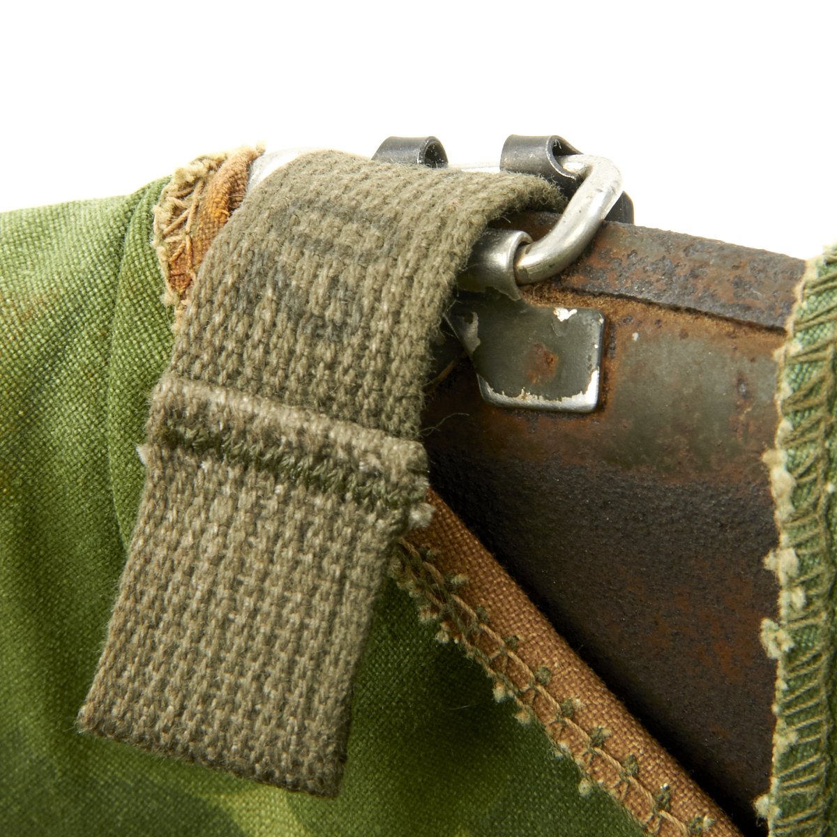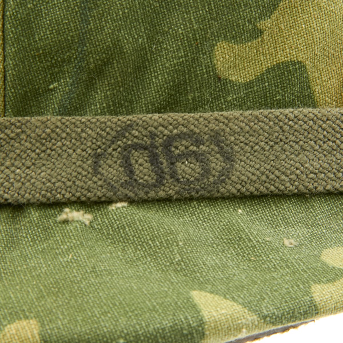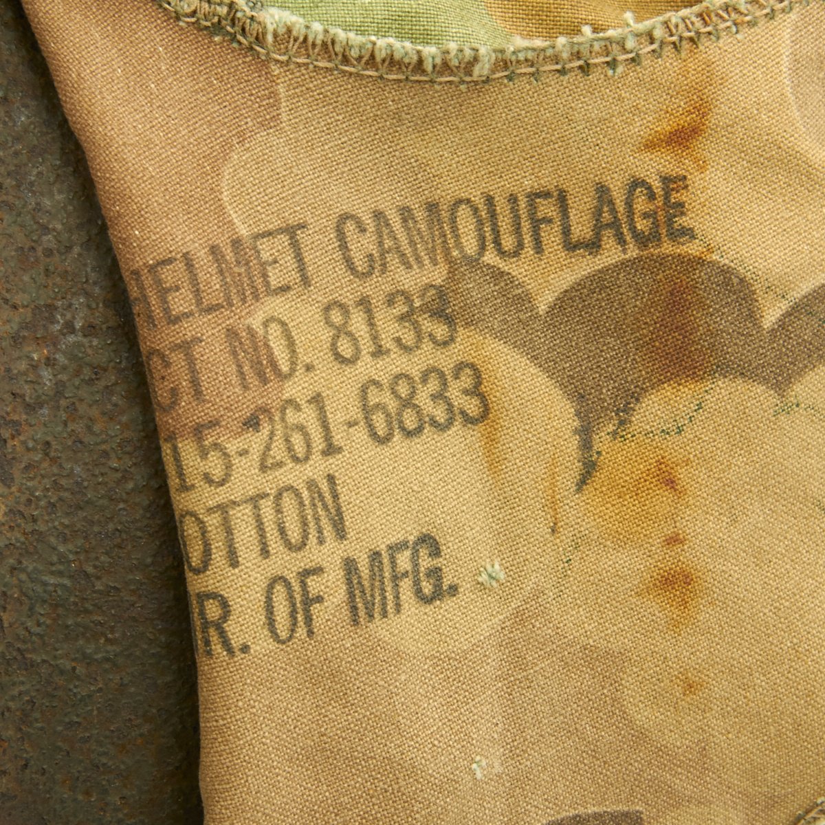 The USMC reversible camouflage cover is original and in very good condition. It has some stains and small holes, but is definitely solid. It also has slots for insertion of branches, twigs, and other items to increase the camouflage ability. It is marked on the underside of one of the flaps: