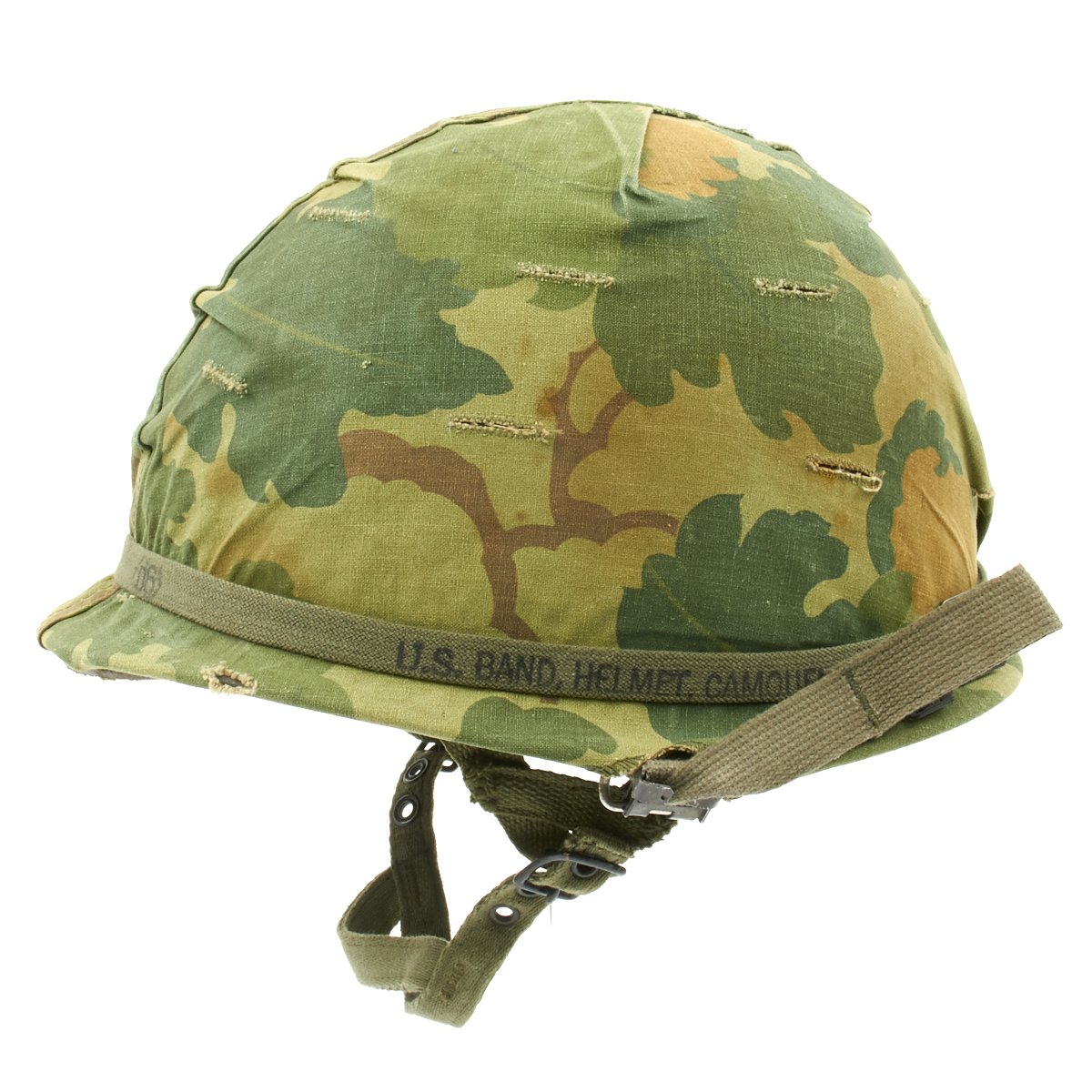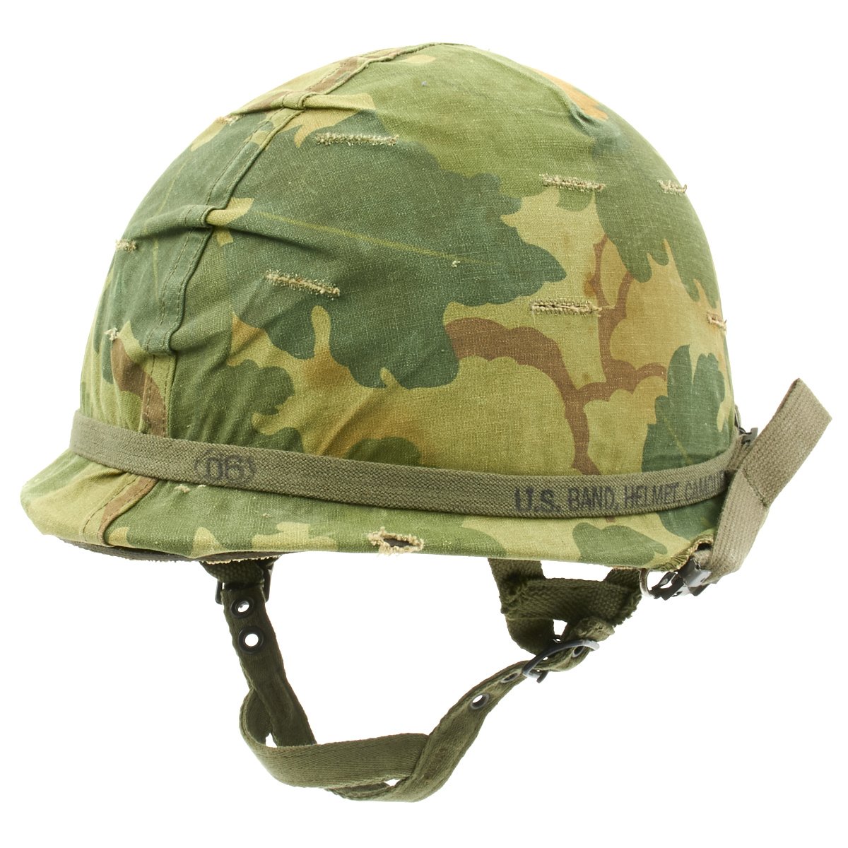 The cover is held in place by a marked U.S. BAND CAMOUFLAGE OD elastic helmet band.