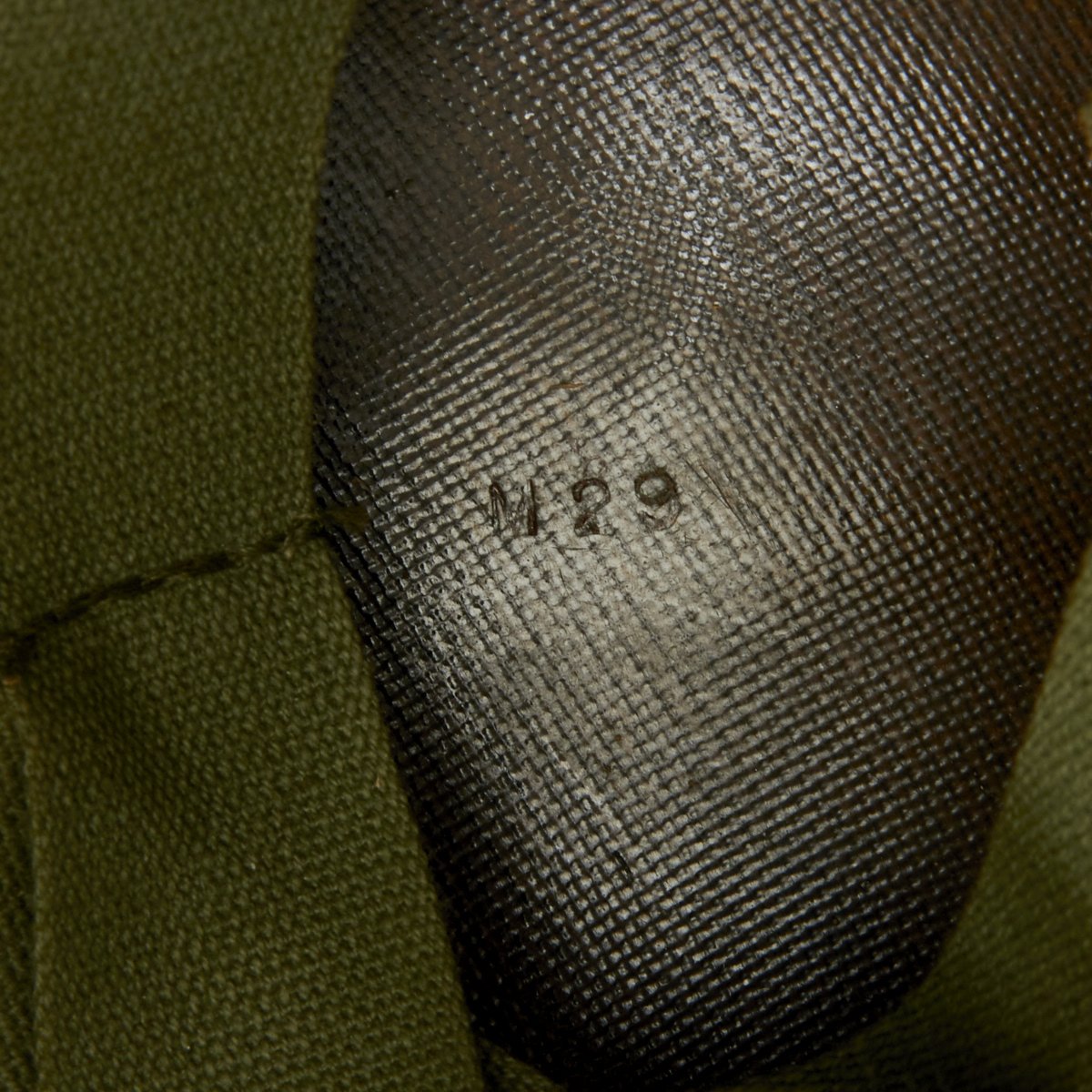 The liner is correct high pressure 1960s issue liner, with the standard markings for the period: M29. The paratrooper rigging is intact and in great shape, with original markings visible on the back of many of the web components. They are a bit unclear from use and age, but all the components are solid. It has both the rear support as well as the paratrooper chin strap, which is in addition to the standard chin strap. The regular chin strap also has extensions with snaps on the end, which secure the liner to the shell for paratrooper use.