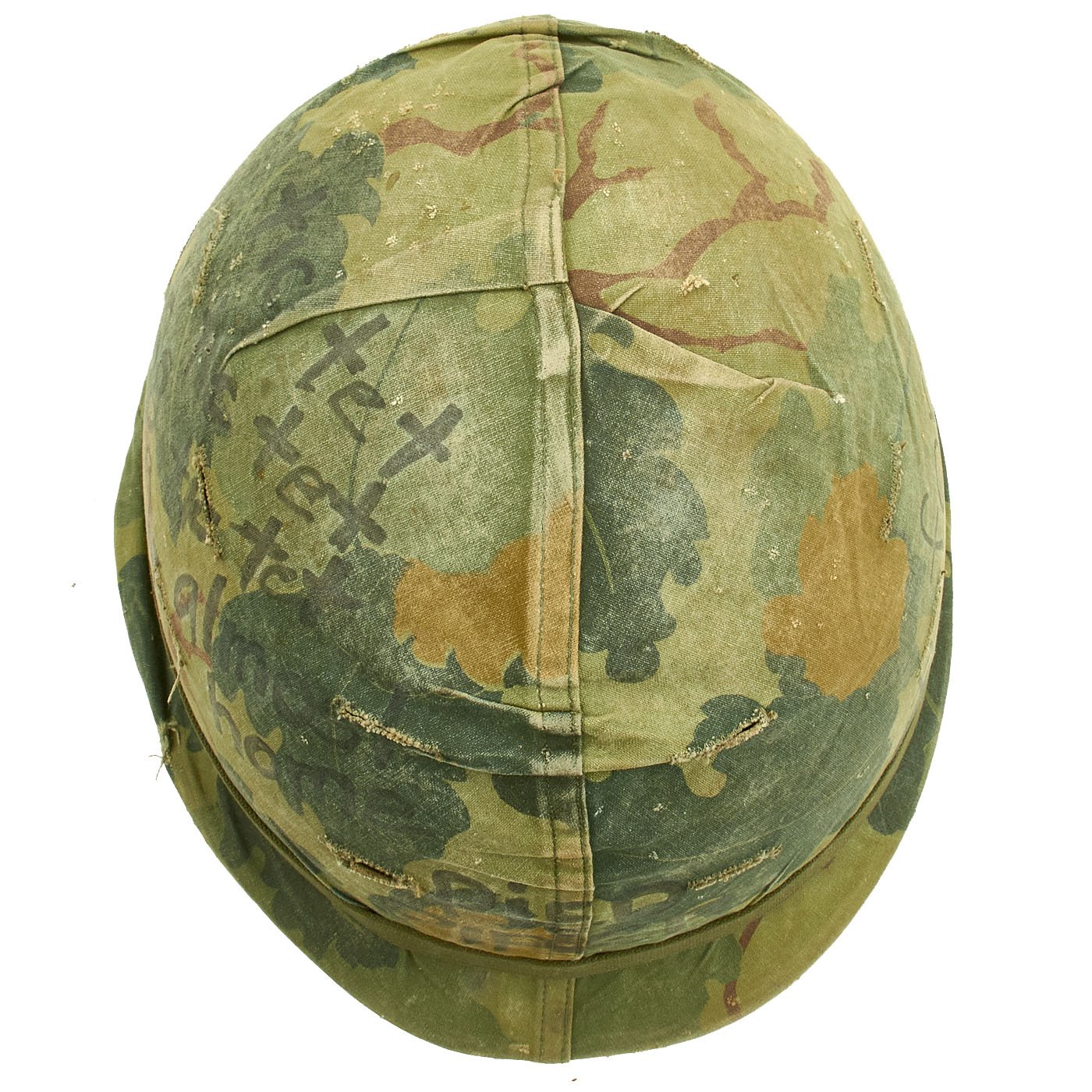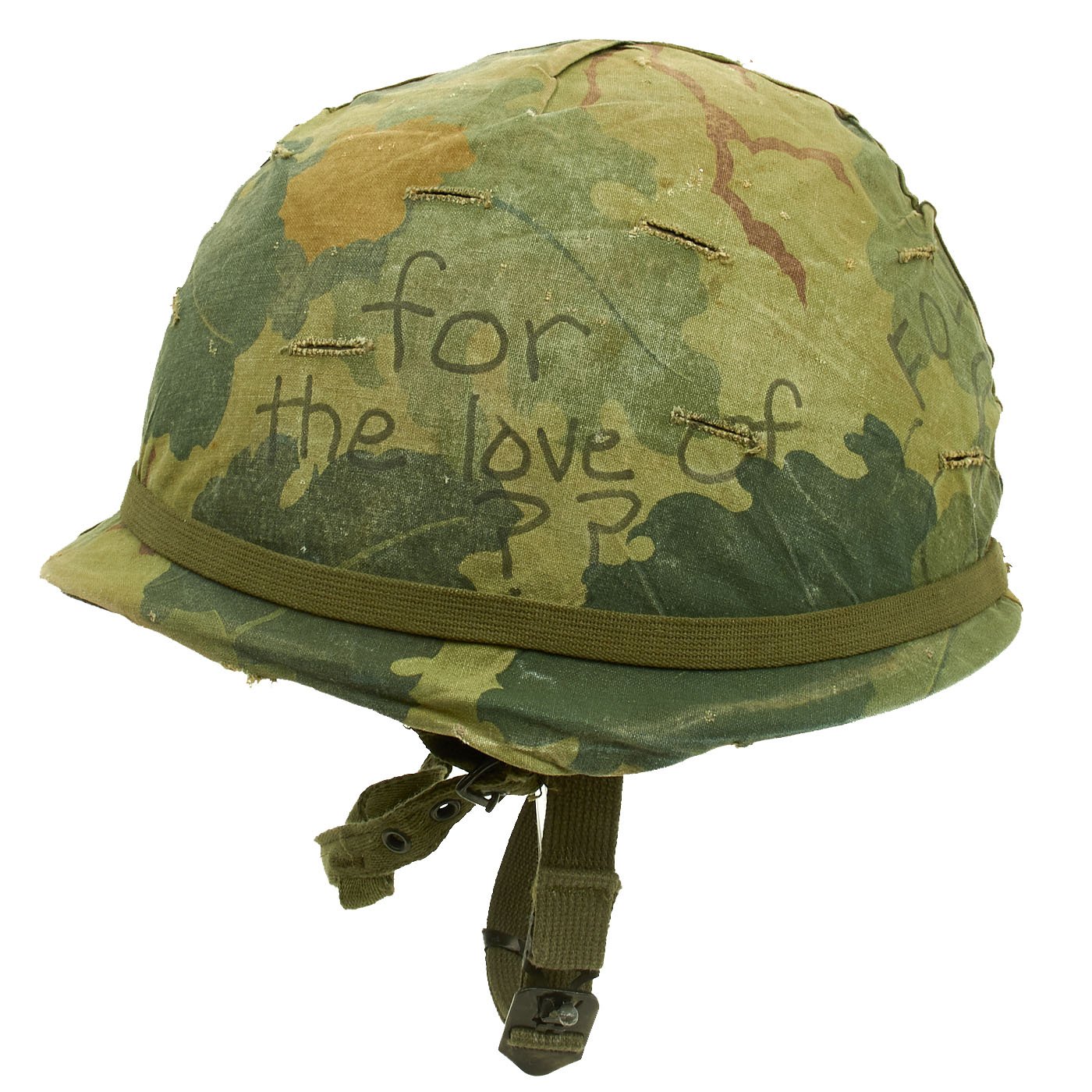 This helmet is a fine example and still retains all of its original Vietnam War parts and the shell has the original dark OD Green finish. The helmet cover is marked up with multiple phrases and expressions which include: