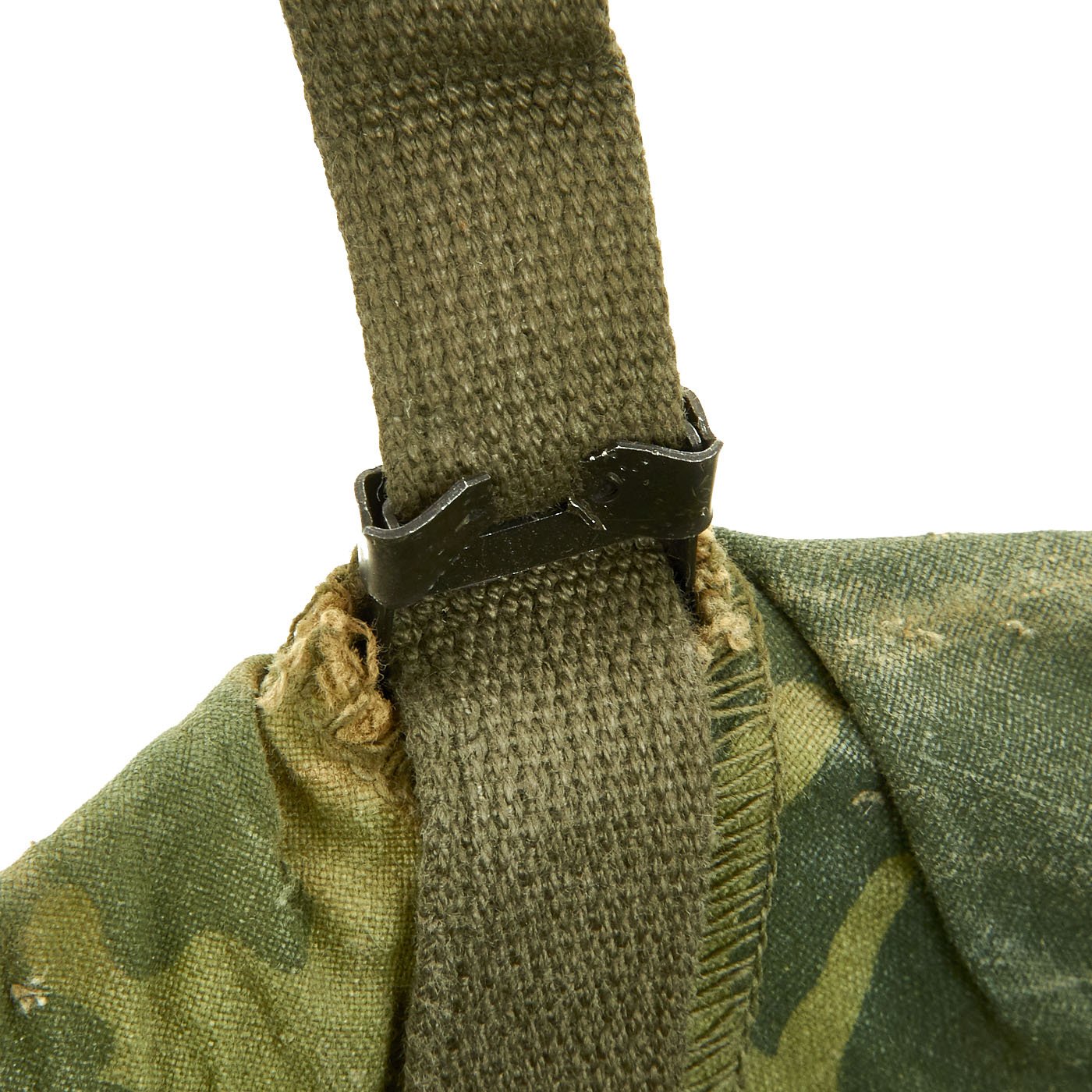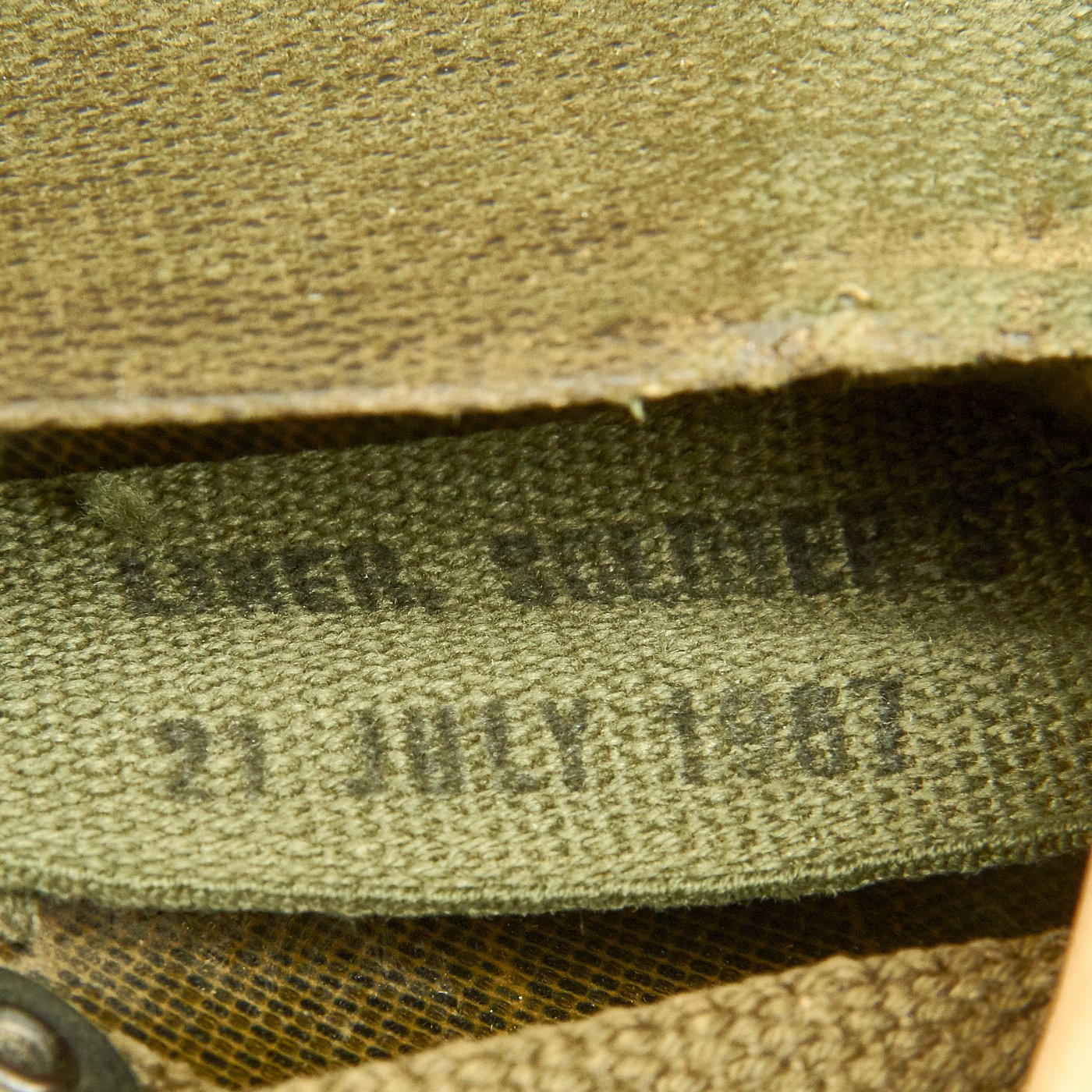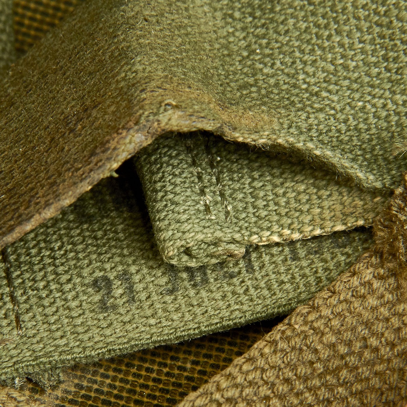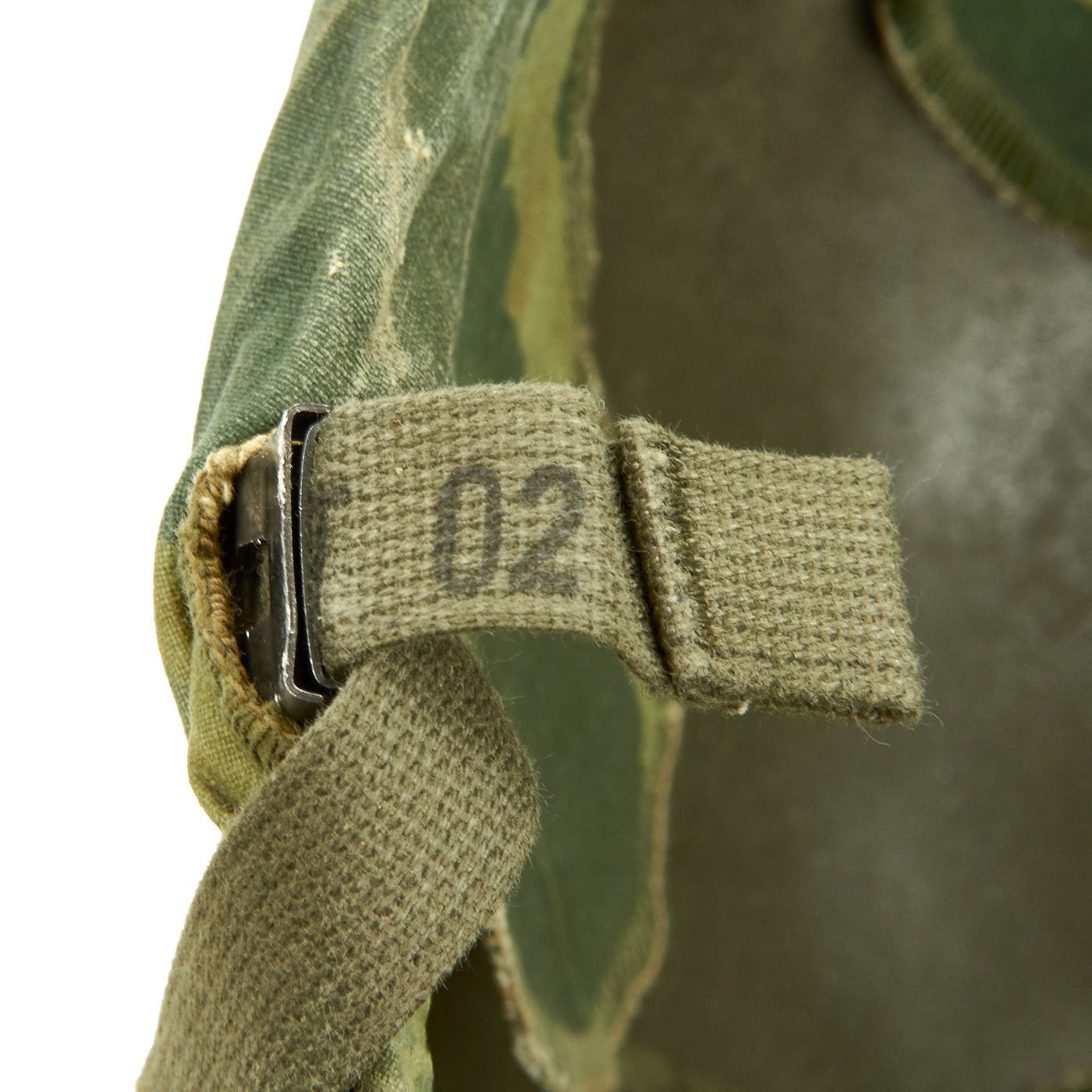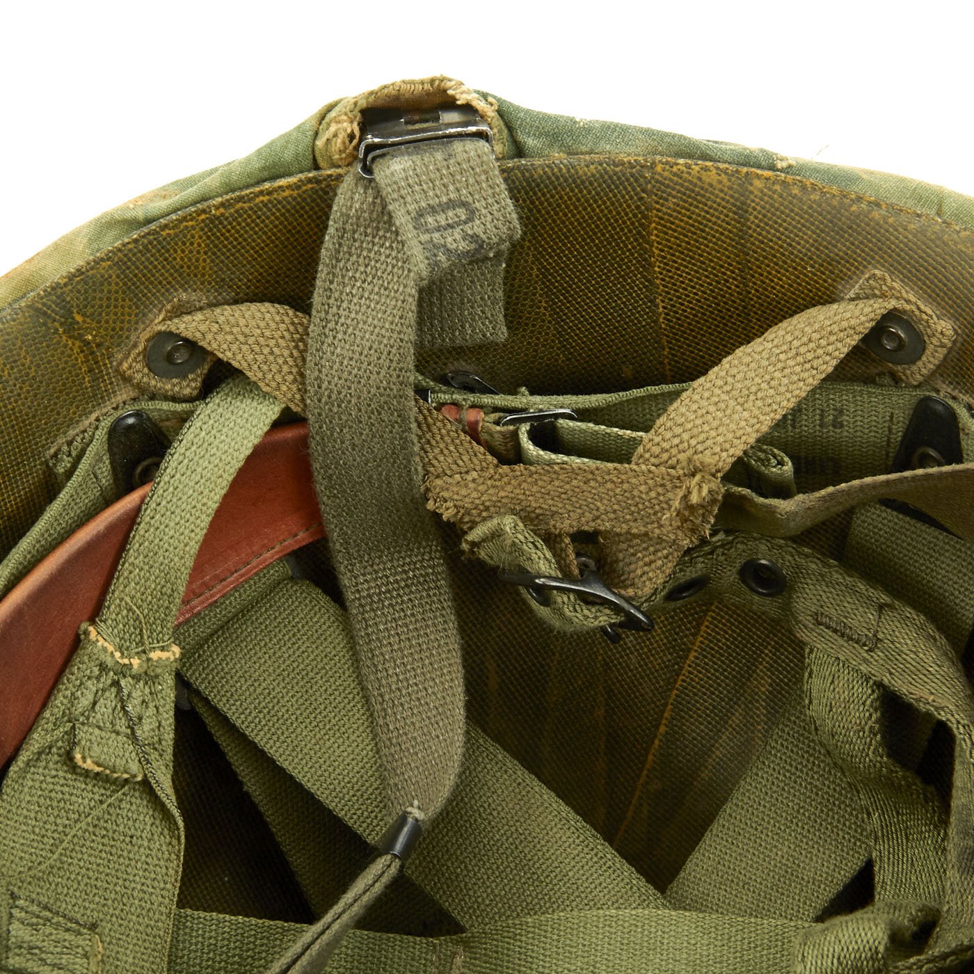 The paratrooper rigging is intact and in great shape, with original markings visible on the back of many of the web components. They are a bit unclear from use and age, but all the components are solid. It has both the rear support as well as the paratrooper chin strap, which is in addition to the standard chin strap. The regular chin strap also has extensions with snaps on the end, which secure the liner to the shell for paratrooper use.