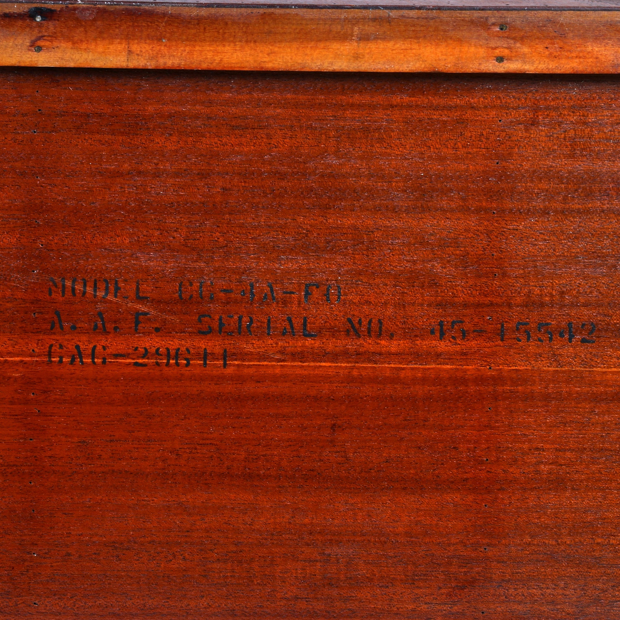 Original Item: Only One Available. Now this is a fantastic display piece, perfect for the avid aviator collector! This is a light weight (just 13 lbs!) wooden bench from a WWII Waco CG-4A Glider, which we have found period pictures of showing it on the right hand side. These had to be as light weight as possible, but still strong enough to hold several soldiers, so they definitely had to be constructed well. It measures 54 inches in length and is 14 ½ inches in height. The top seat measures 18 inches across, while the bottom is 15 ¼ inches across. As with the picture we found, it has round holes in the sides and through the entire interior, probably to reduce weight, as every ounce counted.