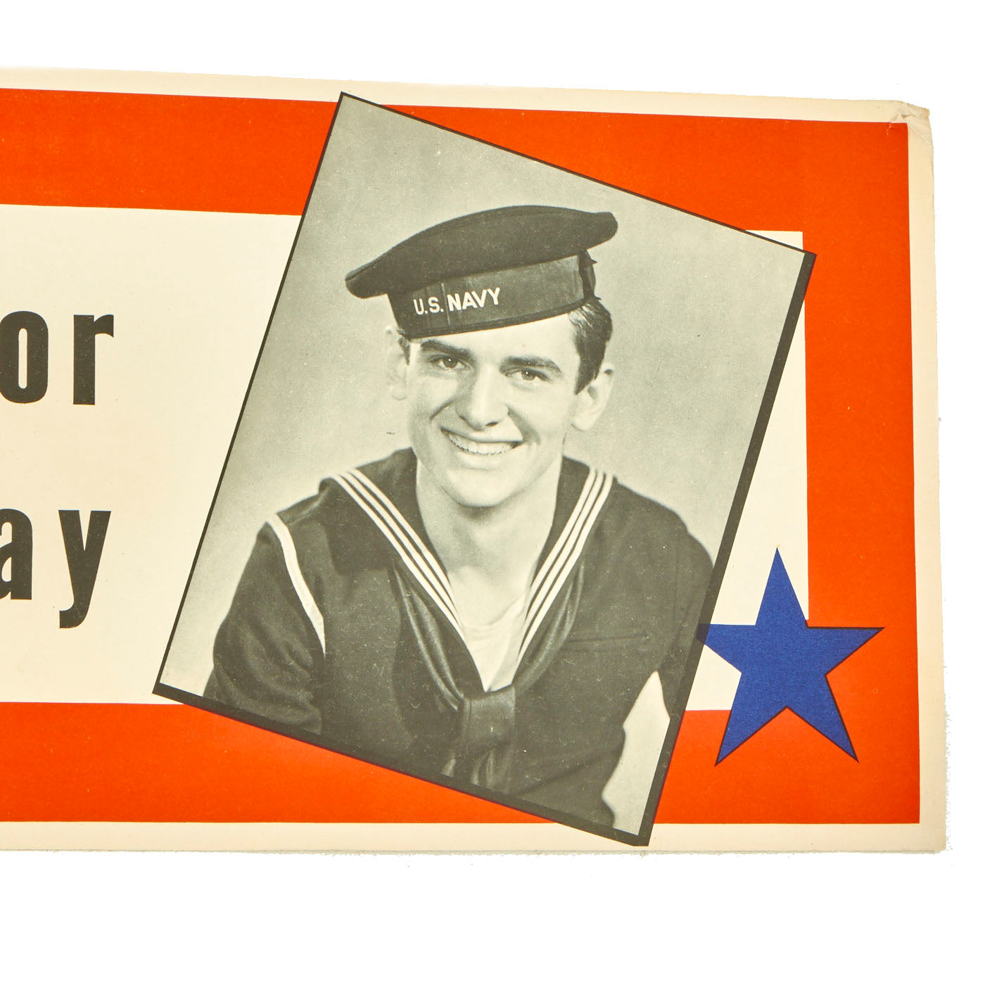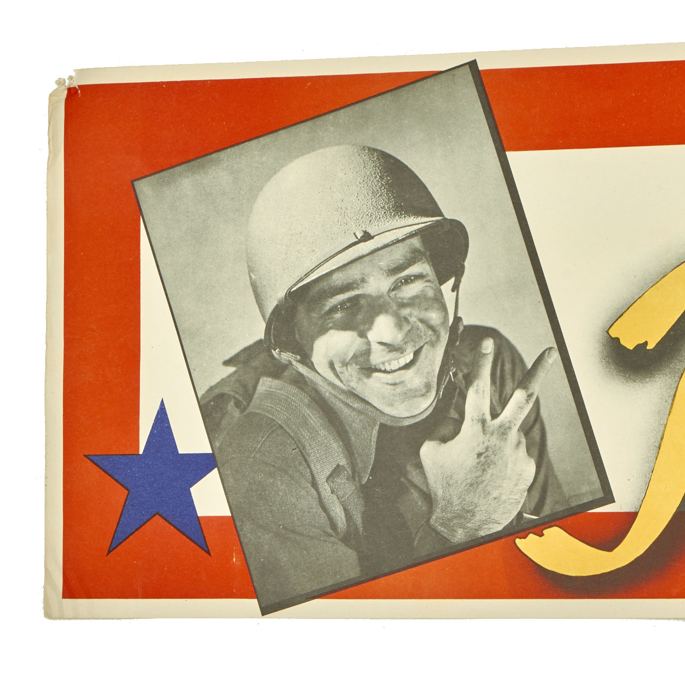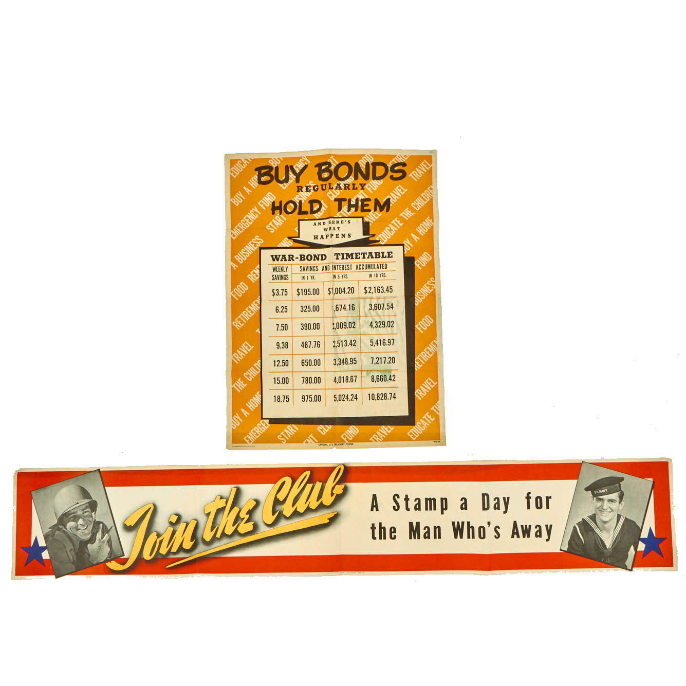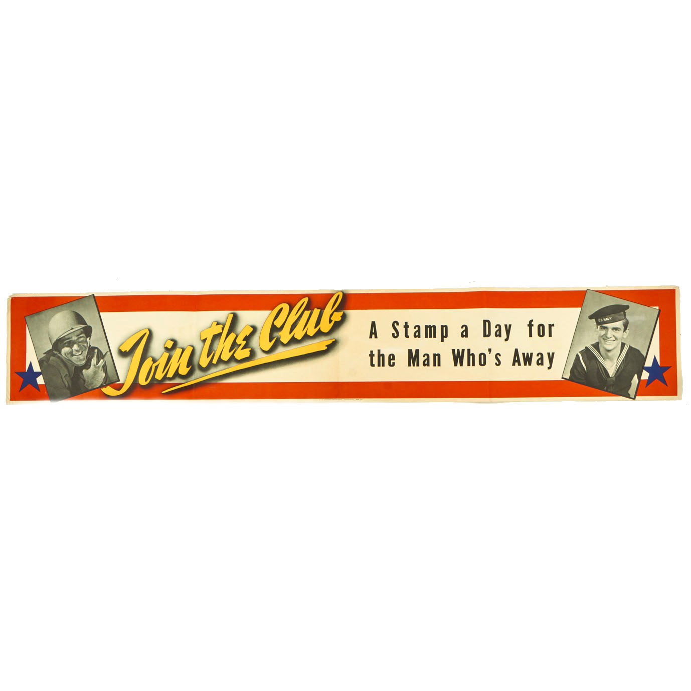 - 60” x 10” “Join the club” War Savings Stamps Poster Banner: The poster is banner style with a stars and stripes theme in red, white and blue colors; there are also black and white photos of a soldier holding up the “V For Victory” sign and a sailor smiling. The poster reads, "Join the Club" in large yellow text, followed by "A Stamp a Day for the Man Who's Away" in black text. The poster was released by the U.S. Government Printing Office in 1943.