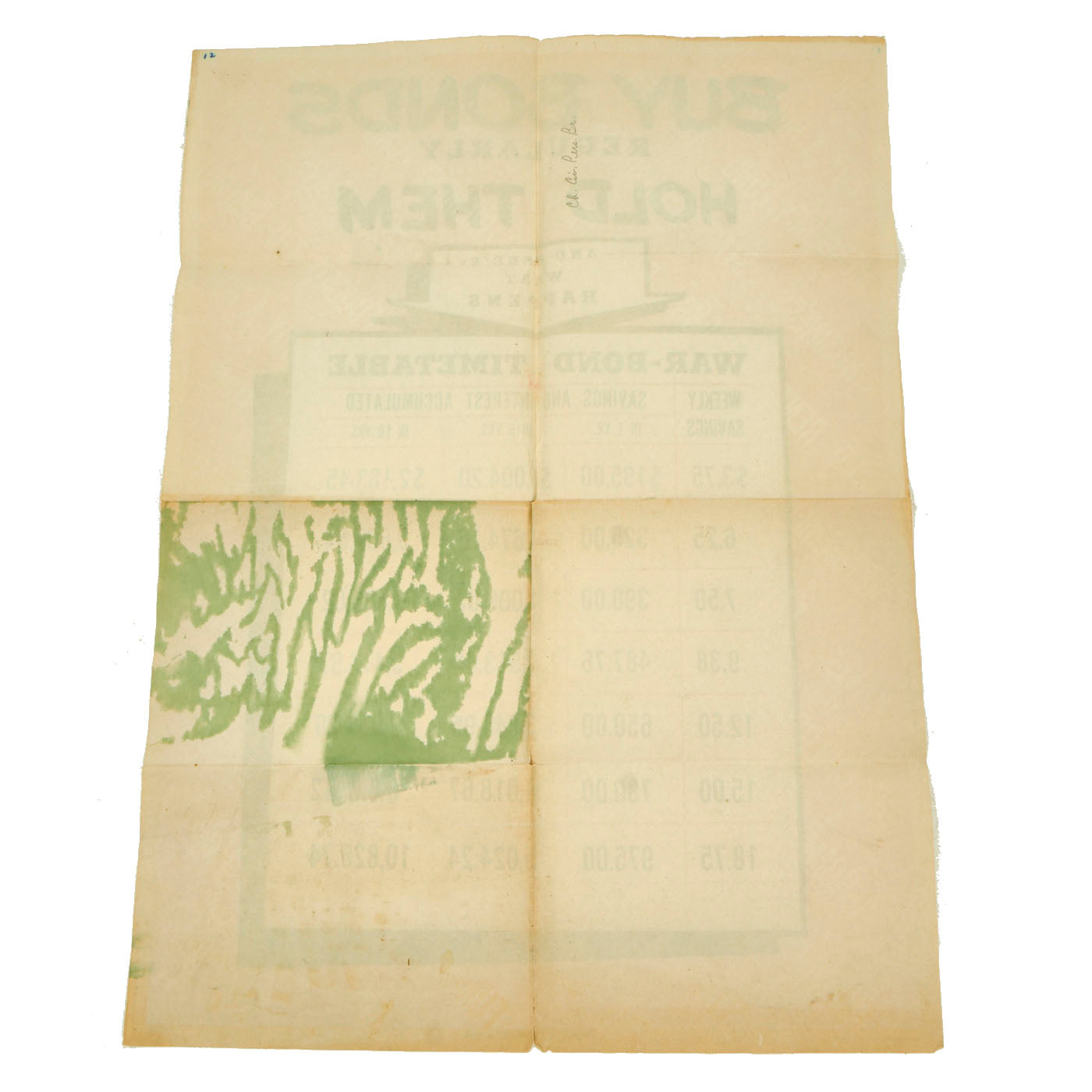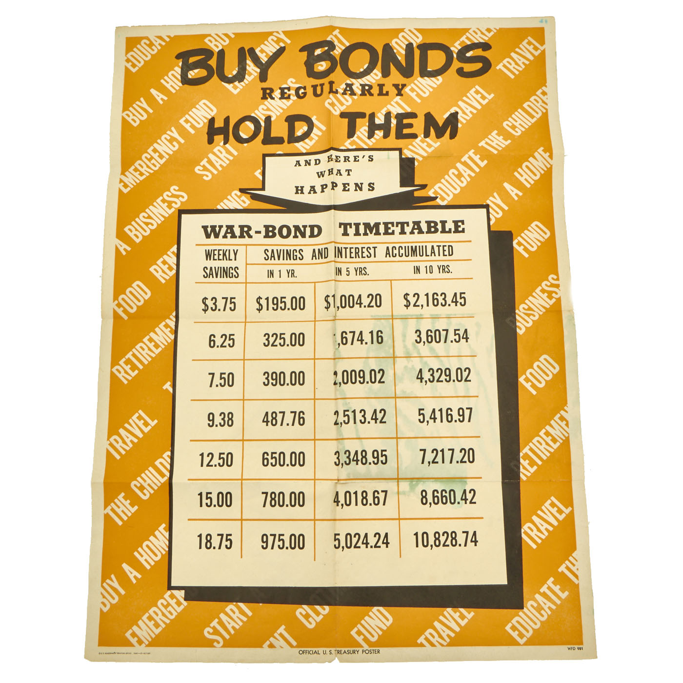 - 28” x 20” War Bonds Time Table Poster: The poster shows the War Bonds interest accumulated table. It shows what your weekly savings would be and money accumulated in 1 year, 5 years and 10 years.