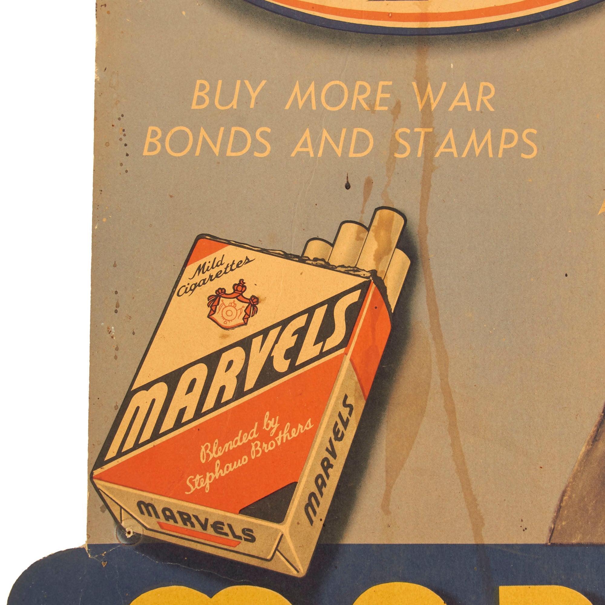 Original Item: Only One Available. This is a fantastic, dual purpose cardboard advertising sign for not only Marvels cigarettes but for War Bonds/Stamps as well. The focal point of the sign is the Female War Industry Worker in her work utility uniform. Encouraged by government recruiting campaigns, some 6 million women took jobs in defense plants during the first three years of the war. Many of them left conventional domestic jobs—maids, cooks, waitresses—to join industrial assembly lines. Others had never worked outside the home. Not surprisingly, they encountered prejudice among their male co-workers. Yet the overall experience was quite positive for many women, and it created long-lasting changes in outlook and perspective.