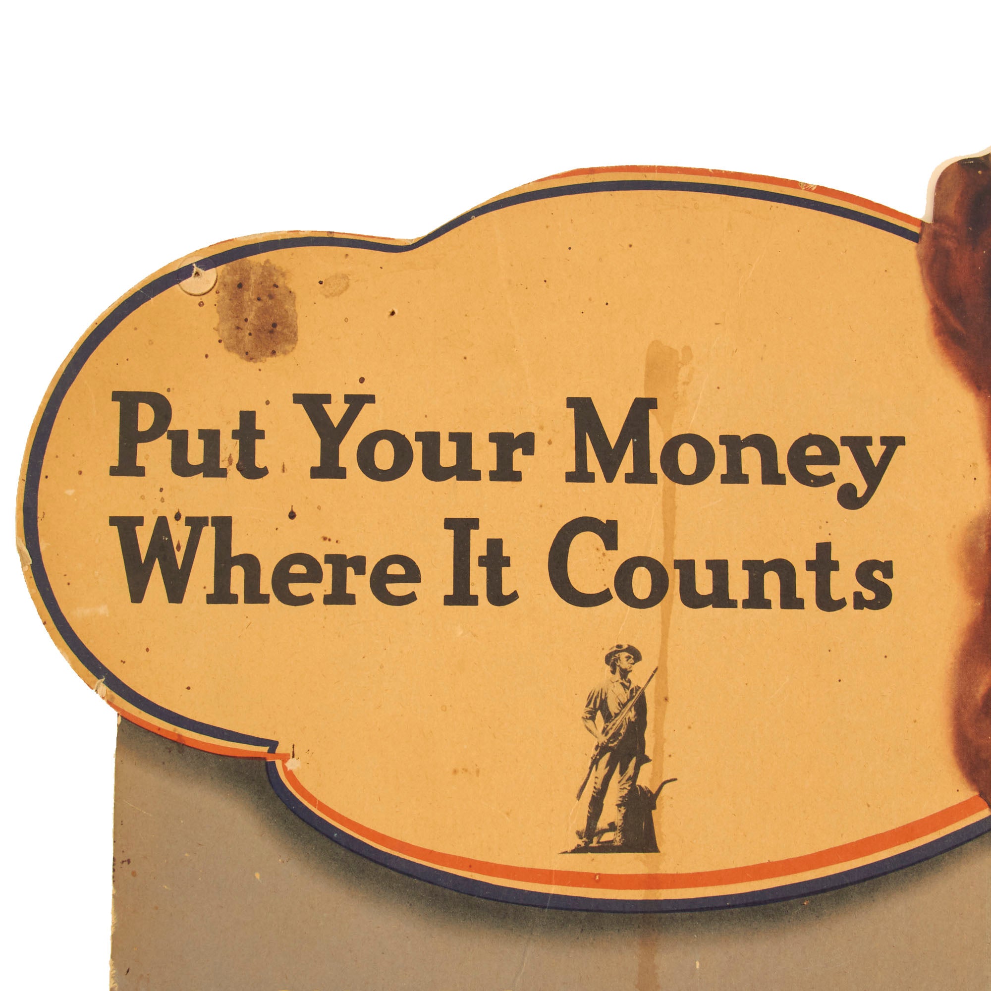The sign, which measures approximately 22” x 18”, features an image of a female worker with an open pack of Marvels brand cigarettes to her left. The message on the sign presents the message “Put Your Money Where It Counts” / “BUY MORE WAR BONDS AND WAR STAMPS”. The bottom of the poster has the Marvels “THE FRESH CIGARETTE OF QUALITY” slogan.