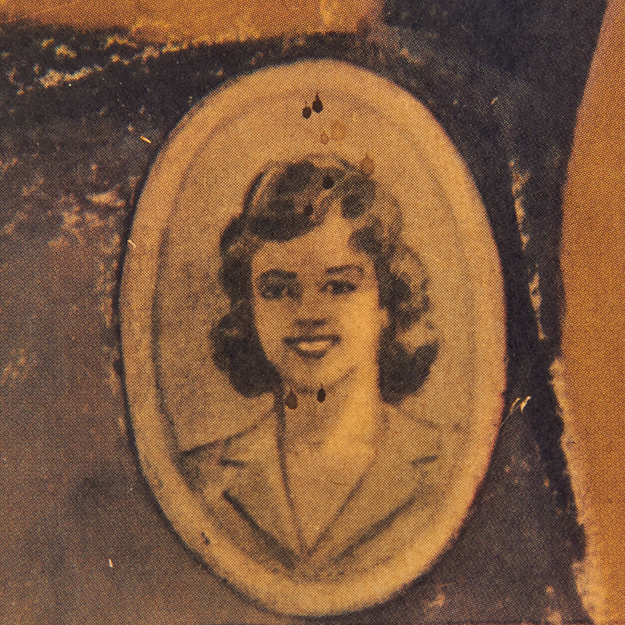 The condition is quite nice but there is some material loss towards the top of her hat and it appears to be a piece missing.
