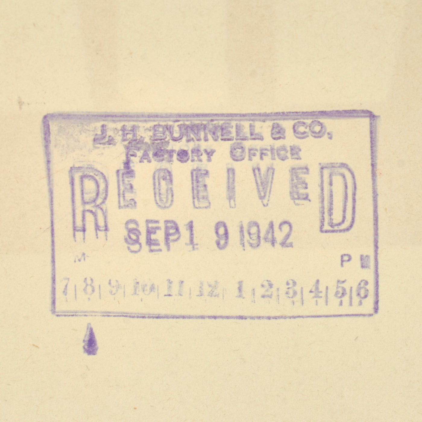 The back of the poster has evidence of this example being issued to a rather popular company! The stamp shows that J.H. BUNNELL & Co received this poster to their factory office on September 19, 1942.
