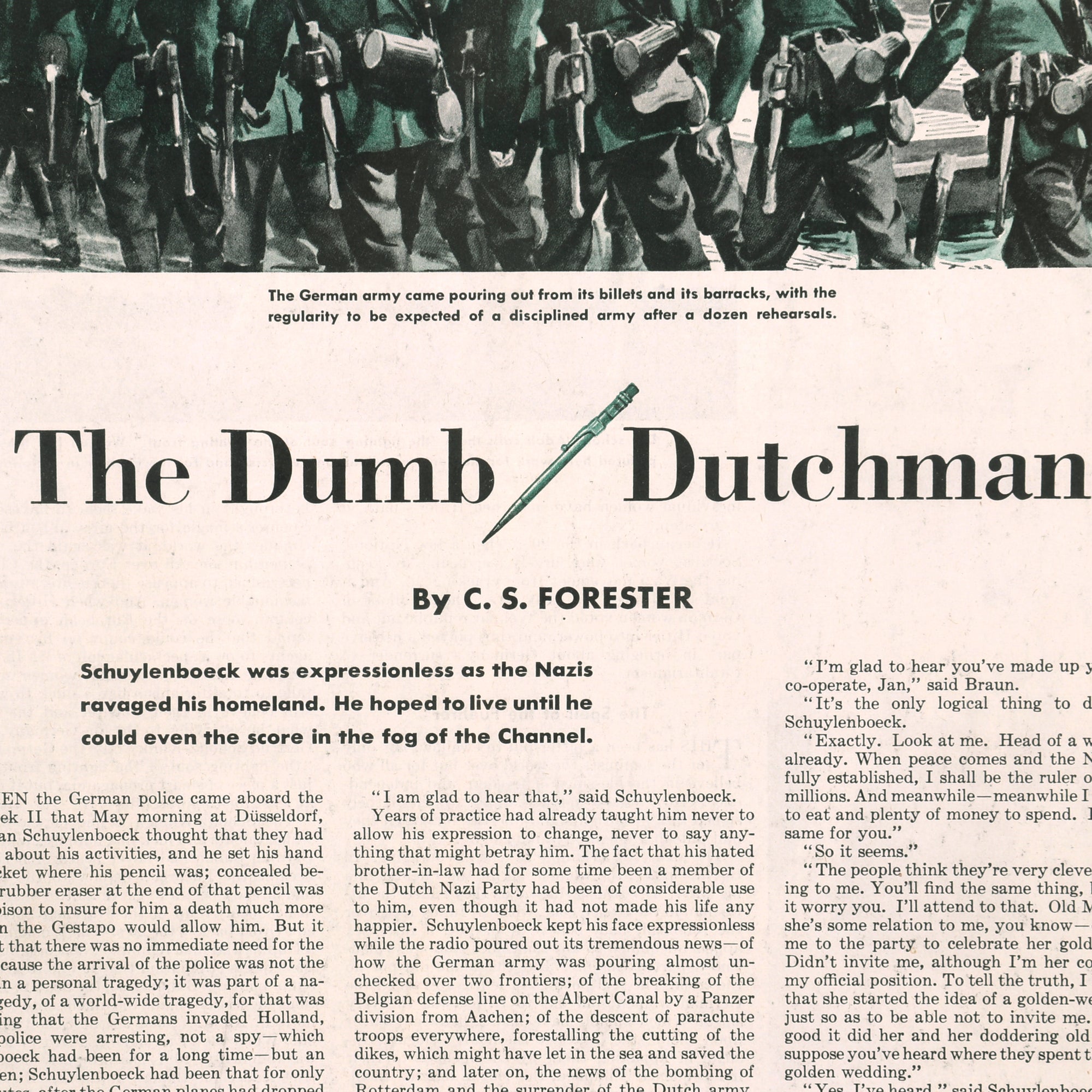 “When the German police came aboard the Lek II that May morning at Düsseldorf, Jan Schuylenboeck thought that they had found out about his activities, and he set his hand to his pocket where his pencil was. Concealed beneath the rubber eraser at the end of that pencil was enough poison to ensure for him a death much more rapid than the Gestapo would allow him.