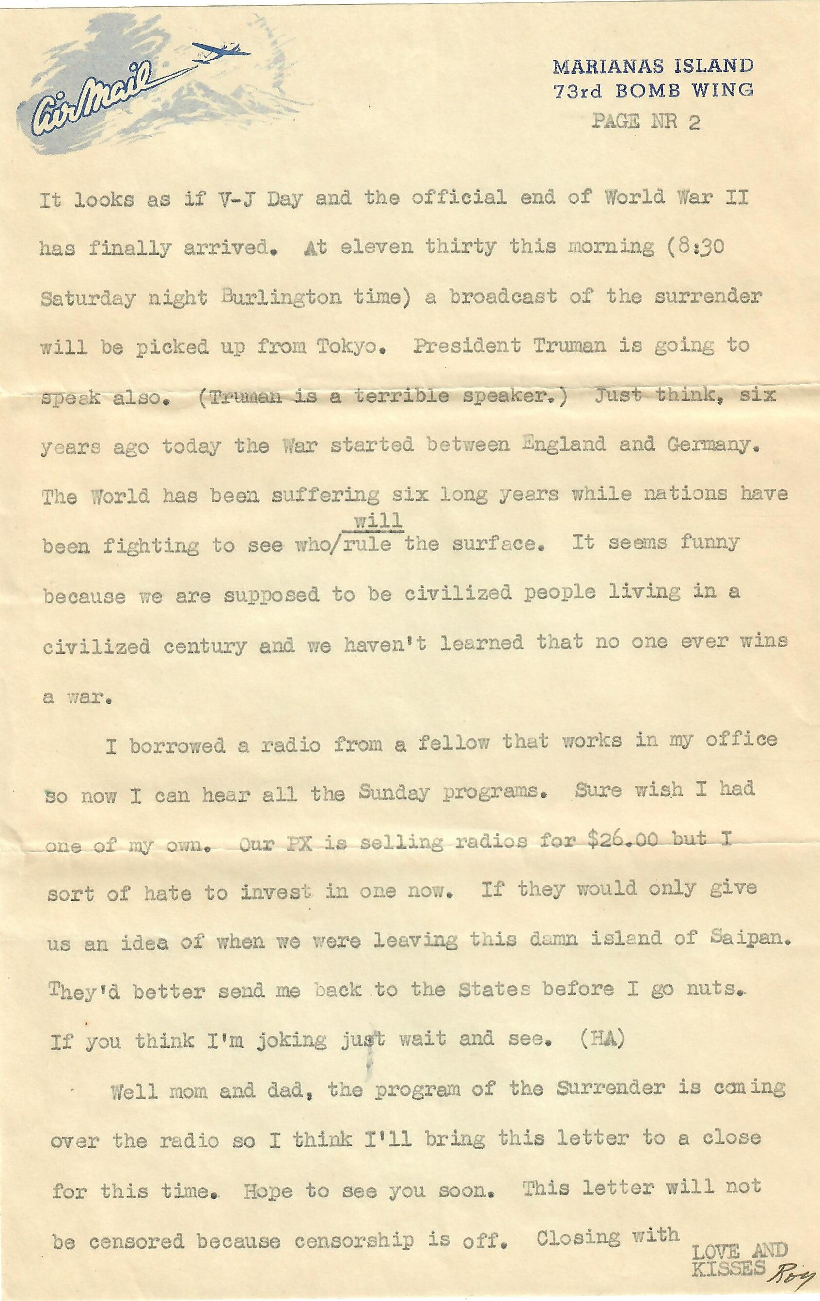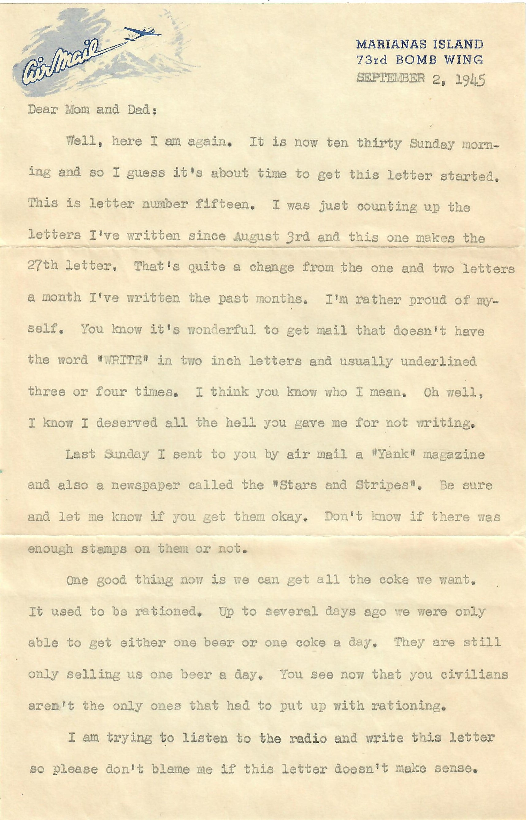 The letter is typewritten on Air Mail stationary for the 73rd Bomb Wing on Marianas Island, and is dated September 2nd, 1945, the day World War II ended. The subject of the letter is very typical and makes a great addition to this leaflet. This is a really stellar ephemera group ready for further research and display.
