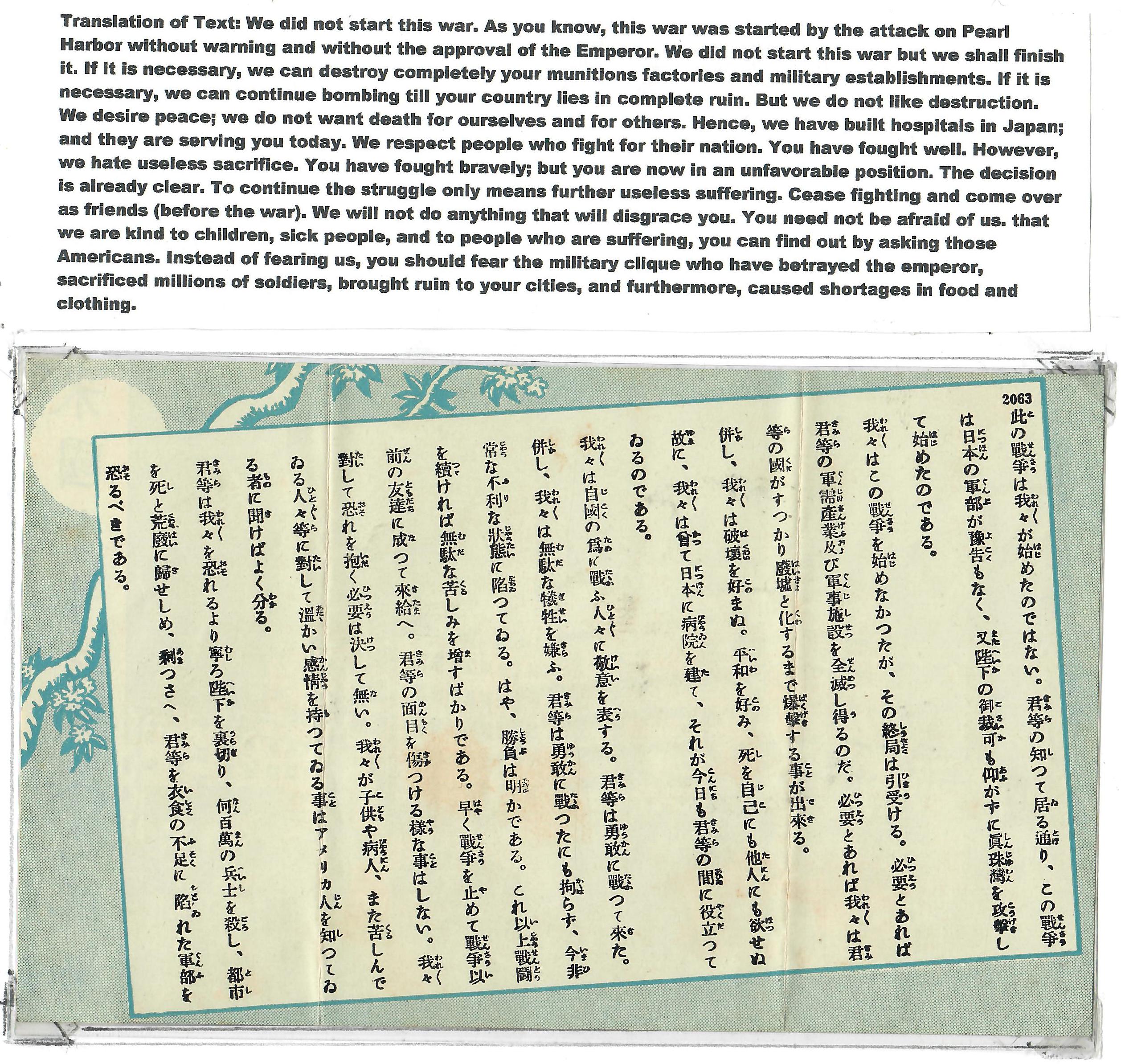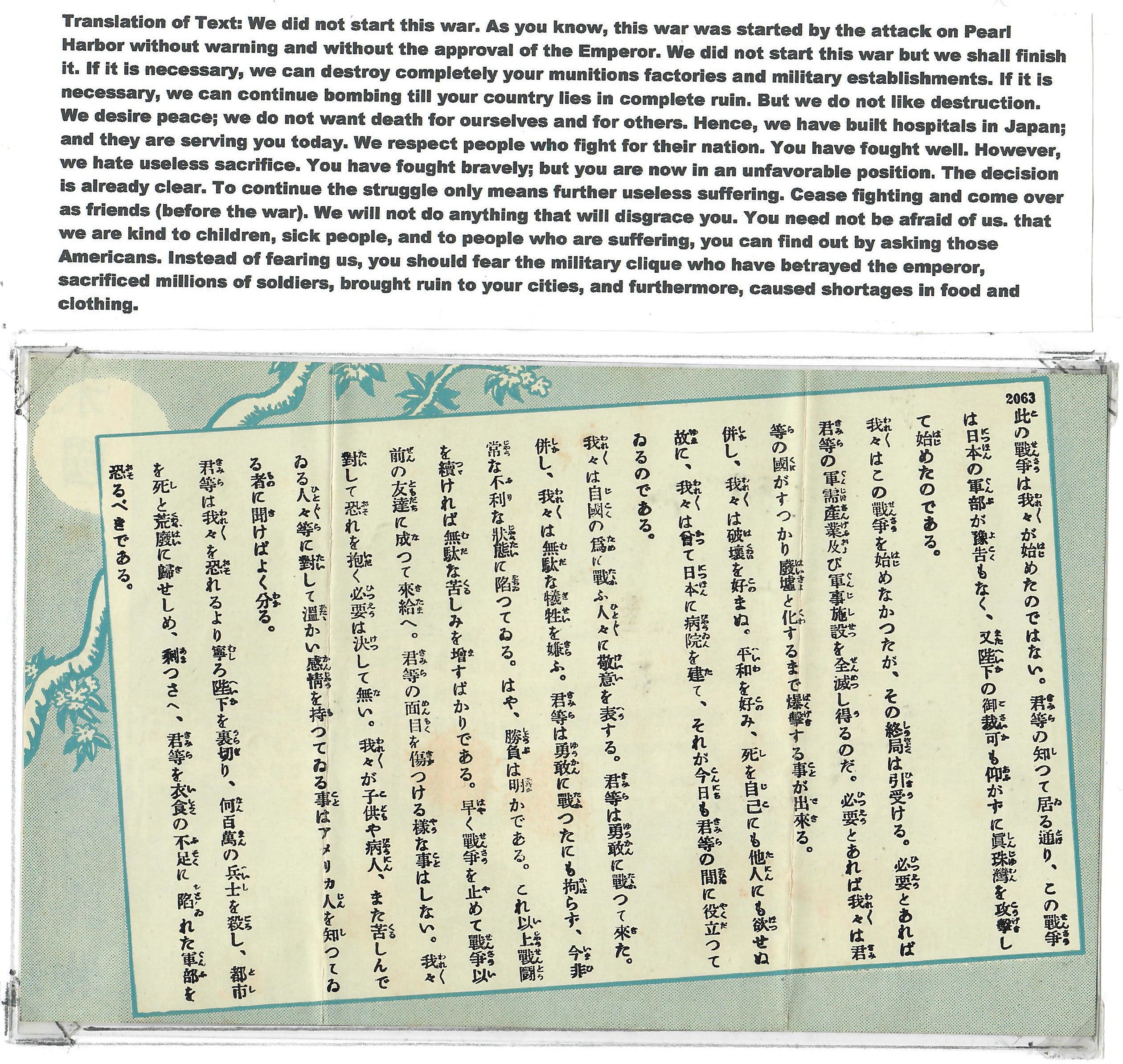 Original Item. Only One Available. This is a rare example of a U.S. leaflet printed in Japanese to be dropped on Japanese forces to convince them to surrender, telling them that they fought well but fought in an unprovoked war started by the attack on Pearl Harbor without approval from the Emperor. This fact is incorrect, however, as Hirihito knew about Pearl Harbor. The leaflet comes with a 2 page letter sent by “Roy” of the 73rd Bomb Wing on Marianas to his parents, discussing V-J Day and the Japanese surrender on September 2nd, 1945.