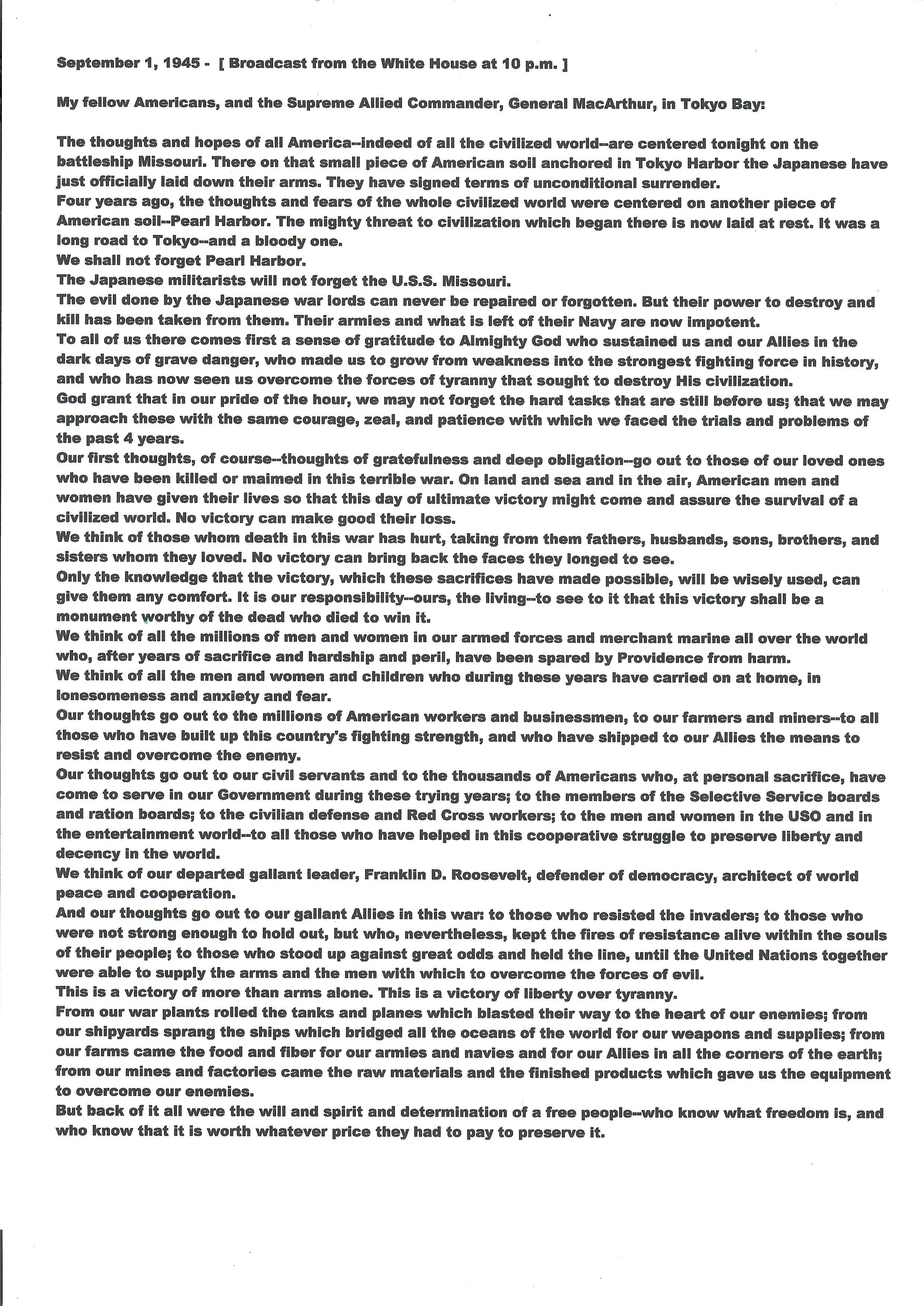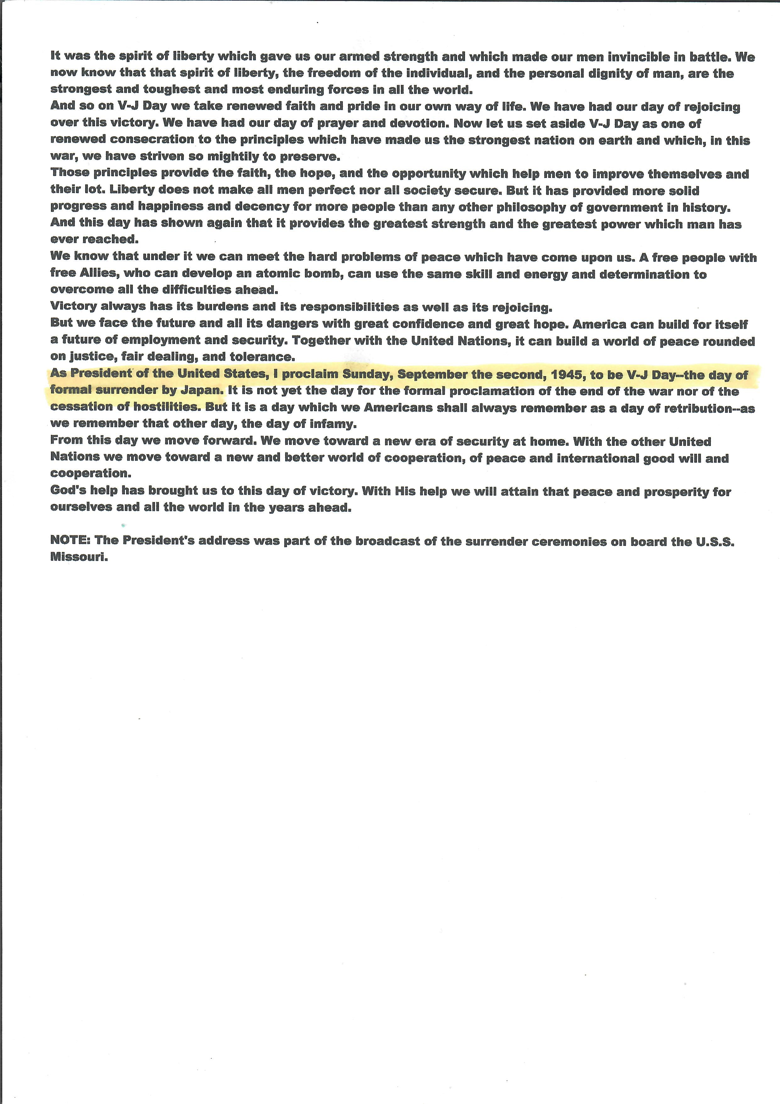 The leaflet comes in a plastic sleeve with its direct translation printed above it, as well as the printed speech of President Harry Truman given on the 1st of September, 1945 announcing the coming end of the war. The leaflet itself measures roughly 5¼ x 8½”.