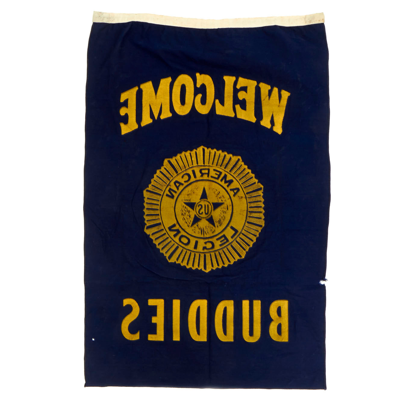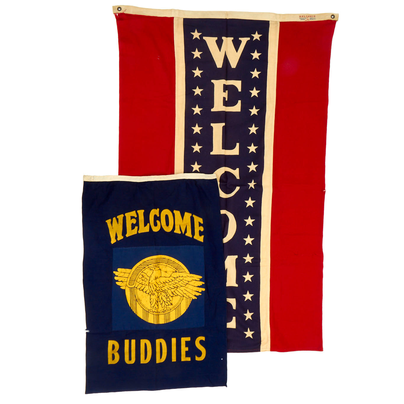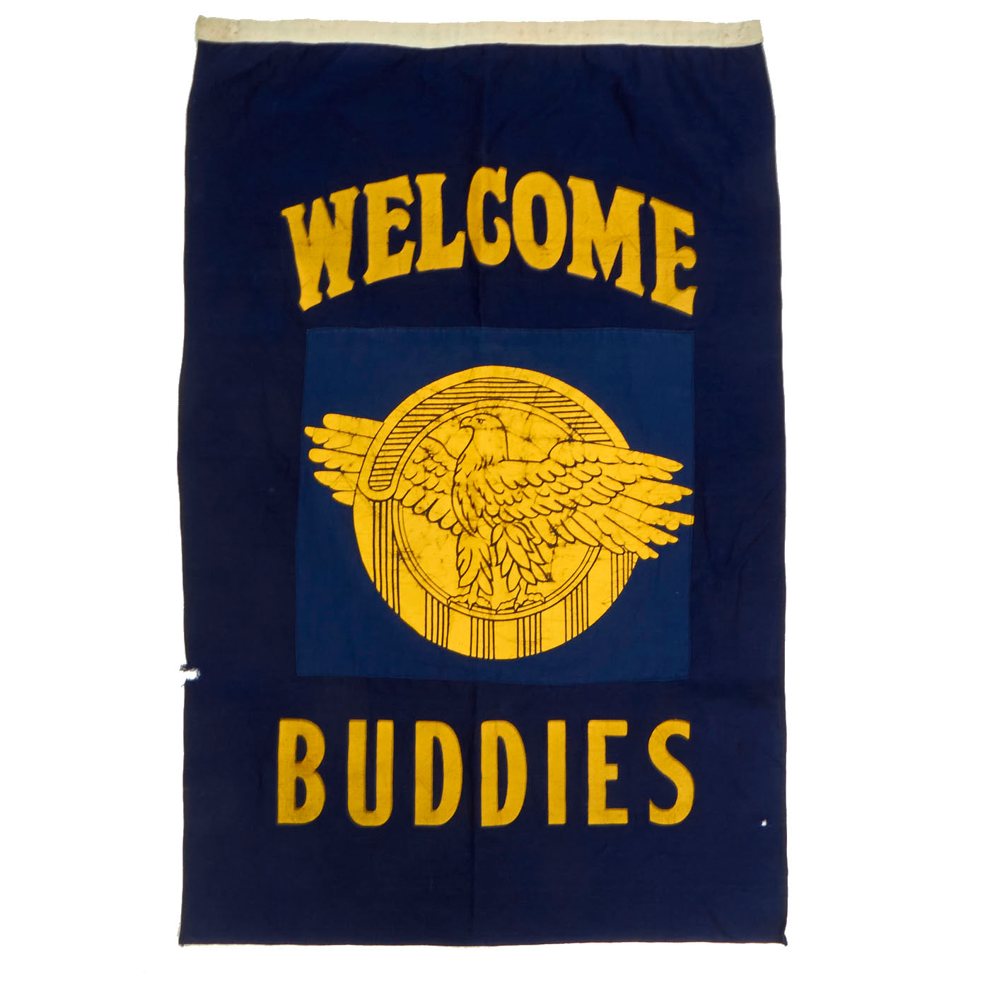 The larger banner measures 56” x 37” and is very patriotic in design and constructed similar to an American Flag, with “Stars and Bars”. The flag/banner bears the message “Welcome Home” in the center on blue with white stars running the length on both sides. The smaller banner is an American Legion banner which displays the message “WELCOME HOME BUDDIES” on the front with a “Ruptured Duck” insignia in the center.
