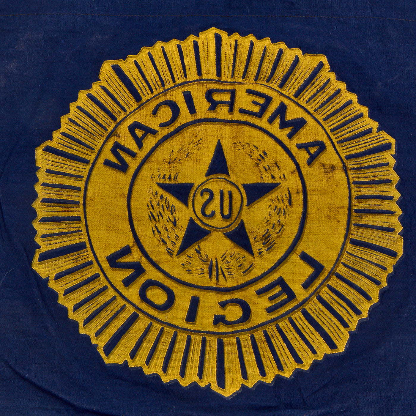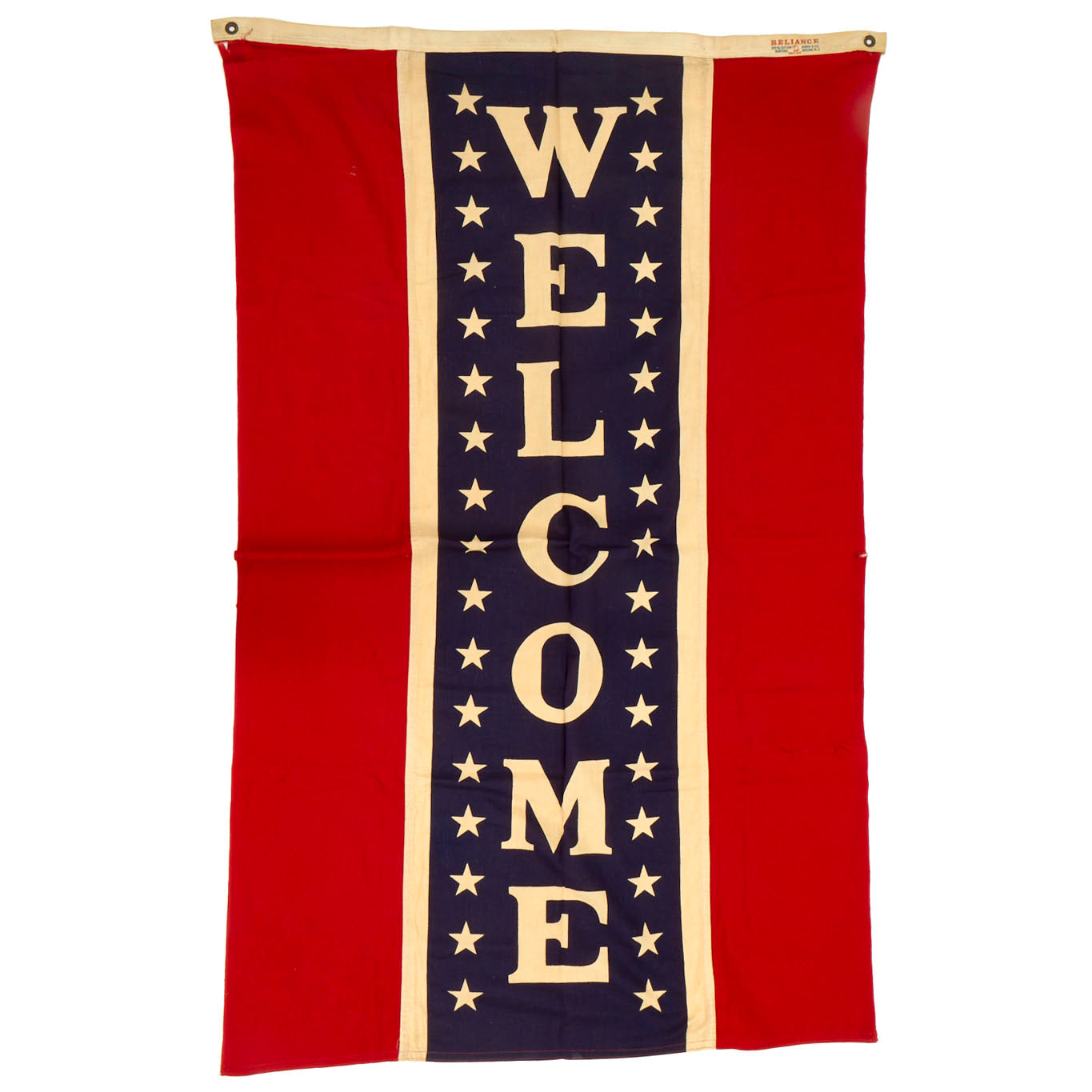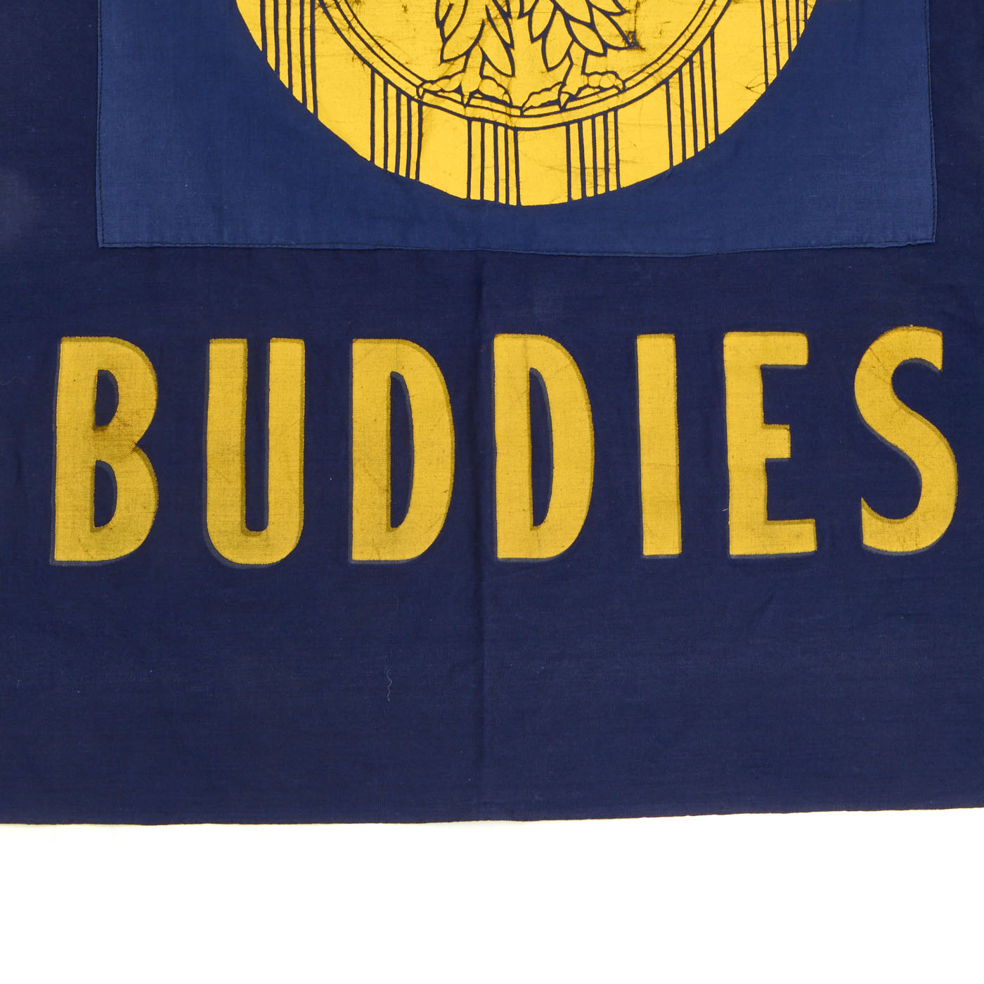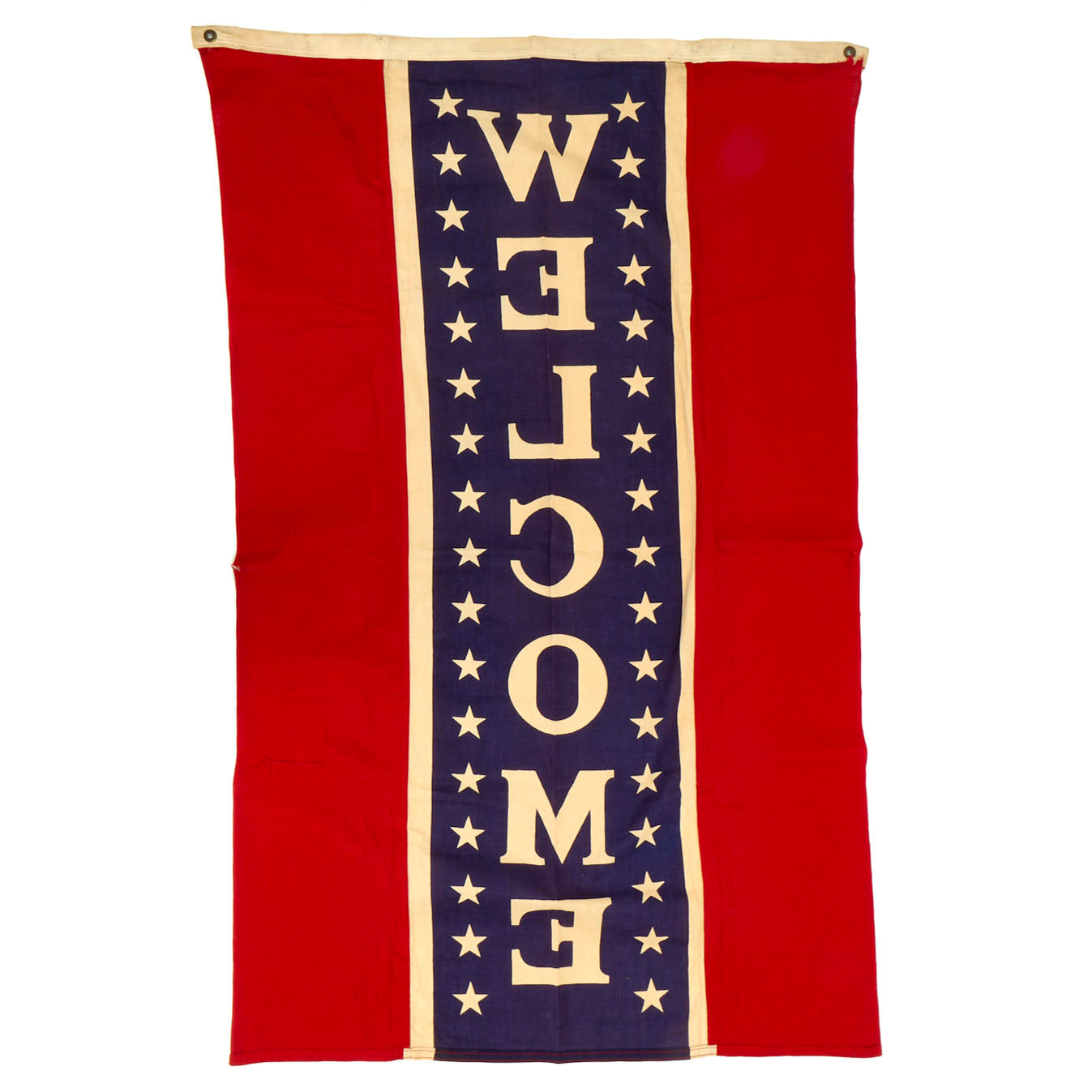 The larger banner measures 56” x 37” and is very patriotic in design and constructed similar to an American Flag, with “Stars and Bars”. The flag/banner bears the message “Welcome Home” in the center on blue with white stars running the length on both sides. The smaller banner is an American Legion banner which displays the message “WELCOME HOME BUDDIES” on the front with a “Ruptured Duck” insignia in the center.