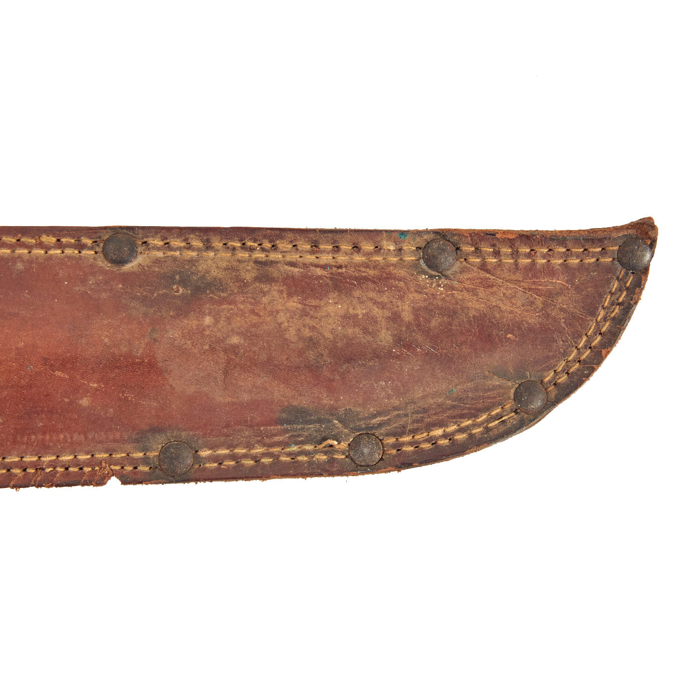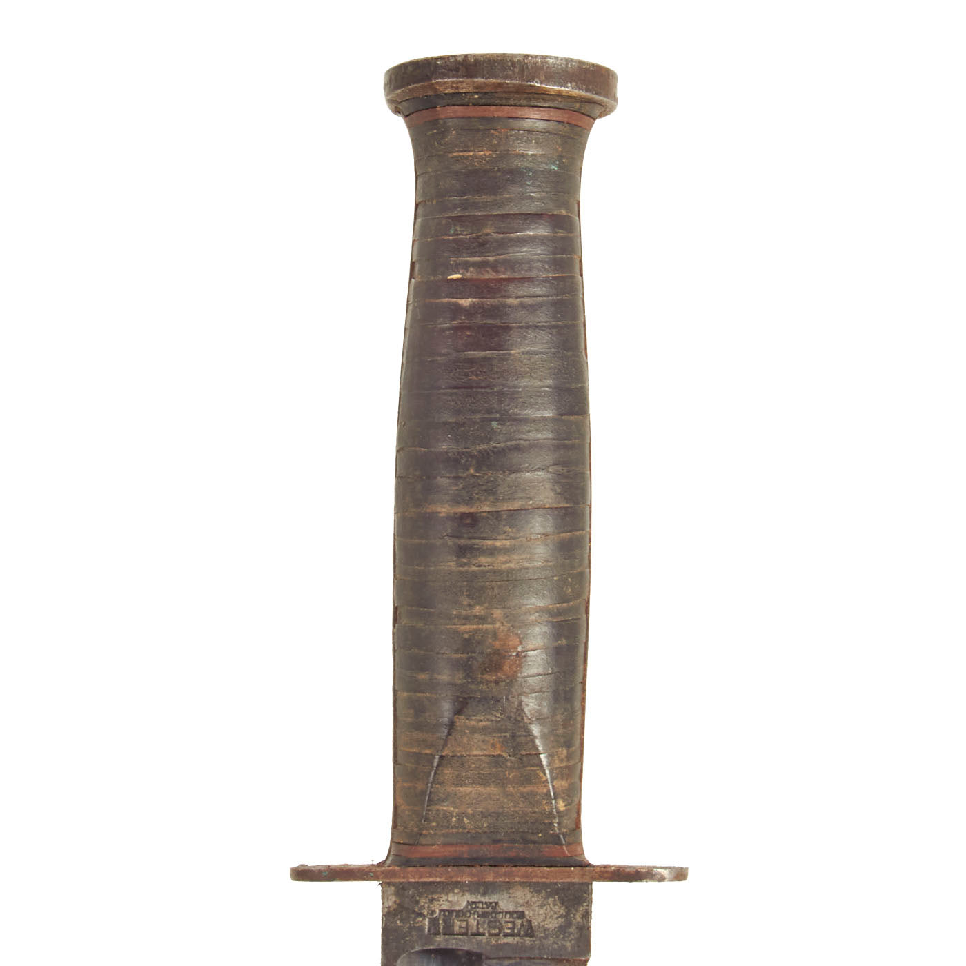 Original Item: Only One Available. Offered in very nice condition this genuine WWII Western G-46-8 fighting knife, complete with its original leather scabbard. It is sometimes called the "8 Fighter", and there were also 4 and 6 inch blade versions of the G46. This knife was developed during WW2 by Western Cutlery of Boulder Colorado, who hoped to sell it to the Marine Corps to fill their need for a fighting utility knife. Unfortunately the knife proved too expensive compared to competitors. Western-made knives were all beautifully made with a bluing comparable to that seen on hunting rifles. Although they never had any major government contracts they sold thousands of knives through private and unit purchases. This particular version was only sold to the military, and in overall shape is very similar to the "KA-BAR" knives that were widely issued.