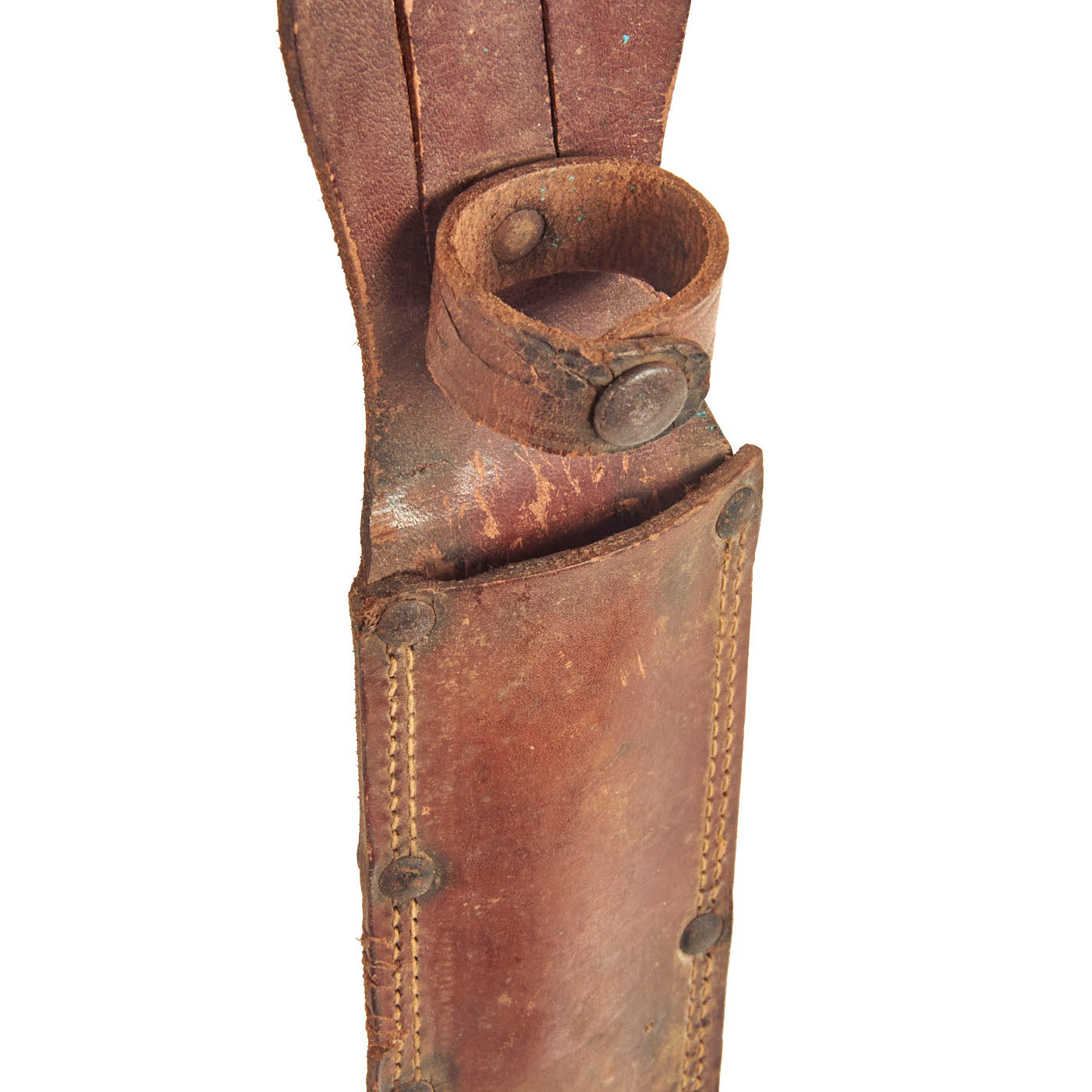 The original leather scabbard has a lovely aged color, showing some oxidation and staining around the rivets due to moisture exposure while in service. It still has the original securing strap, though it shows some cracking around the snap, and is a bit delicate.