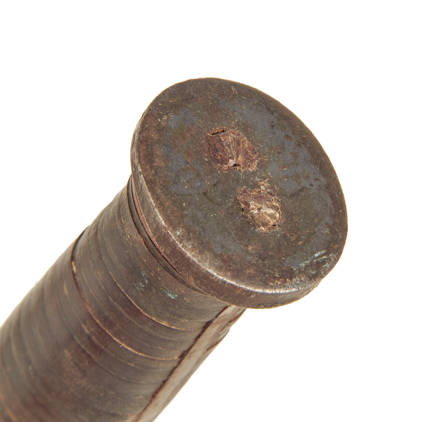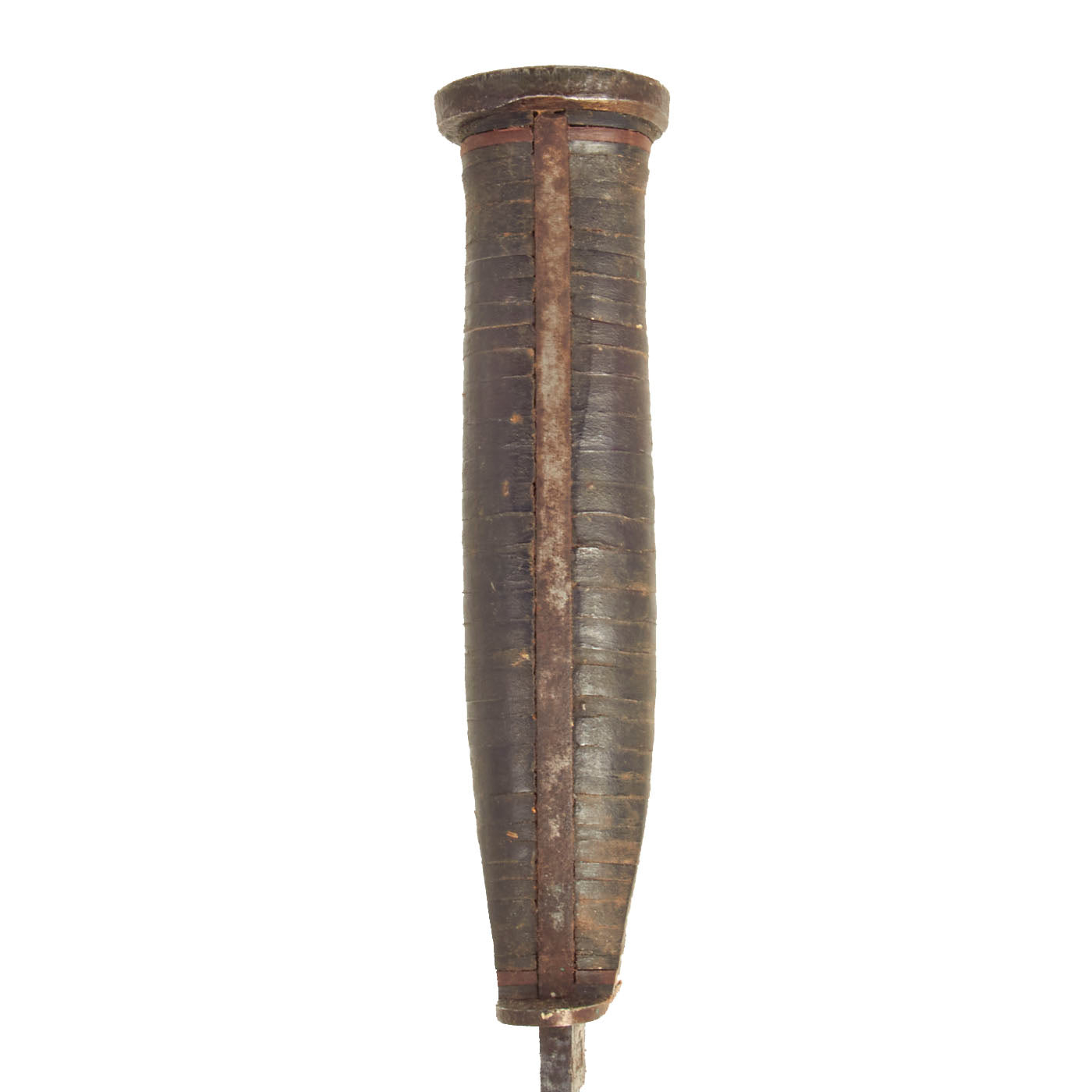 This example has an 8 inch long single-edged clip-point blade, which has a broad fuller below the spine. The blade is 1 1/4 inches wide, and is of very sturdy construction. The oval ended cross guard is in good condition, but is a little loose due to leather shrinkage. The stacked leather grip is stained, but still solid and in very good condition, with no looseness we can feel, and the black / red / black spacers at the end are in good shape as well. The pommel cap is solid, and secured to the end of the tang in two places. The blade ricasso is marked: