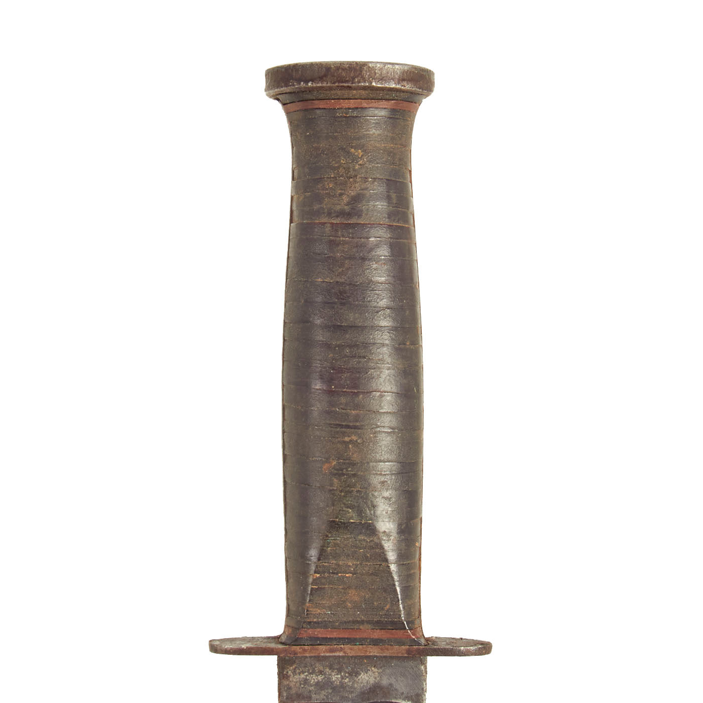 This marking was used for most of the WWII production after 1941. This knife has definitely been used, but not intentionally abused, and the blade does not appear to have been sharpened more than a few times. In many places the edge is still quite sharp, and there are no major nicks or chips on the edge. It does retain a good amount of the high quality heavy blued finish on the left side, with less retained on the right due to oxidation and staining. This most likely happened in the scabbard, as it definitely shows signs of moisture exposure.