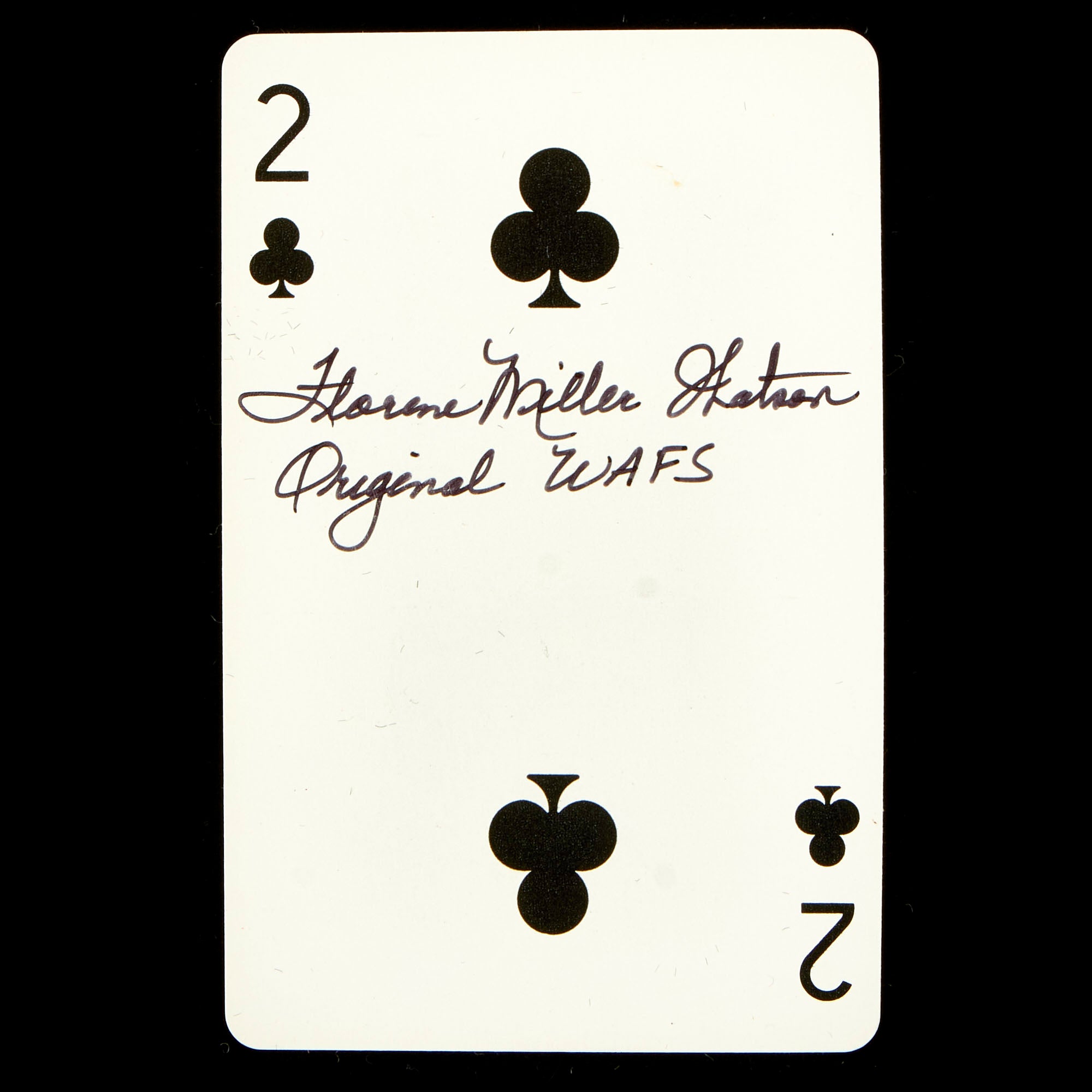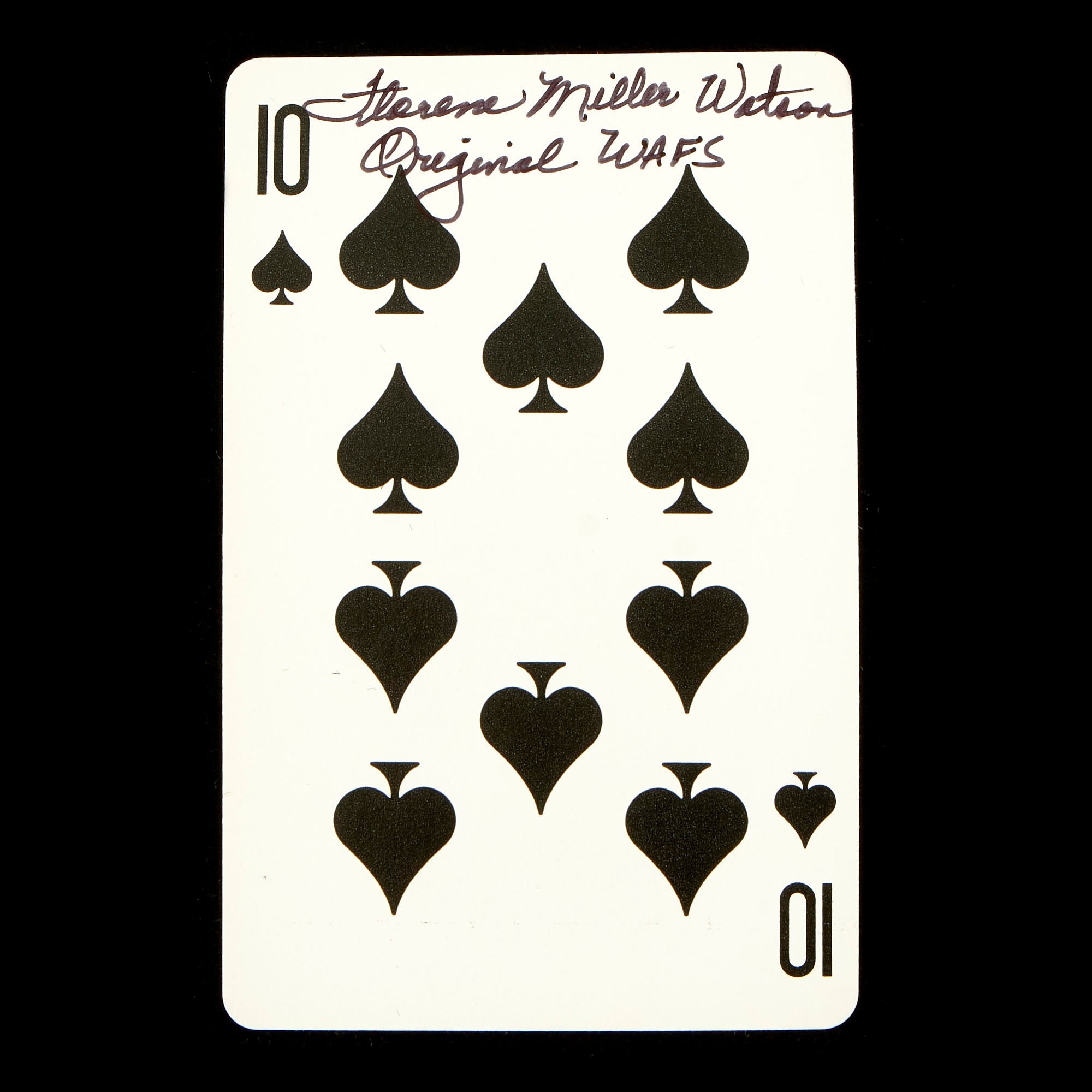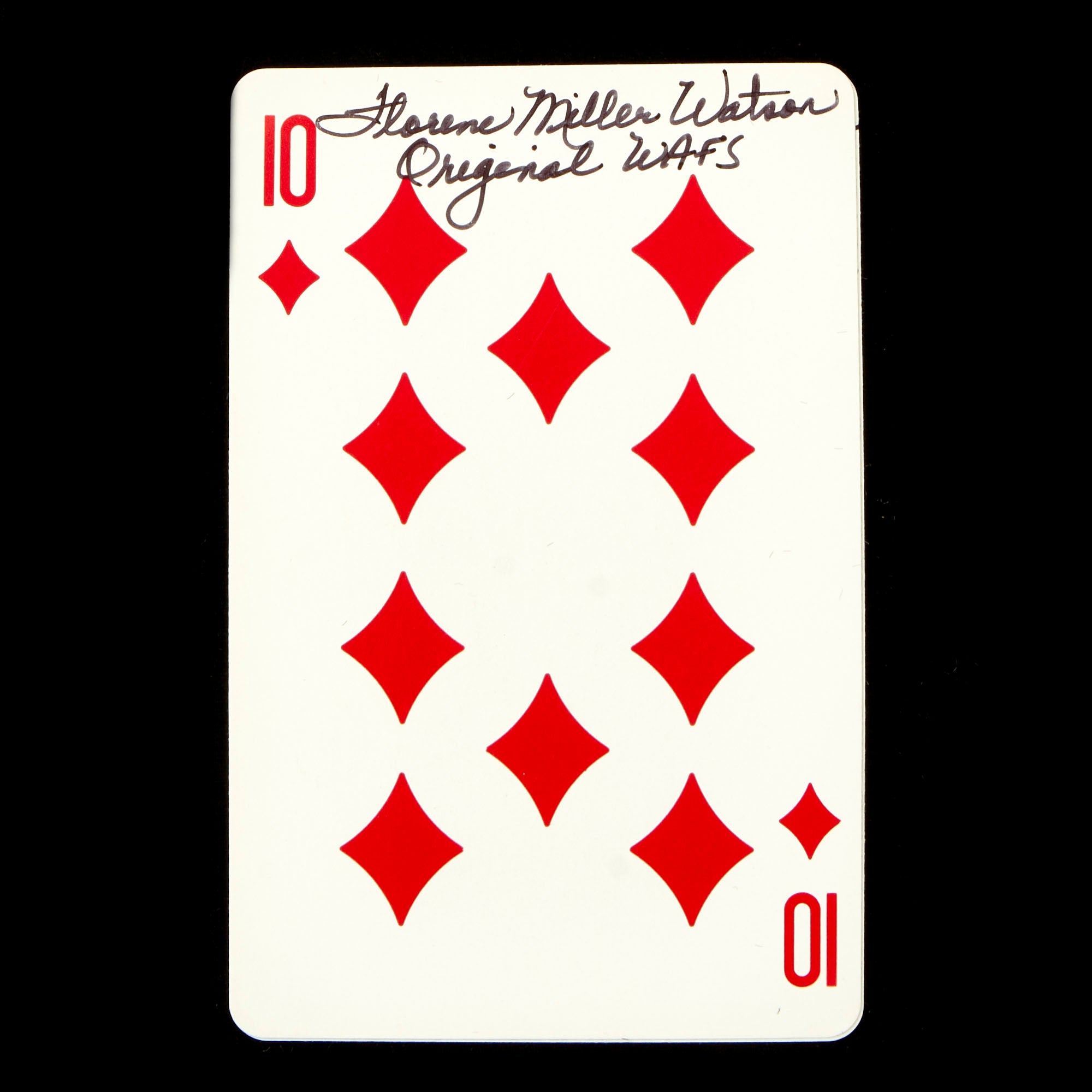 Original Items: Only One Set of 20 Available. This is a fantastic partial playing card set featuring 7 different “WASP” pilot signatures on 20 playing cards. The Women Airforce Service Pilots (WASP) (also Women's Army Service Pilots or Women's Auxiliary Service Pilots) was a civilian women pilots' organization, whose members were United States federal civil service employees. Members of WASP became trained pilots who tested aircraft, ferried aircraft, and trained other pilots. Their purpose was to free male pilots for combat roles during World War II. Despite various members of the armed forces being involved in the creation of the program, the WASP and its members had no military standing.