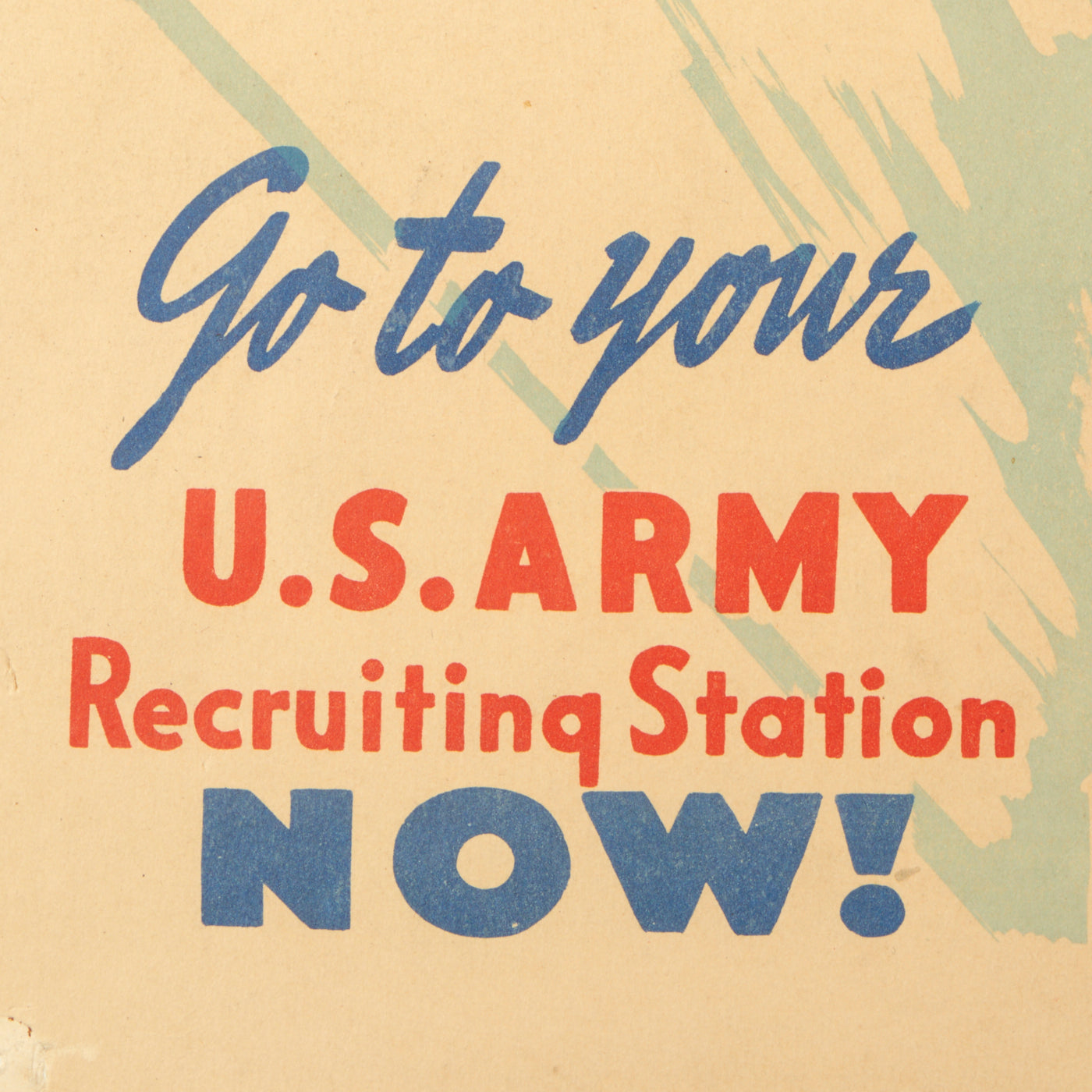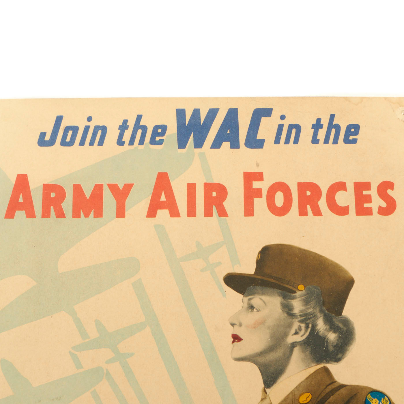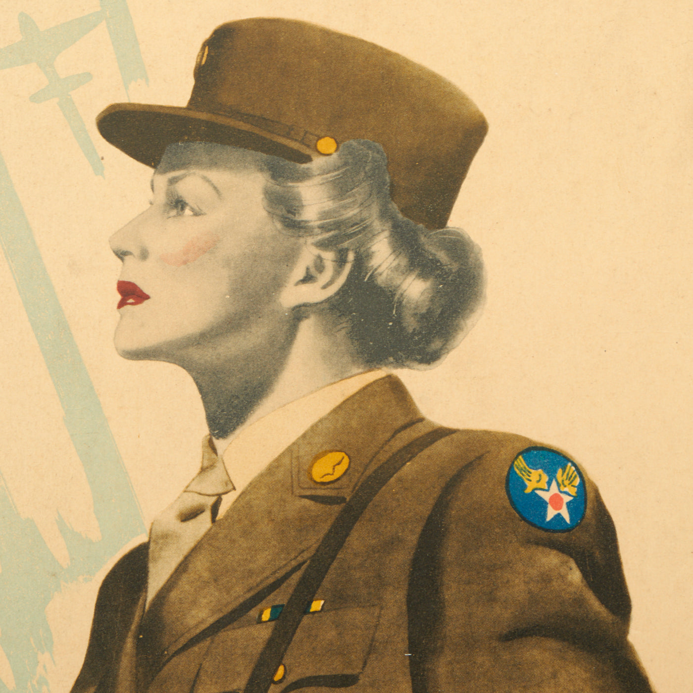 This poster features a lovely young woman in a green Army service uniform with an Army Air Corps patch on her left shoulder. She’s looking towards the sky as a silhouette of multiple aircraft flies overhead. The text that can be found is as follows: