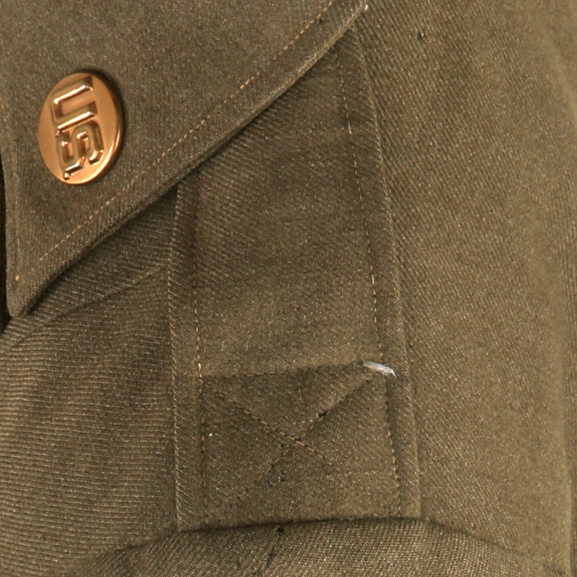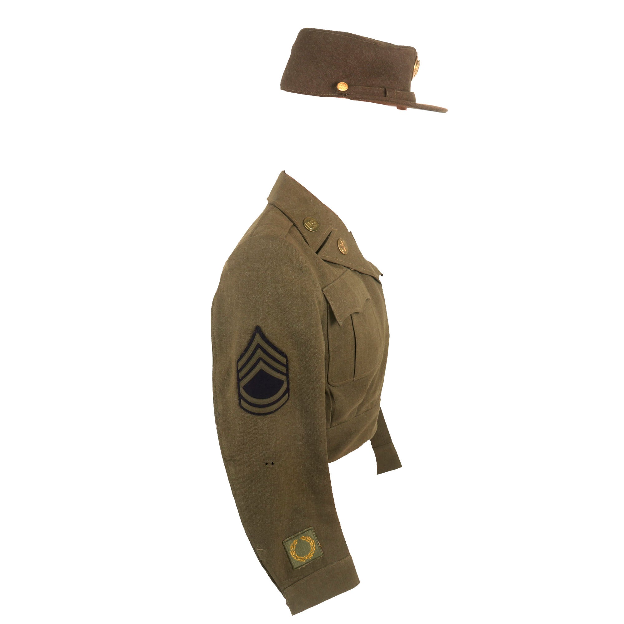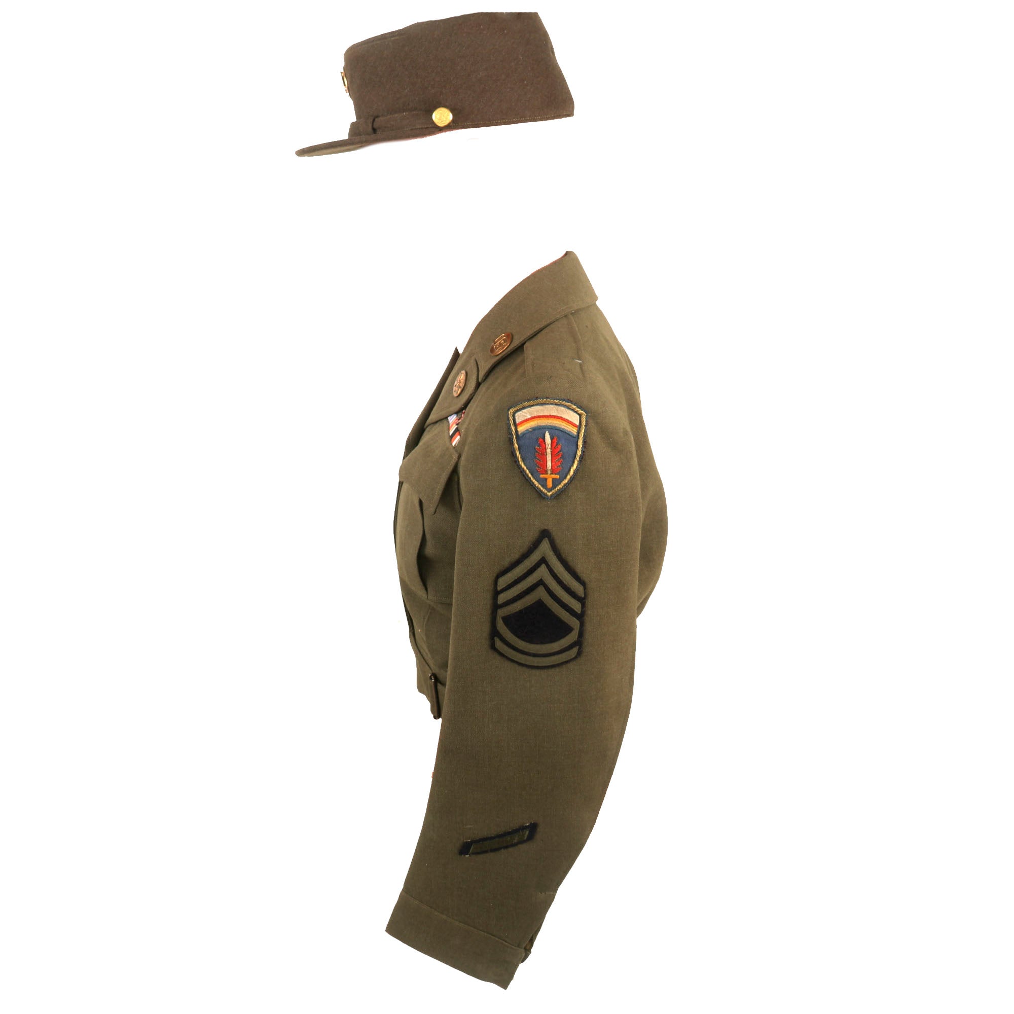 - Paris-Made Women’s Ike Jacket with a gorgeous bullion patch for SHAEF, the Supreme Headquarters Allied Expeditionary Force. The jacket has Sergeant First Class chevrons on both sleeves, one service stripe on the left cuff, a Meritorious service patch on the right cuff, US & Signal Corps insignia on the collar, and a 4-place ribbon bar with an Army Good Conduct Medal with device, American Campaign Medal, WWII Victory Medal, and the Army of Occupation in Germany Medal. The uniform is in great shape and is dated 1945.