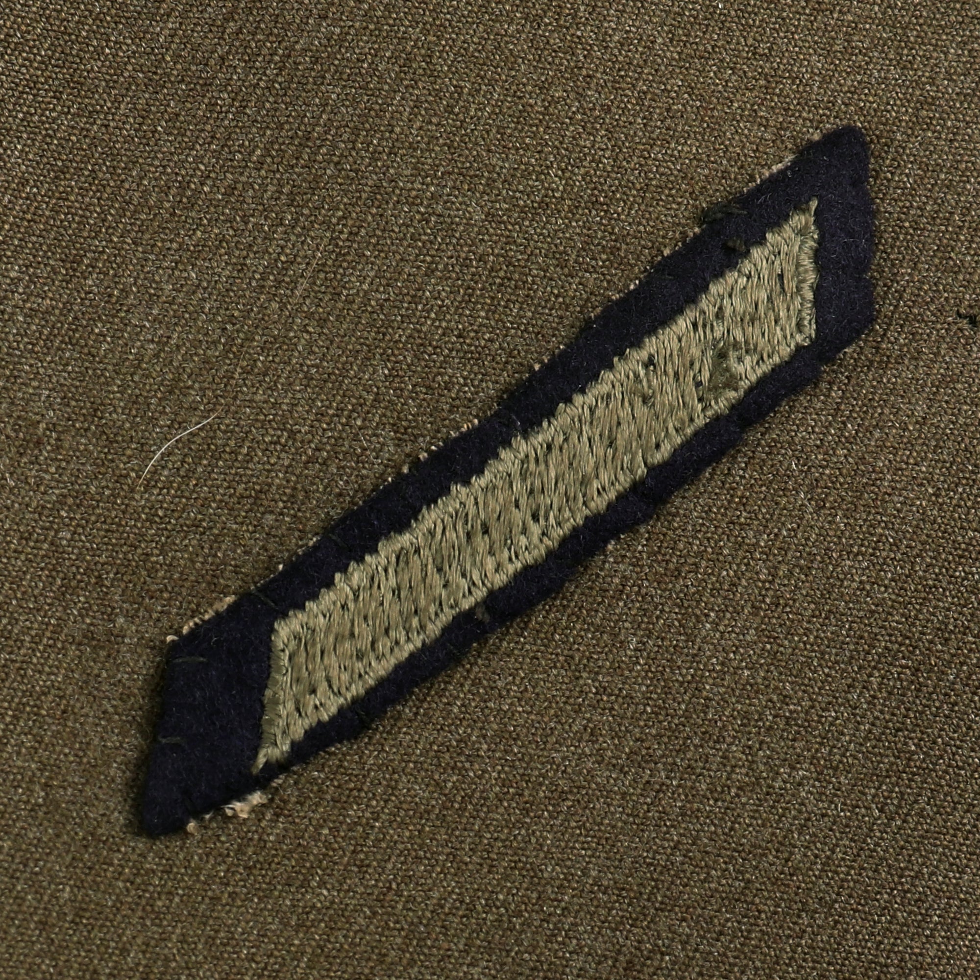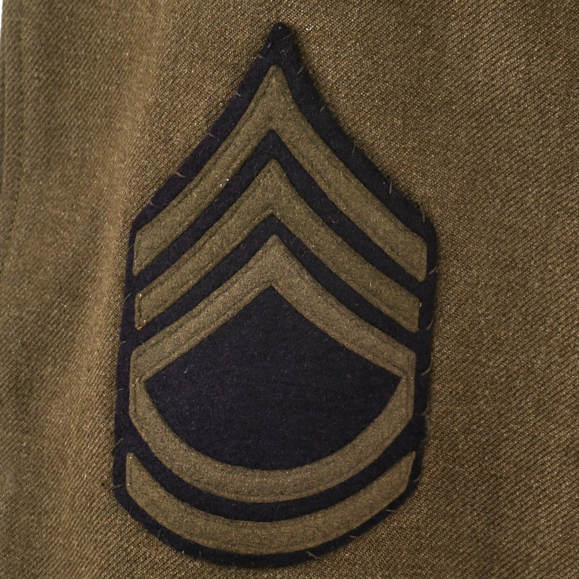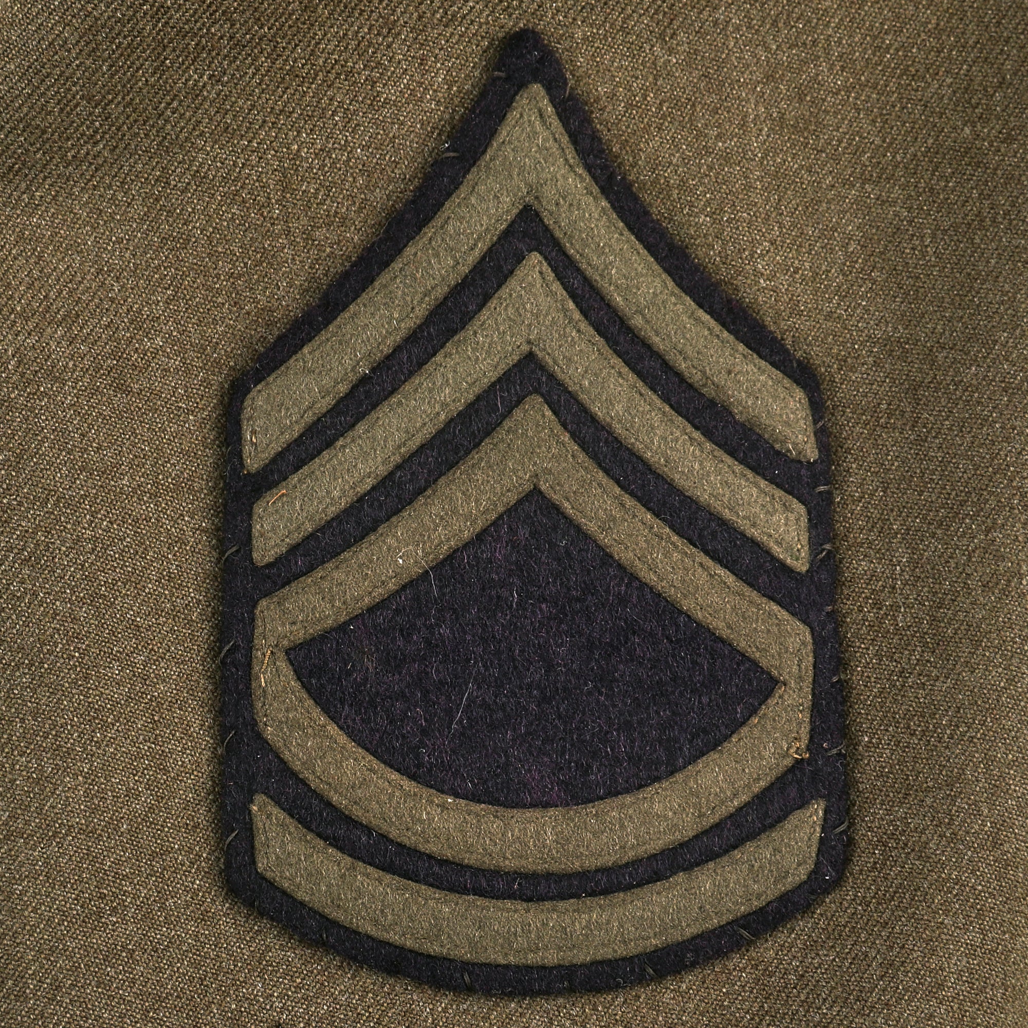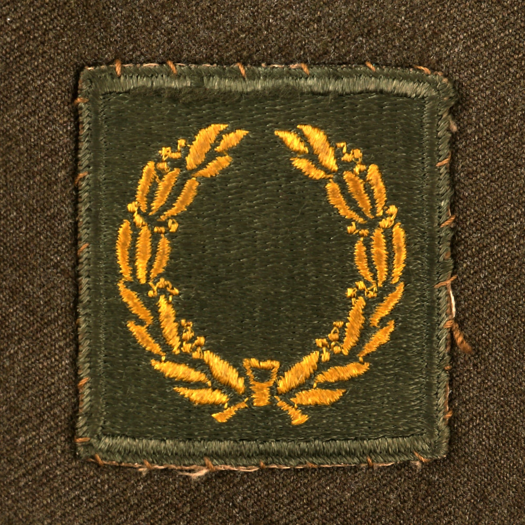 - Paris-Made Women’s Ike Jacket with a gorgeous bullion patch for SHAEF, the Supreme Headquarters Allied Expeditionary Force. The jacket has Sergeant First Class chevrons on both sleeves, one service stripe on the left cuff, a Meritorious service patch on the right cuff, US & Signal Corps insignia on the collar, and a 4-place ribbon bar with an Army Good Conduct Medal with device, American Campaign Medal, WWII Victory Medal, and the Army of Occupation in Germany Medal. The uniform is in great shape and is dated 1945.