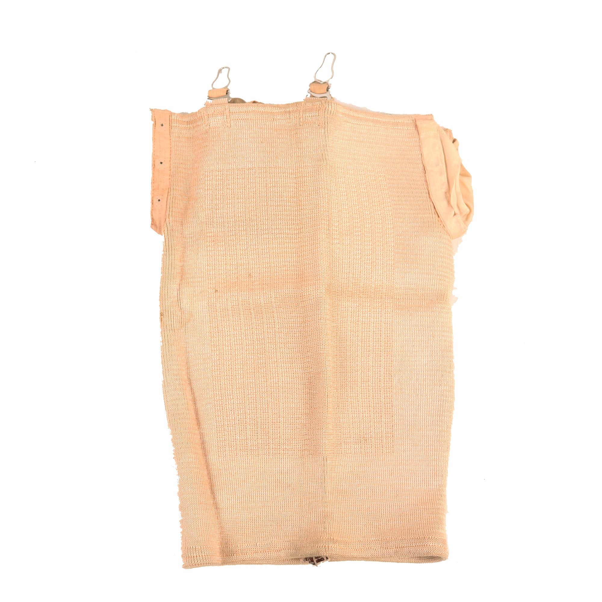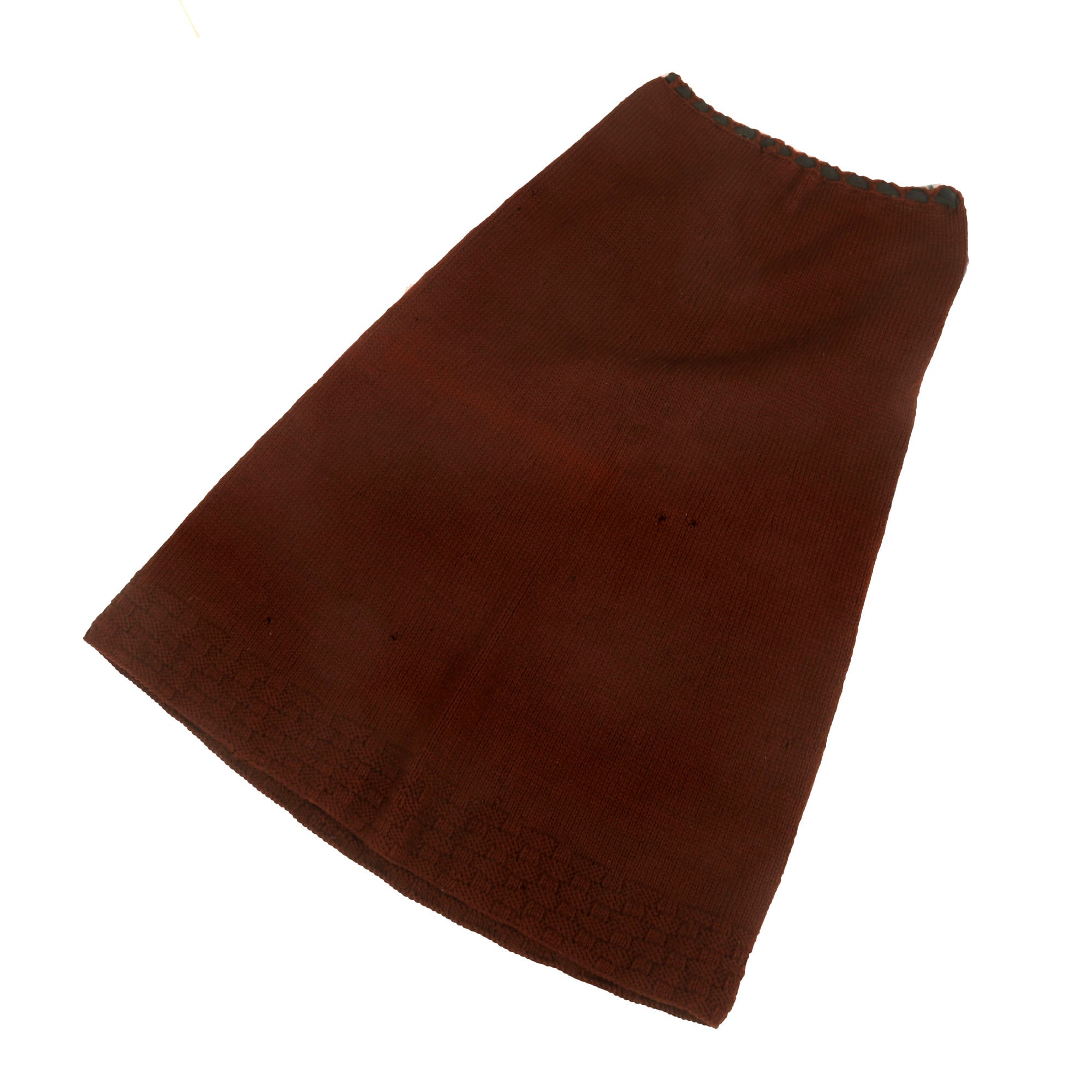 - A fantastic sewn red-wool skirt with an elastic band sewn into the waist. A really stellar piece with a nice pattern at the bottom.