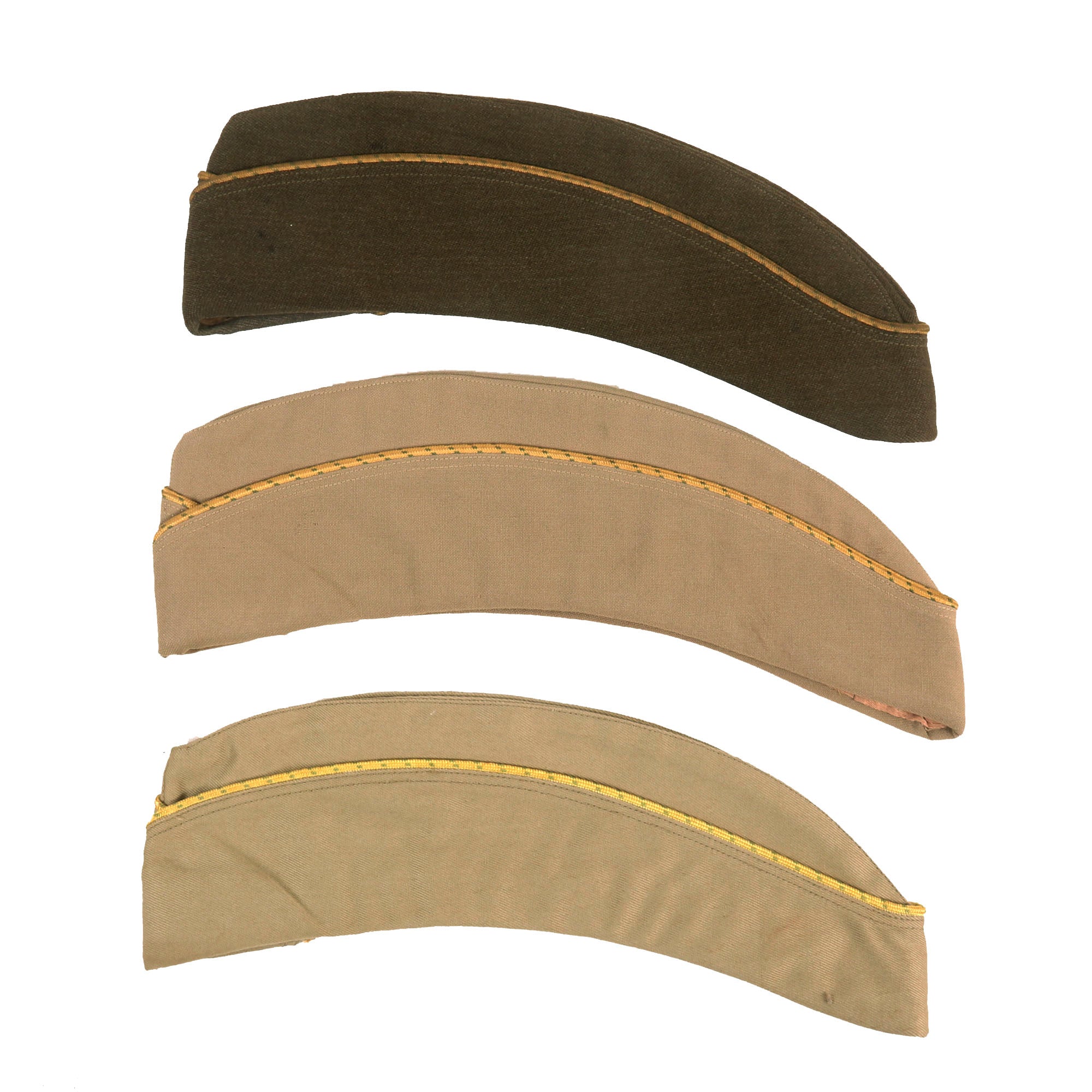 Three WAC Female overseas caps with yellow & green piping indicating WAC service. Size 21½ and 20. The third is a private purchase example with the name WOODSER inside. This could be a good hint at identifying this woman.