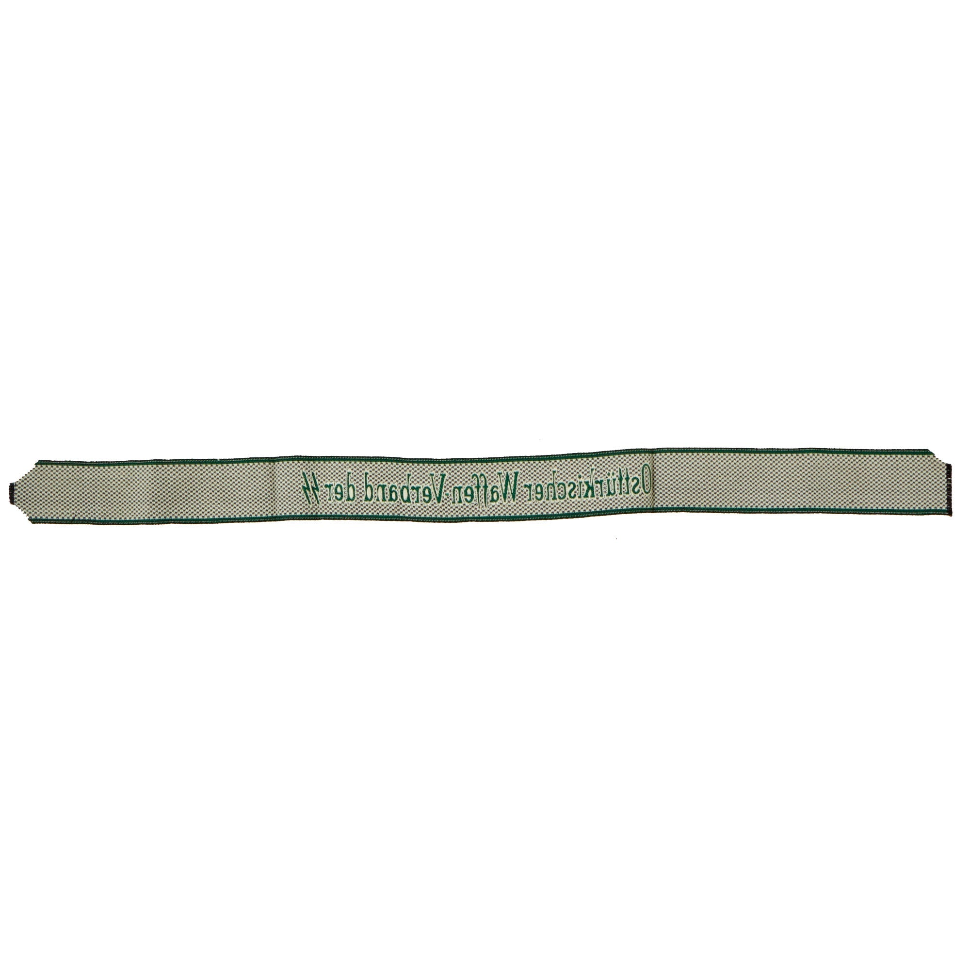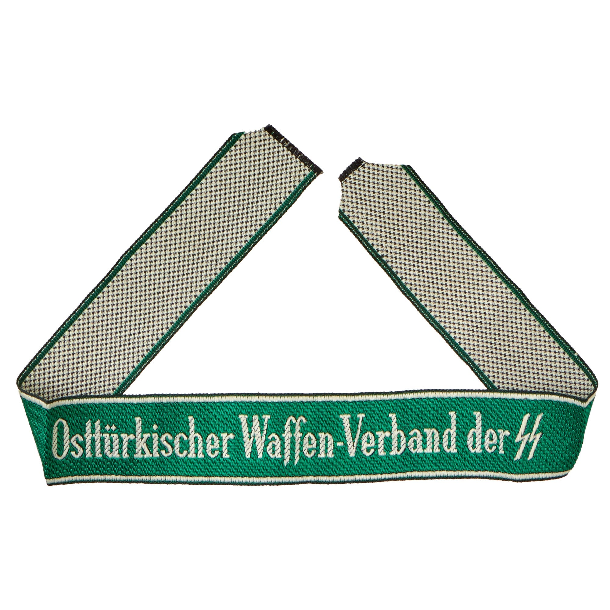 One of these Non-German Waffen SS formations was the Osttürkische Waffen-Verbände der SS (Eastern Turkish Armed Detachment of the SS), formed mostly from Eastern Turkic Muslim "volunteers". This is a very nice unissued Ärmelstreiffen (cuff title) from the group, BeVo embroidered with white text on green with Osttürkischer Waffen-Verband der ᛋᛋ. The cuff title measures approximately 17 1/4" x 1 1/8", and is in excellent unissued condition, with no evidence of ever having been attached to a uniform. We have compared it to other period examples and it is completely correct.