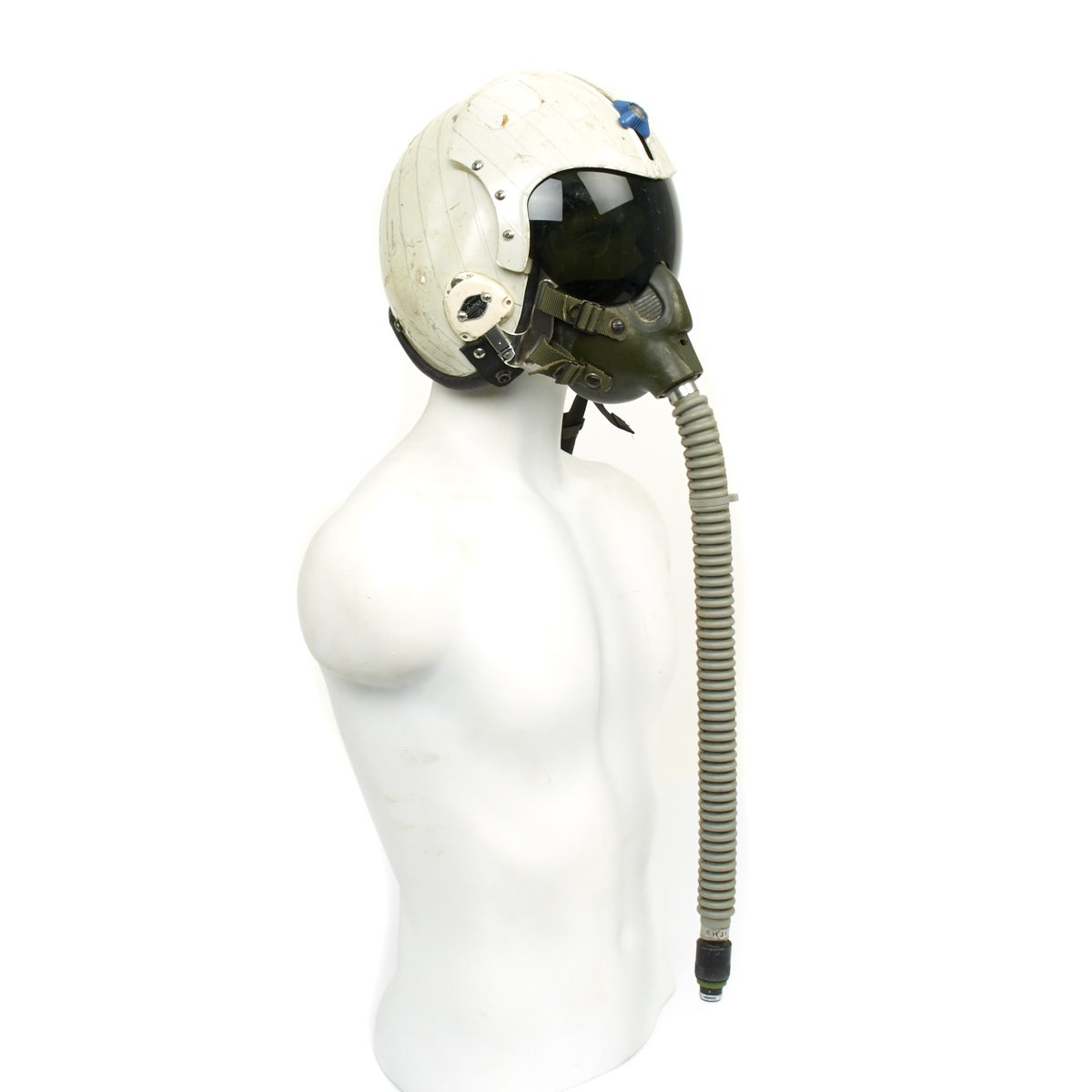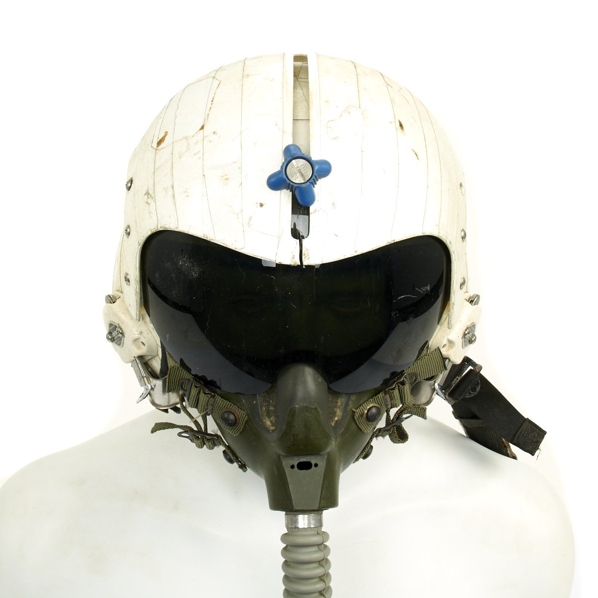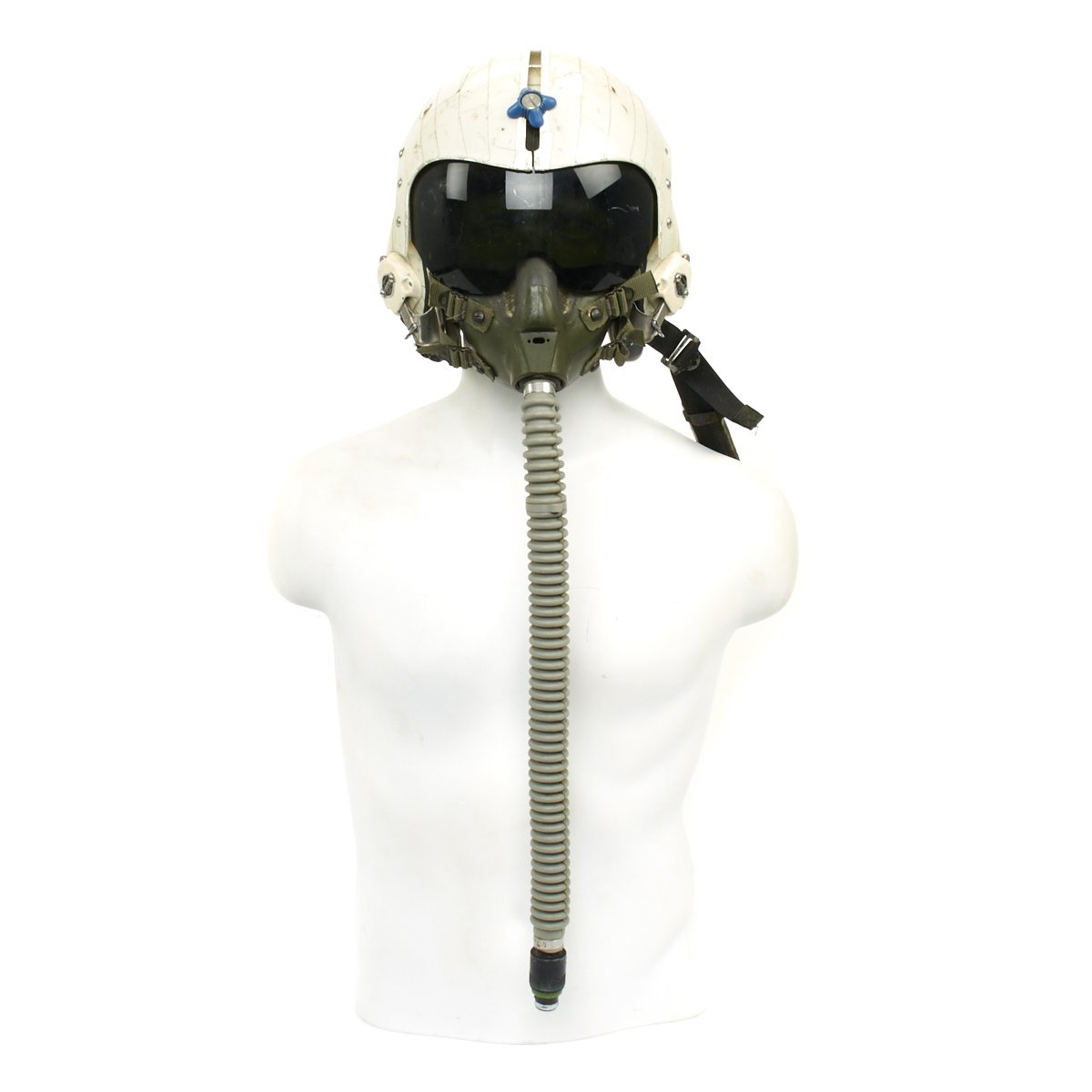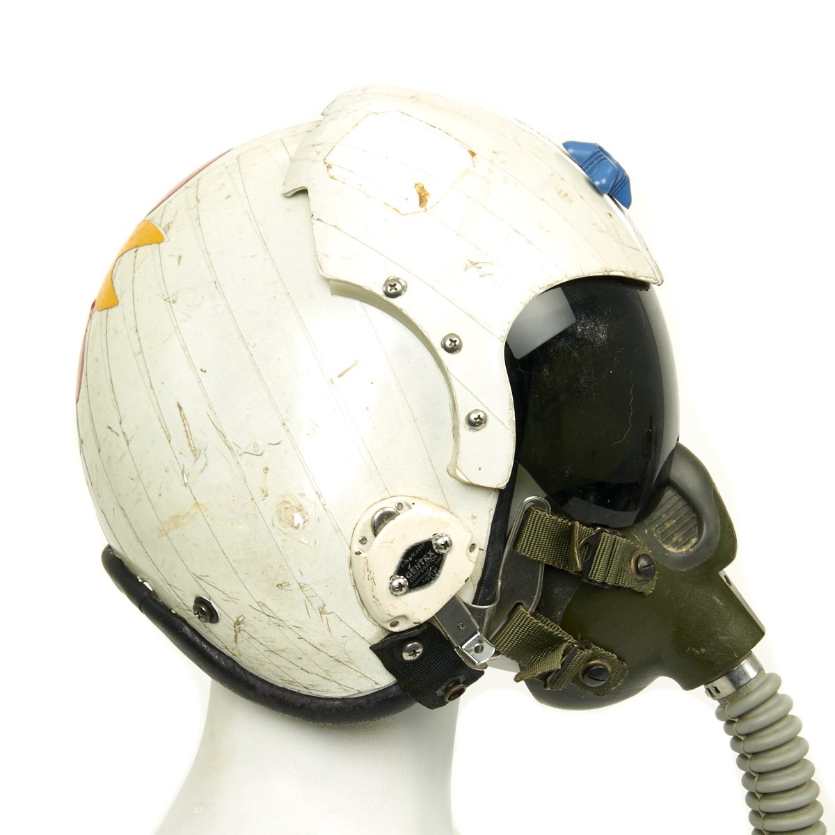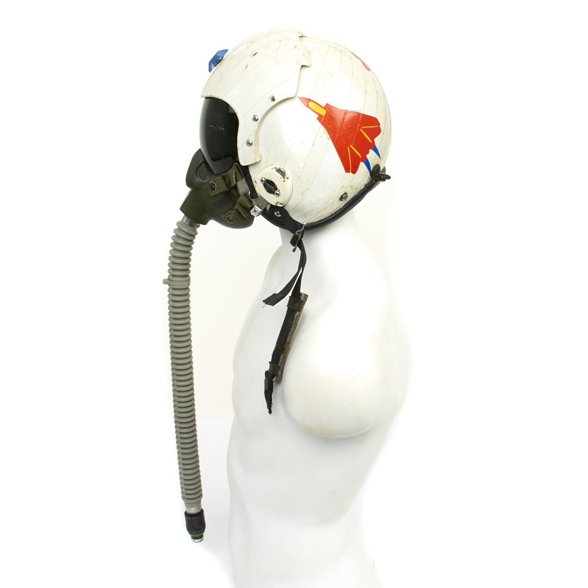 Original Items: Only One Available. This is a nice condition genuine 1980s era U.S. Navy Aviator size medium HGU-33/P flying helmet that comes with ear phones, high altitude oxygen mask and tinted visor. This is the same model helmet that was used in the Tom Cruise film Top Gun. It was manufactured by Gentex and bears multiple data plates as well as classic reflective tape, a rooster insignia and and an F-14 Tomcat on the side of the helmet.
