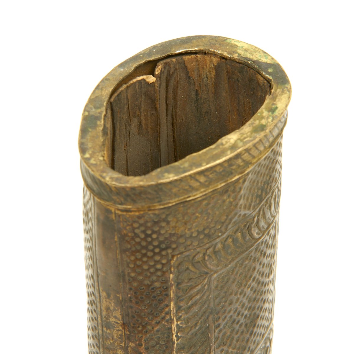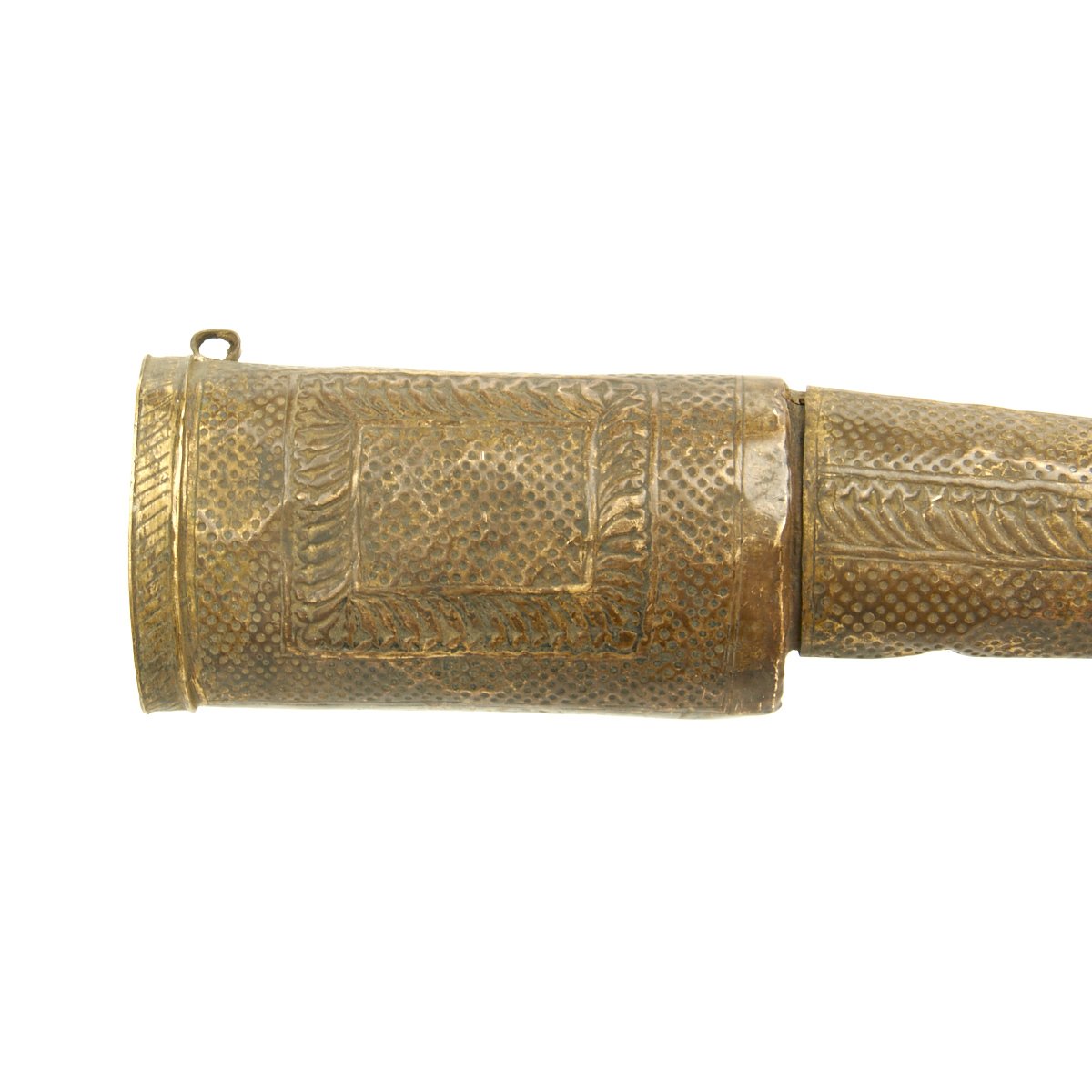 It comes complete with an ornate scabbard, which is a wood covered entirely with embossed brass. There is some denting to the brass covering, but it is still in very good condition.