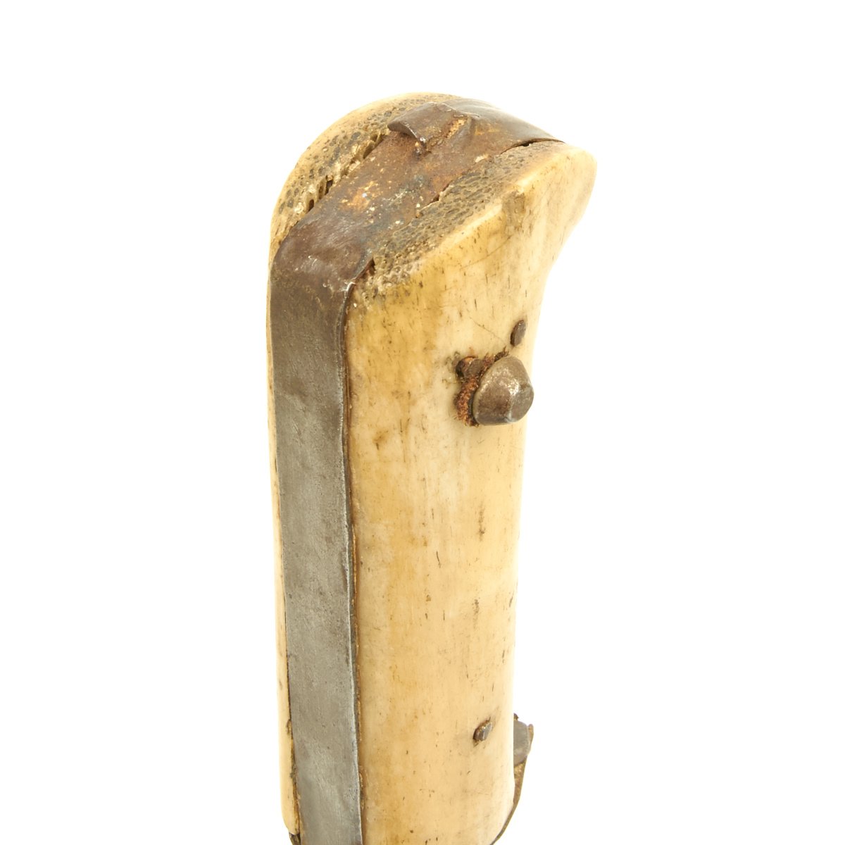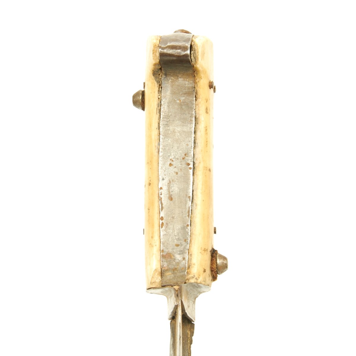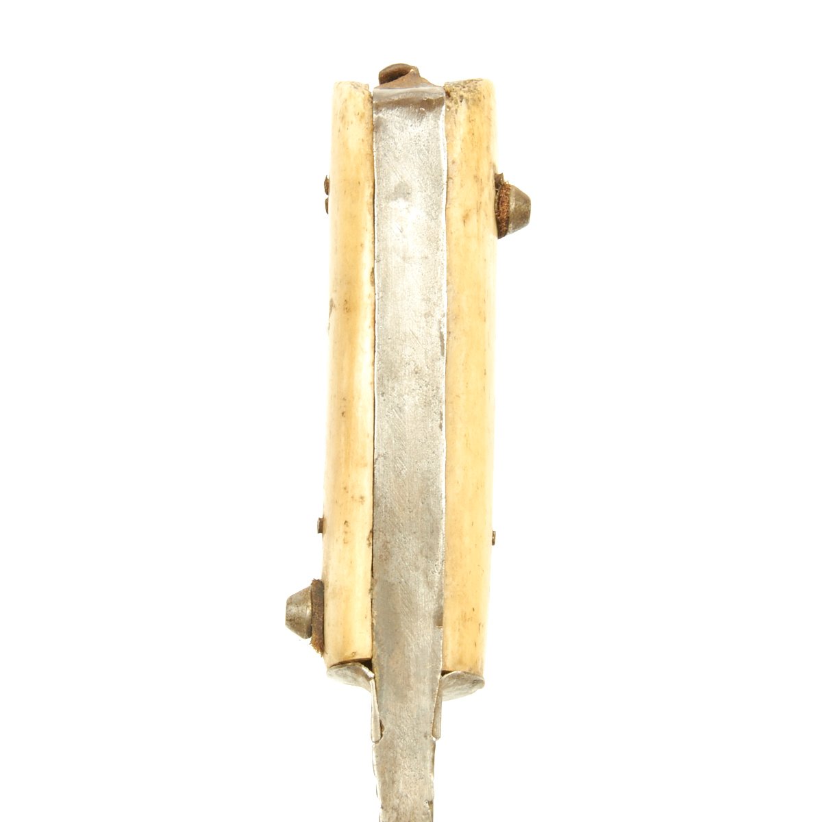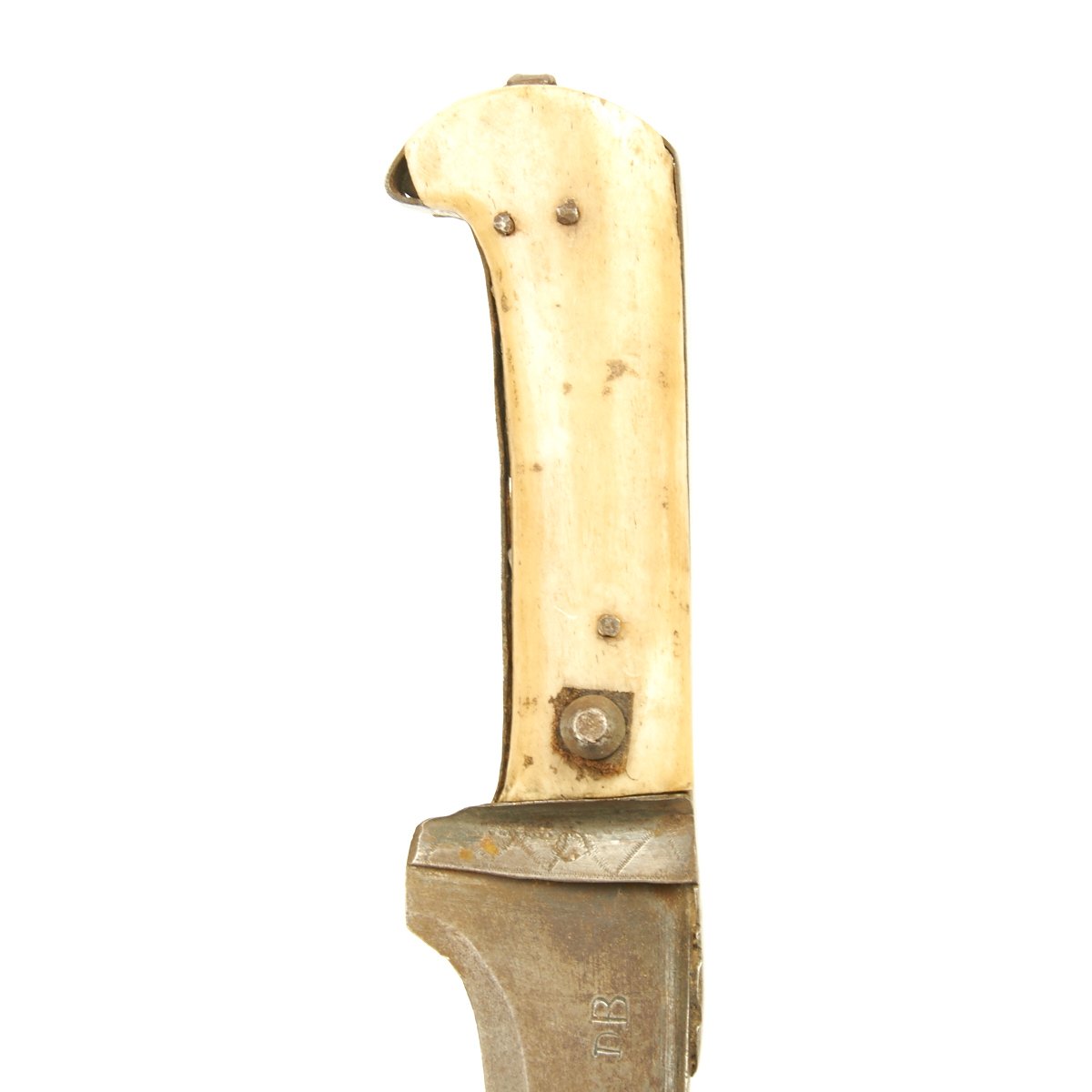 Our example comes from a British Regimental Museum broken up in the 1960's, and this was brought home by an Officer, from who, it was obtained. It has a 10 1/2 inch blade, and is 15 inches over all, with bone grip scales attached on either side of the full tang. There is a bit of staining to the blade, but only on the surface, and there is no pitting. The blade also has D B stamped into the side, probably by the soldier who brought it back.