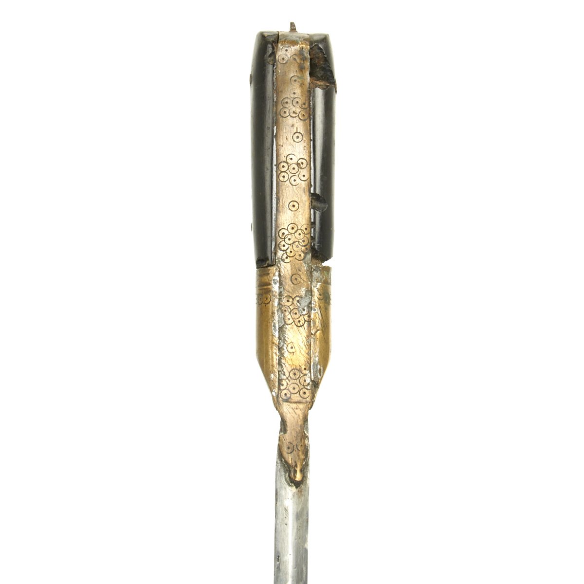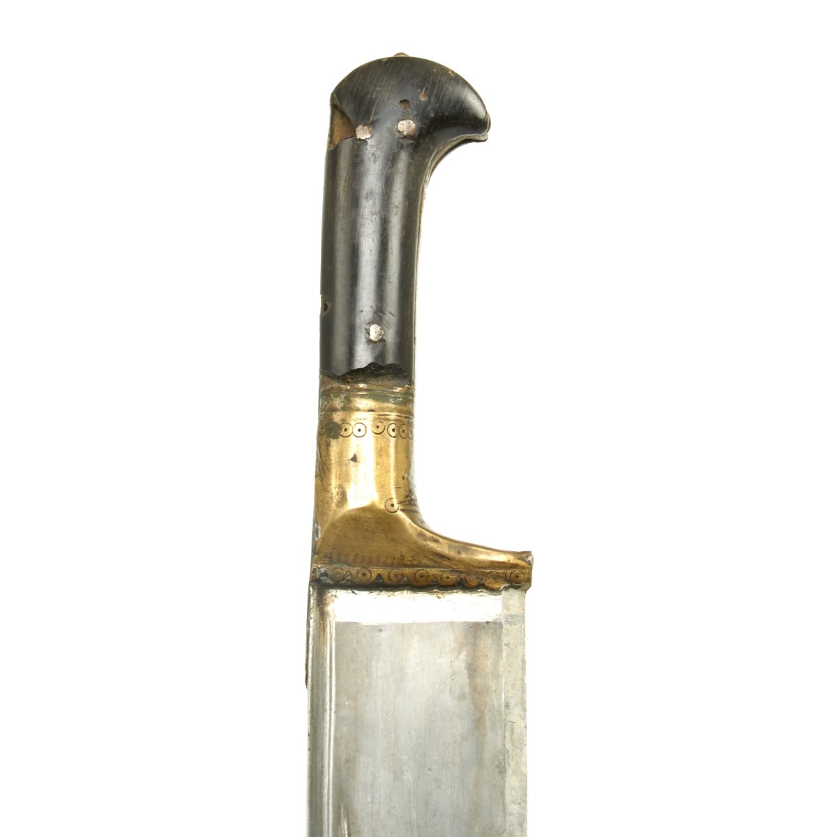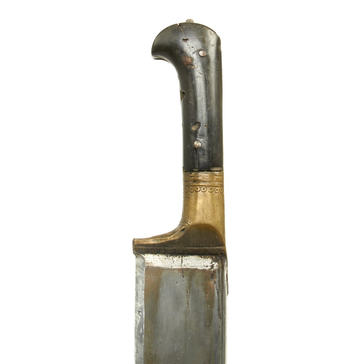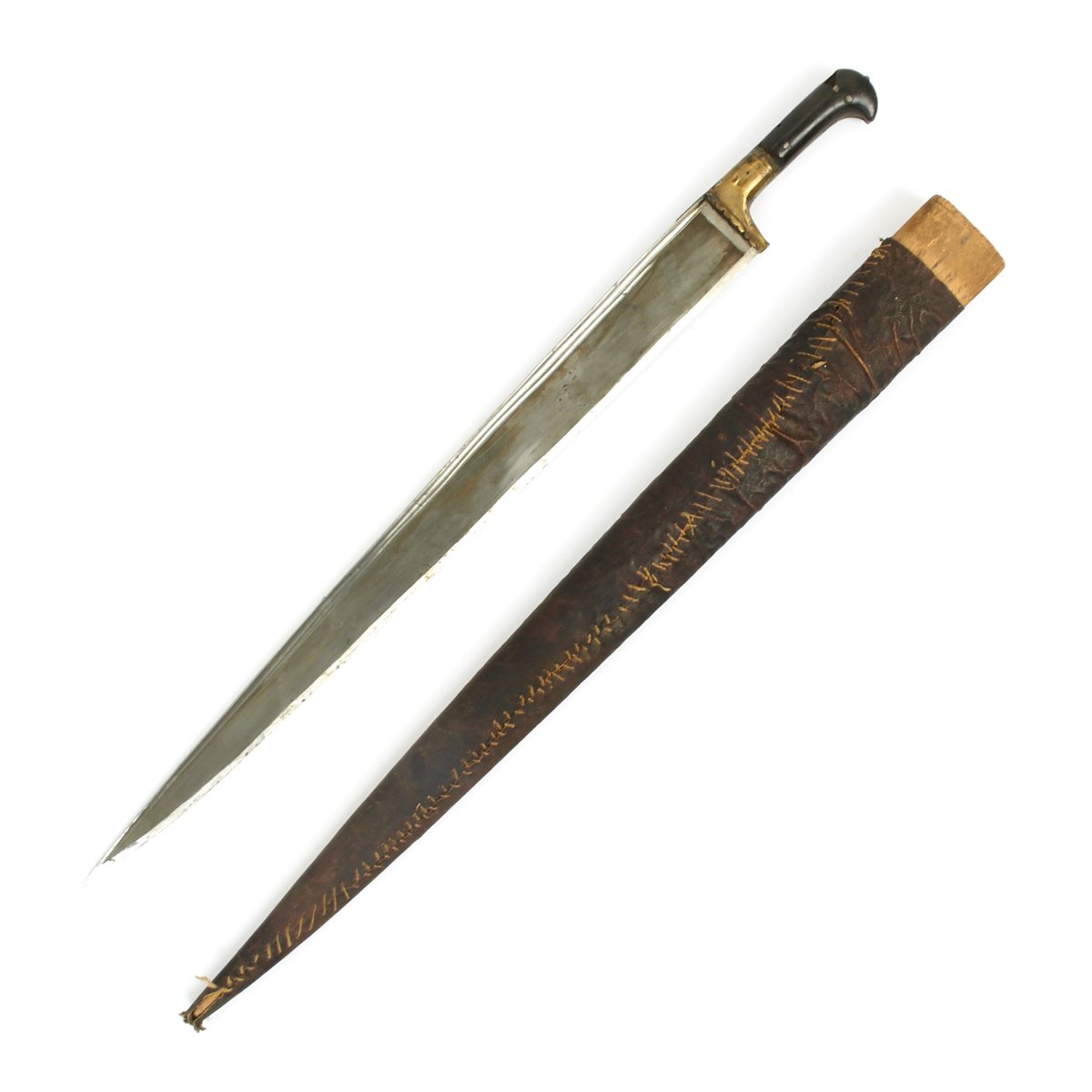 It comes in its original leather covered wood scabbard that is itself 26 1/2 inches long, so it covers the weapon to only leave the very top of the hilt exposed. The leather exterior has unfortunately shrunk with age. The knife/sword is still fitted with its original Horn grip plates, fitted on either side of the full tang, though one grip plate has a chunk missing. The rest of the hilt is engraved brass.
