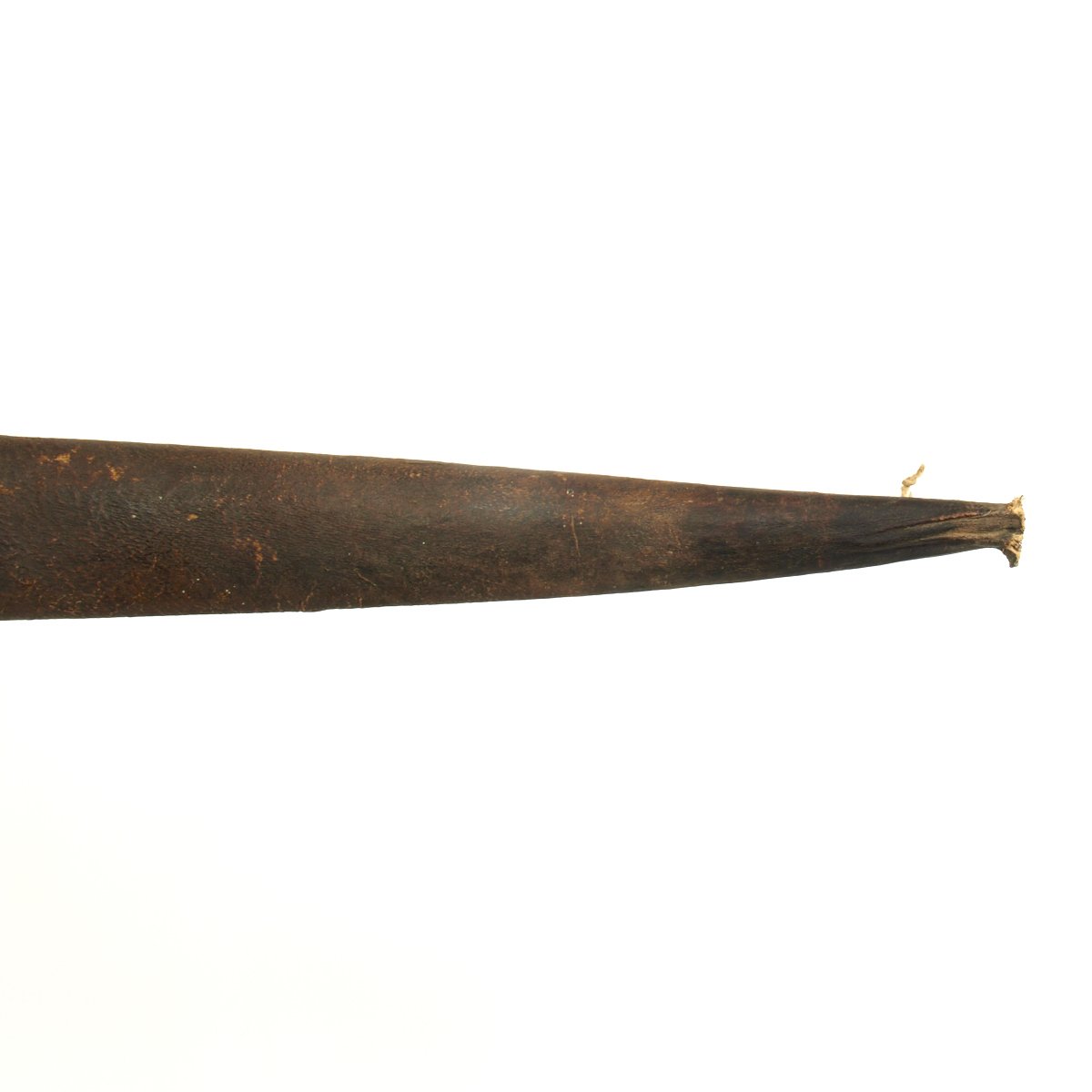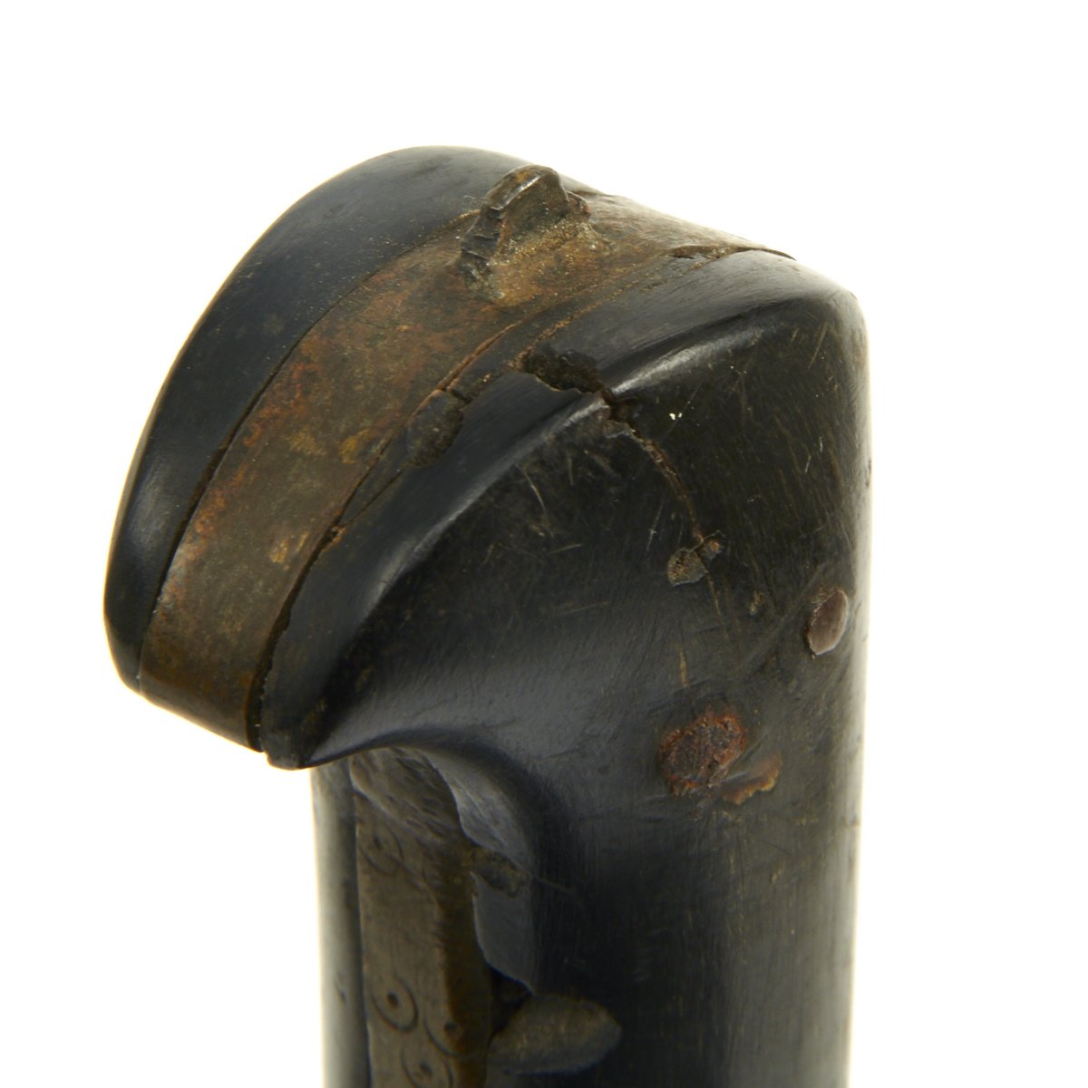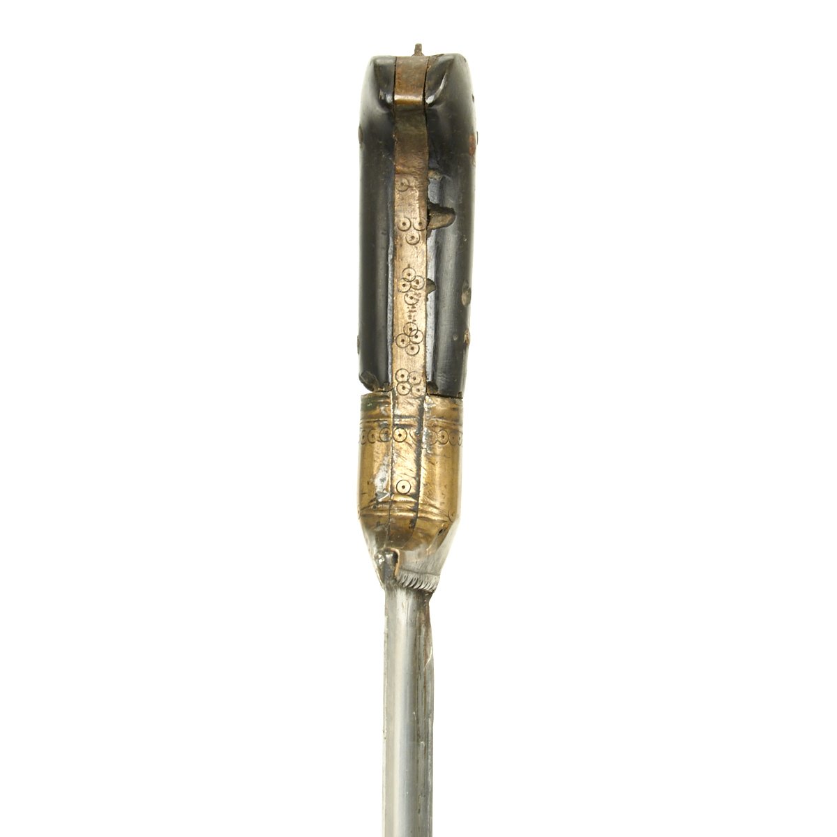 It comes in its original leather covered wood scabbard that is itself 26 1/2 inches long, so it covers the weapon to only leave the very top of the hilt exposed. The leather exterior has unfortunately shrunk with age. The knife/sword is still fitted with its original Horn grip plates, fitted on either side of the full tang, though one grip plate has a chunk missing. The rest of the hilt is engraved brass.
