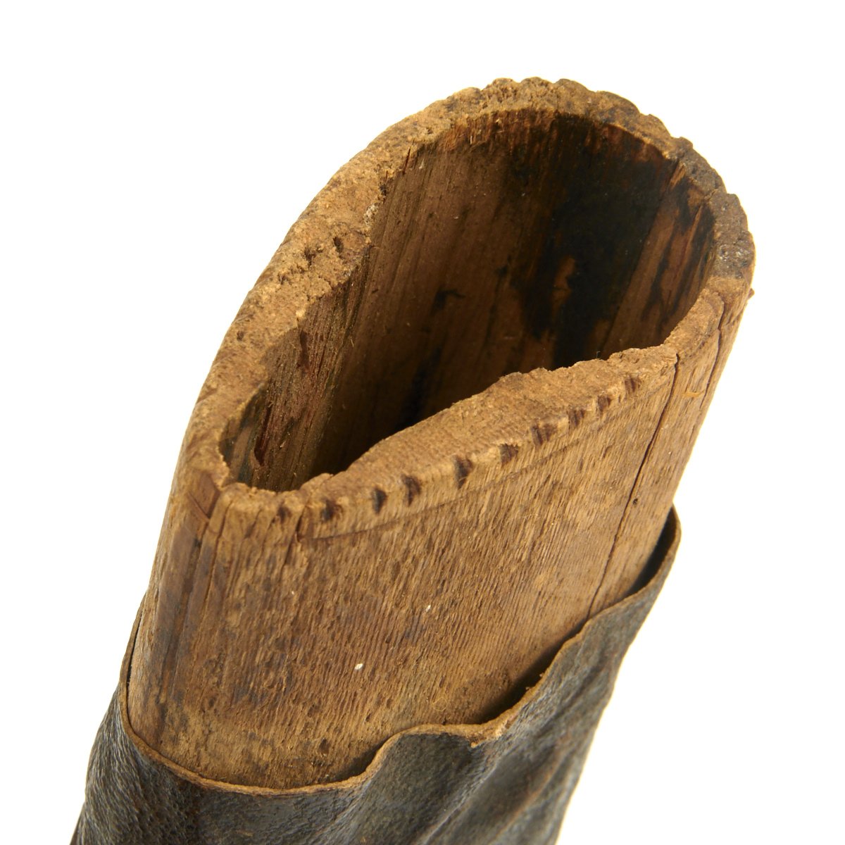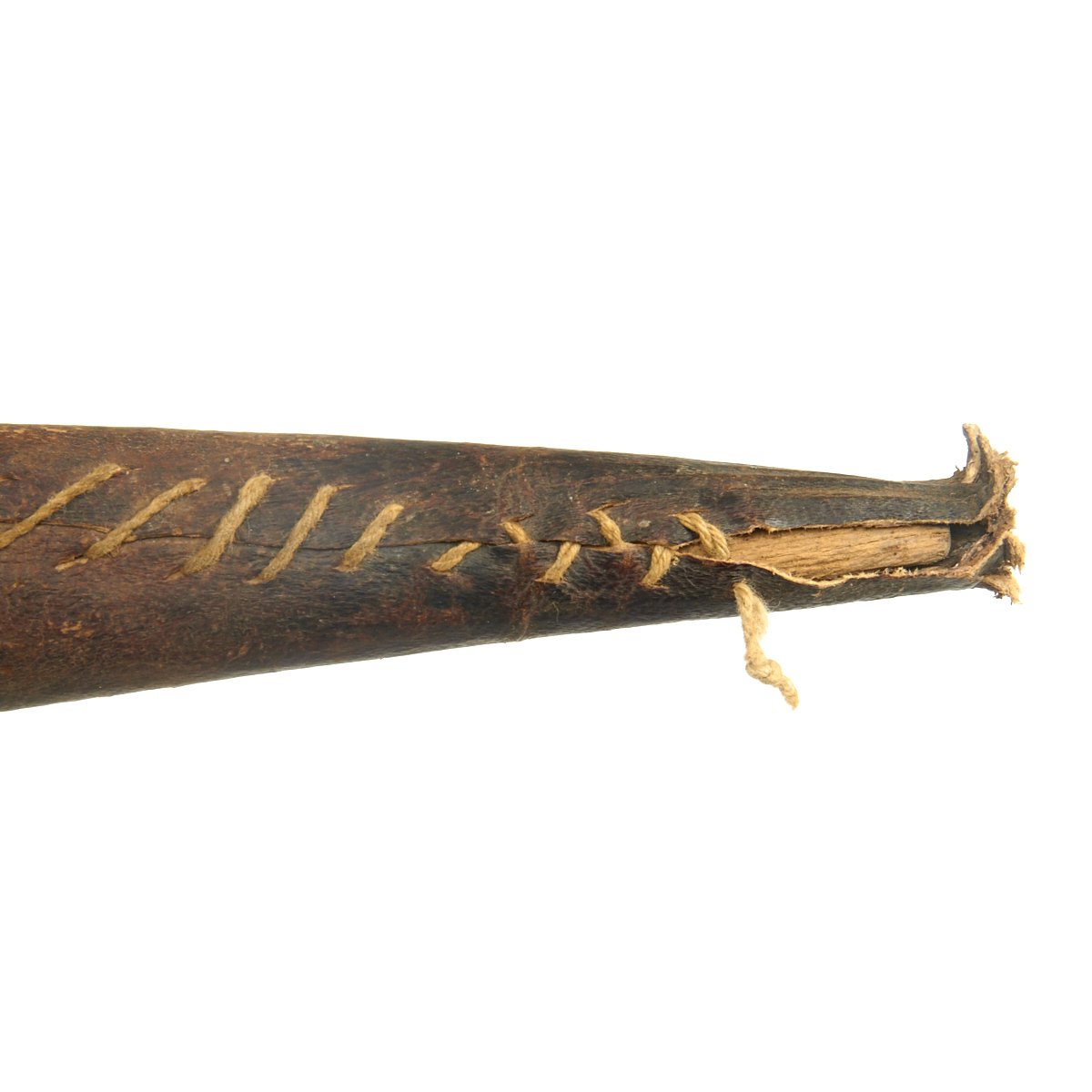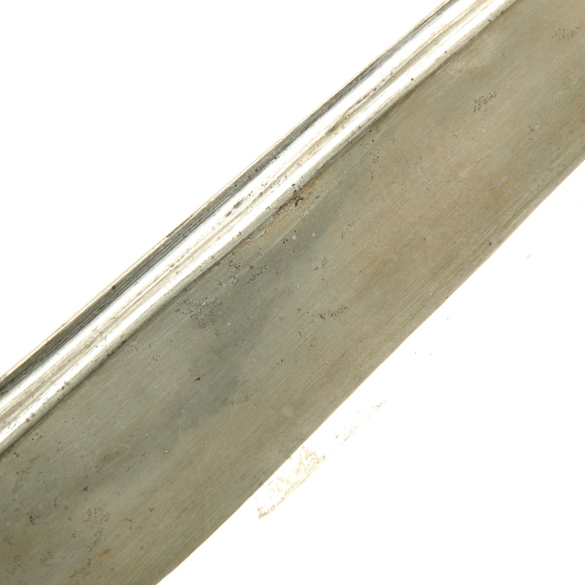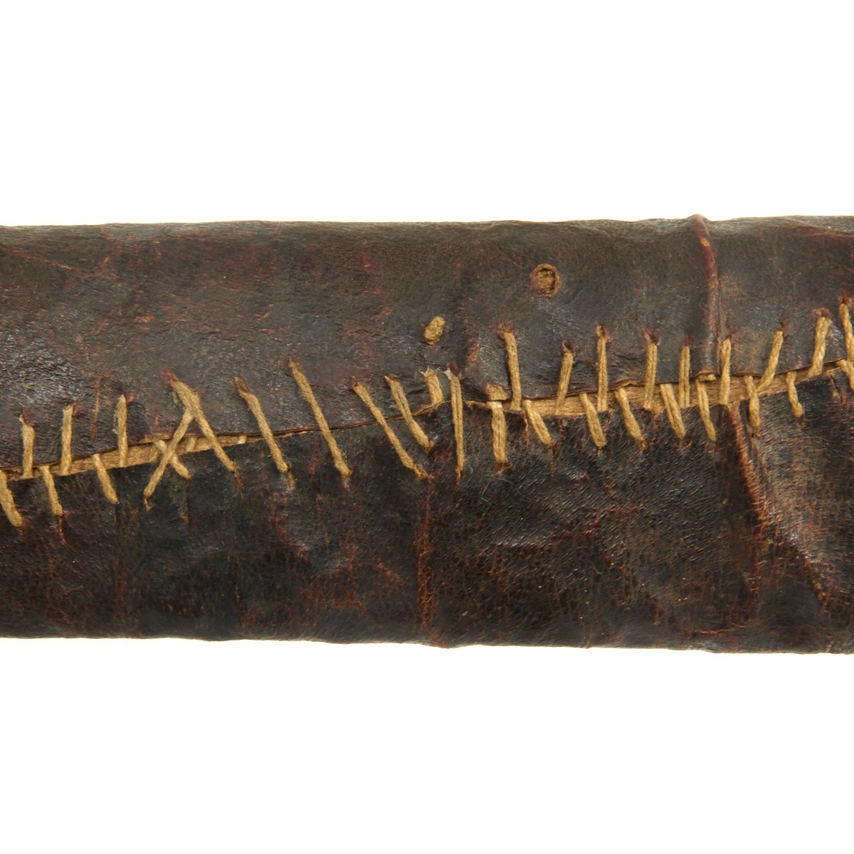 It comes in its original leather covered wood scabbard that is itself 26 1/2 inches long, so it covers the weapon to only leave the very top of the hilt exposed. The leather exterior has unfortunately shrunk with age. The knife/sword is still fitted with its original Horn grip plates, fitted on either side of the full tang, though one grip plate has a chunk missing. The rest of the hilt is engraved brass.