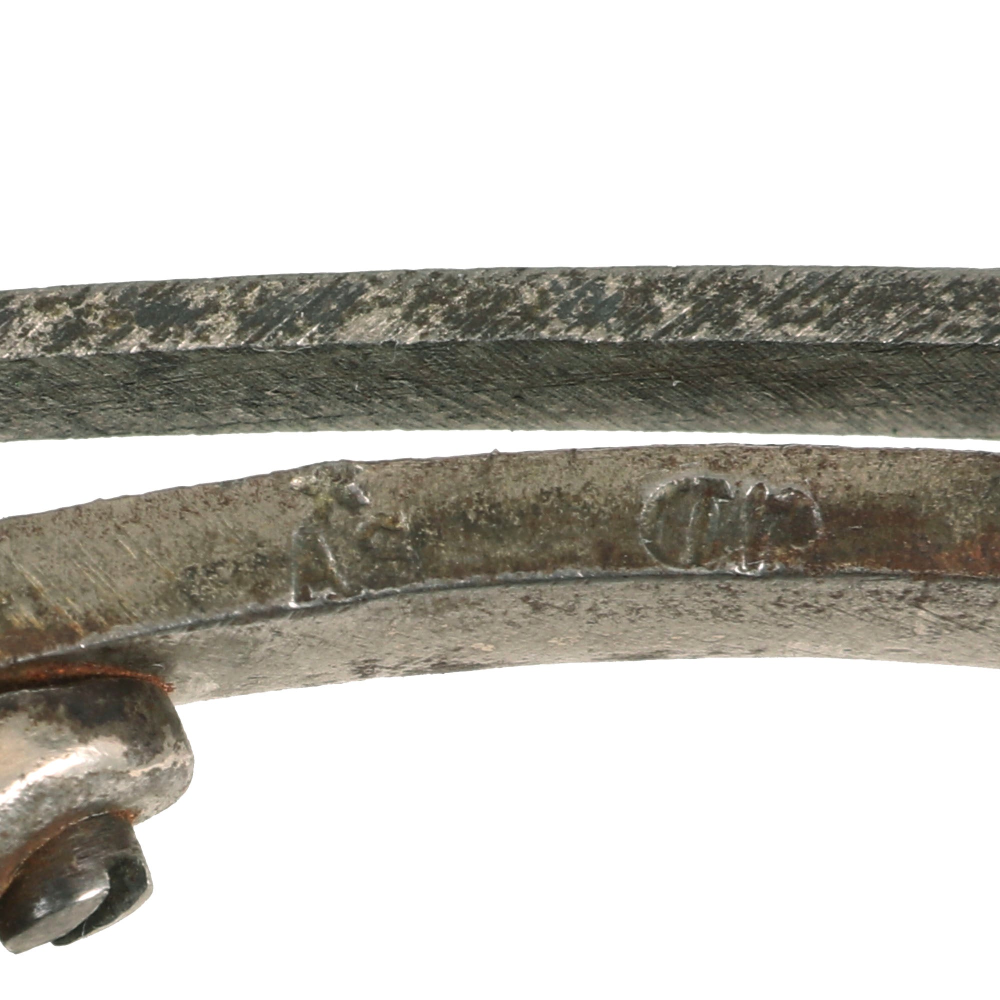This revolver is a very nice Webley-Pryse style design, top break with a built in ejector, and is a "double action" design. It has the single-sided push button breech release on the left side, correct for the pattern. This was a patented design, which may explain the lack of markings: the maker did not want to encourage litigation. The revolver very much like revolvers produced by Belgian maker Jean Warnant, but is not marked as such. Per a customer request, we removed the grip scales, and it is marked with ★ / AS and JD on the left grip frame, with what looks to be an H or W at the bottom near the butt cap.