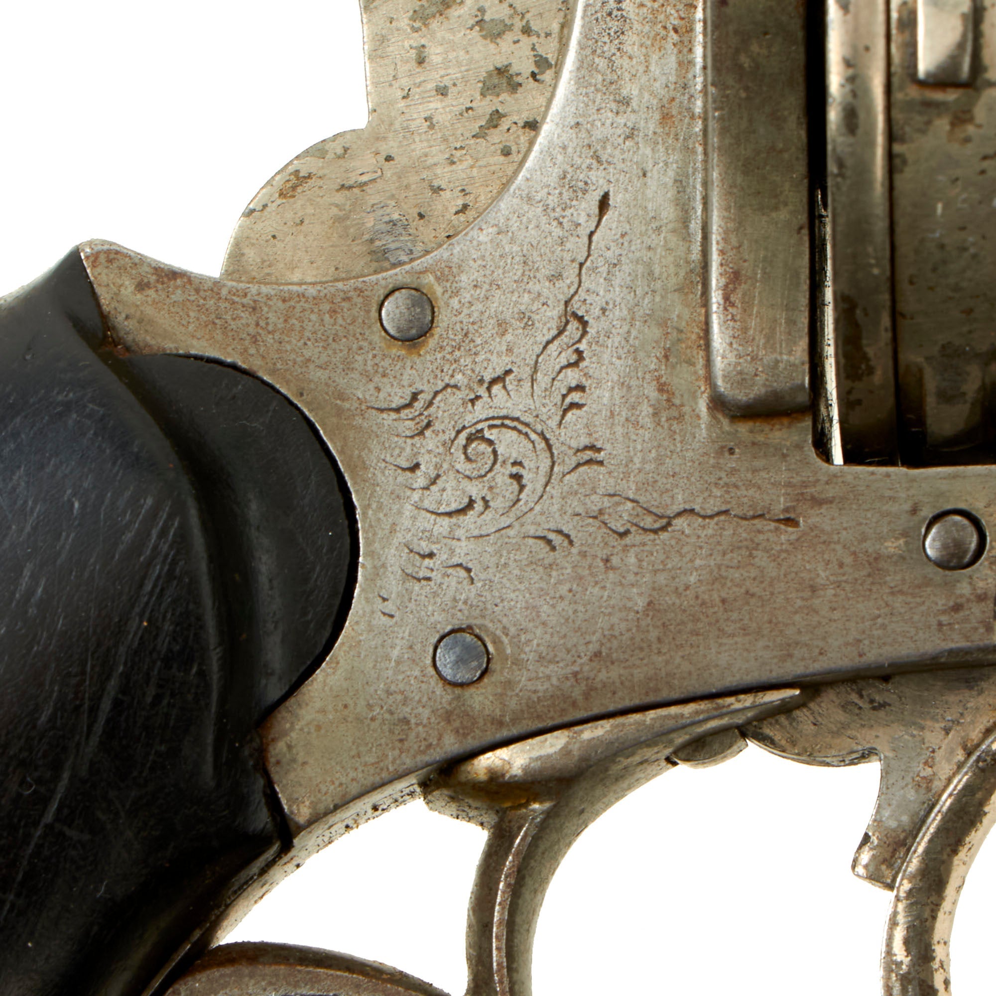 The revolver presents very nicely, with the nickel-plated finish retained at about 60%. There is no major oxidation or rust issues in the areas where the finish has worn away. The grips are dark hardwood, with a very close grain, so they could be ebony. They show light wear, with some minor chipping on the left side near the grip spur.