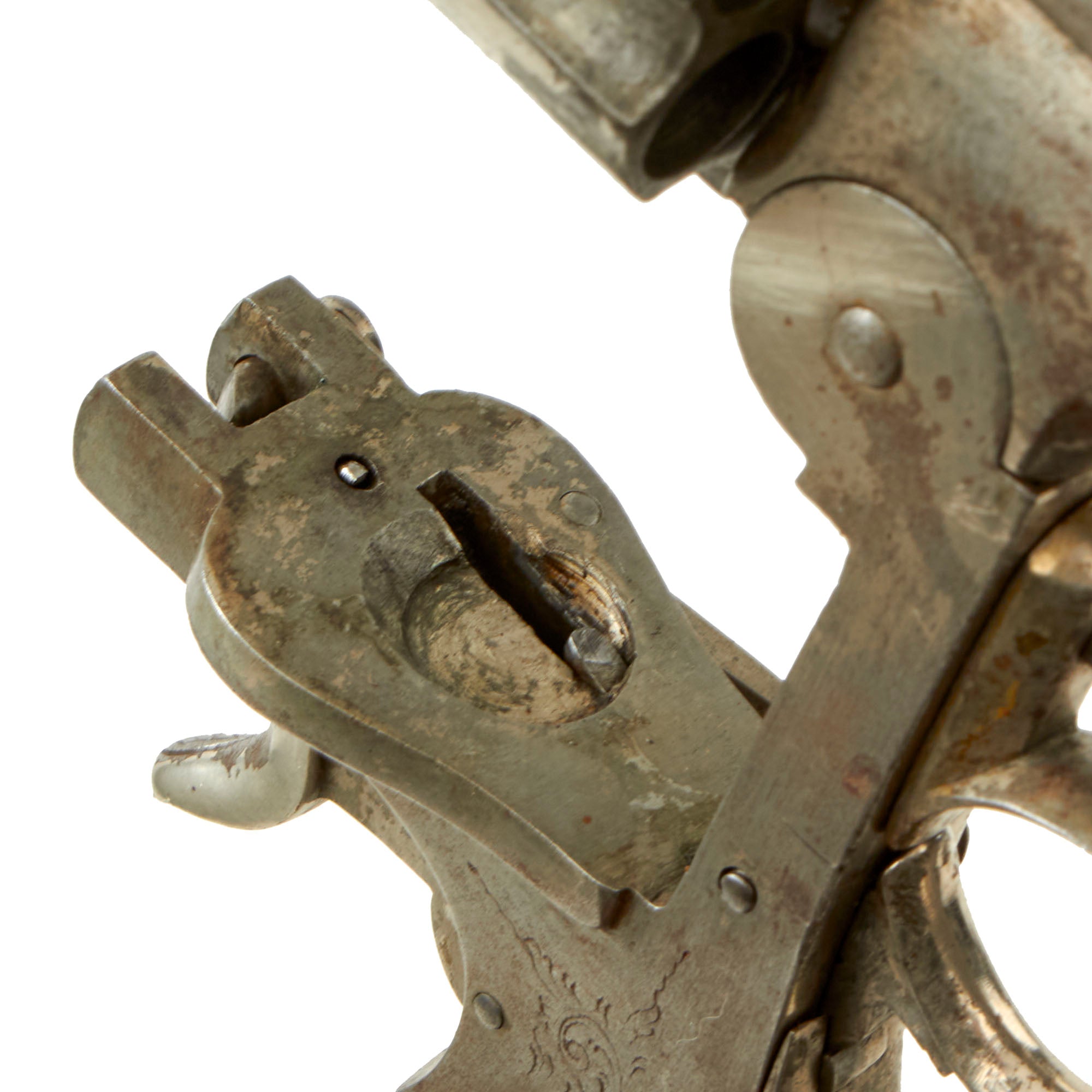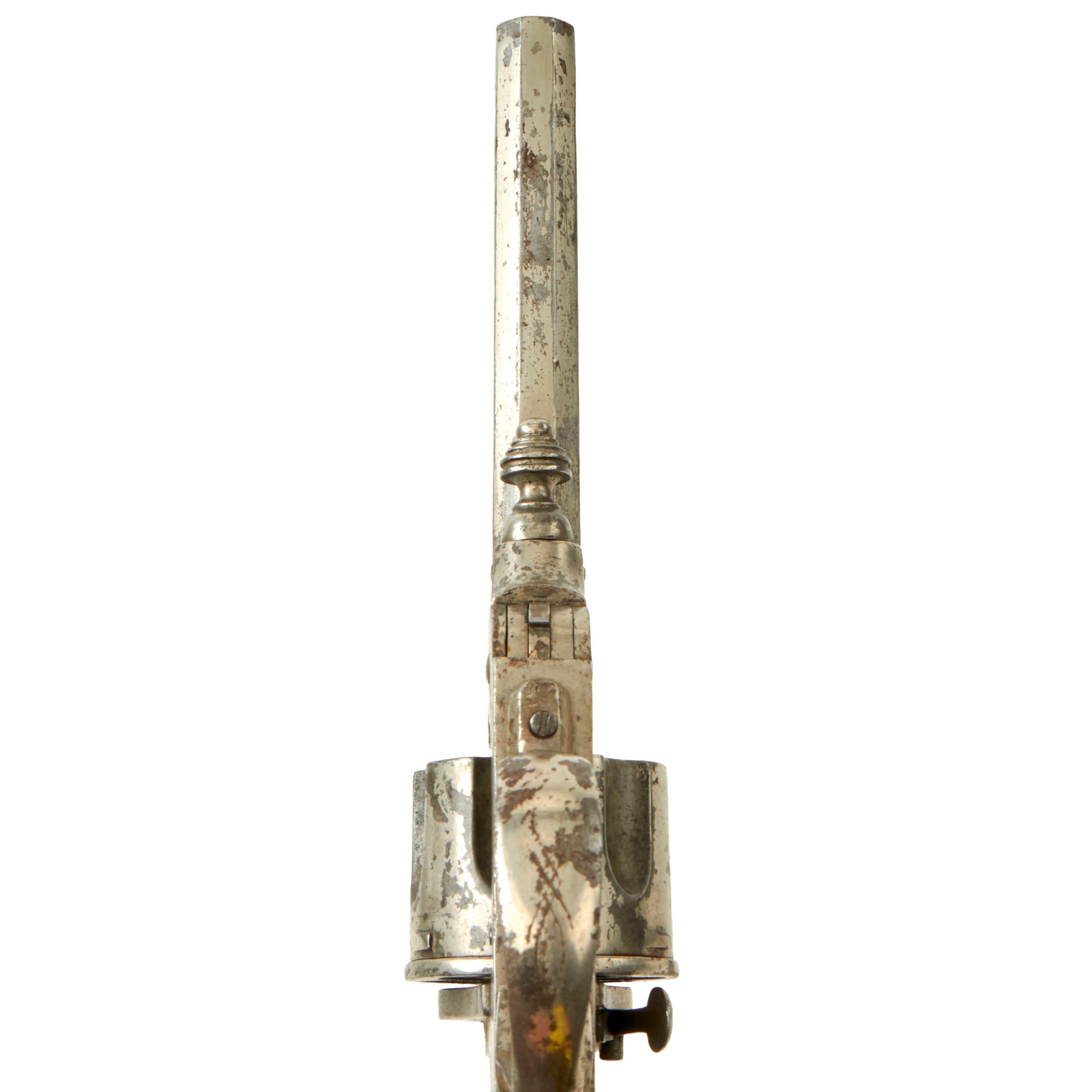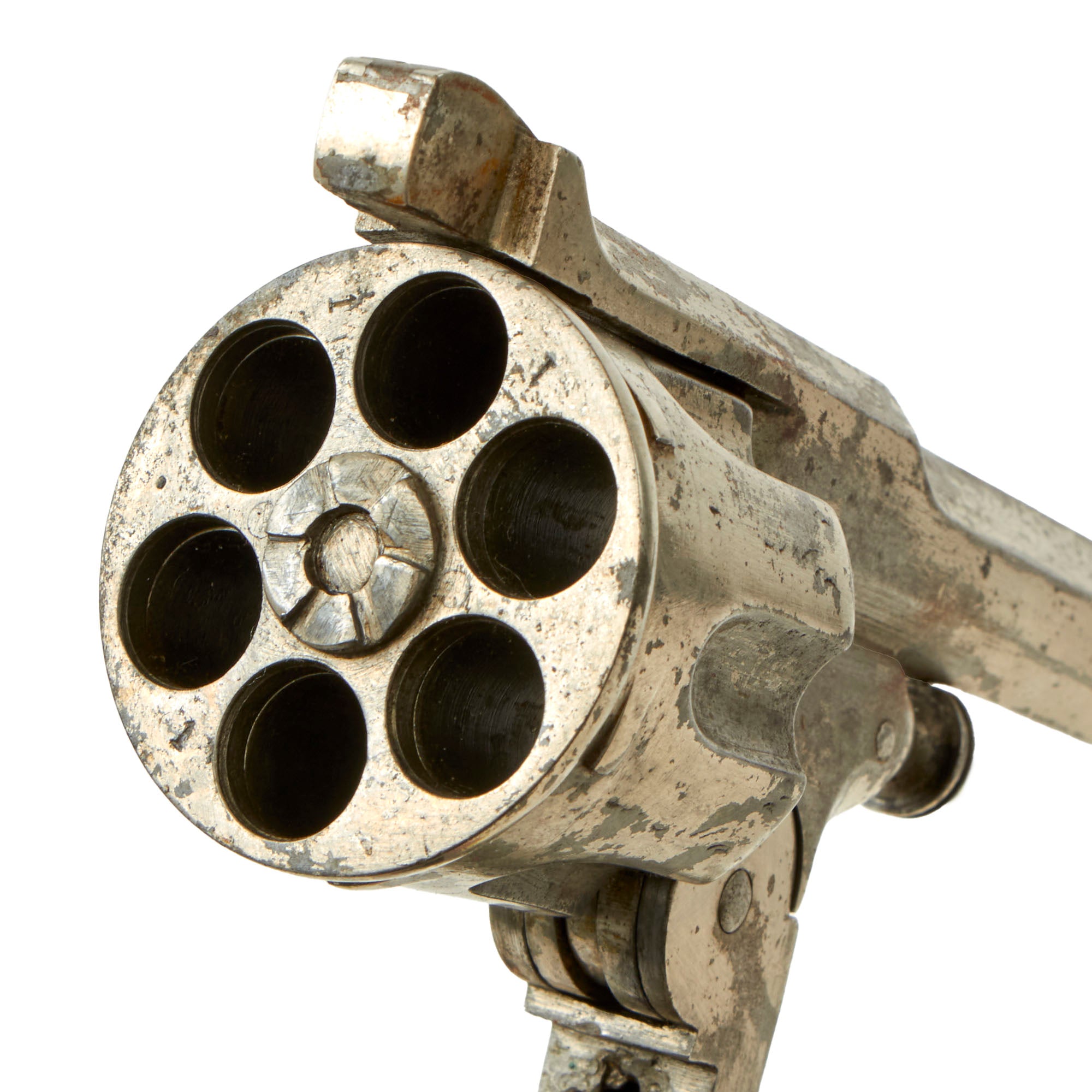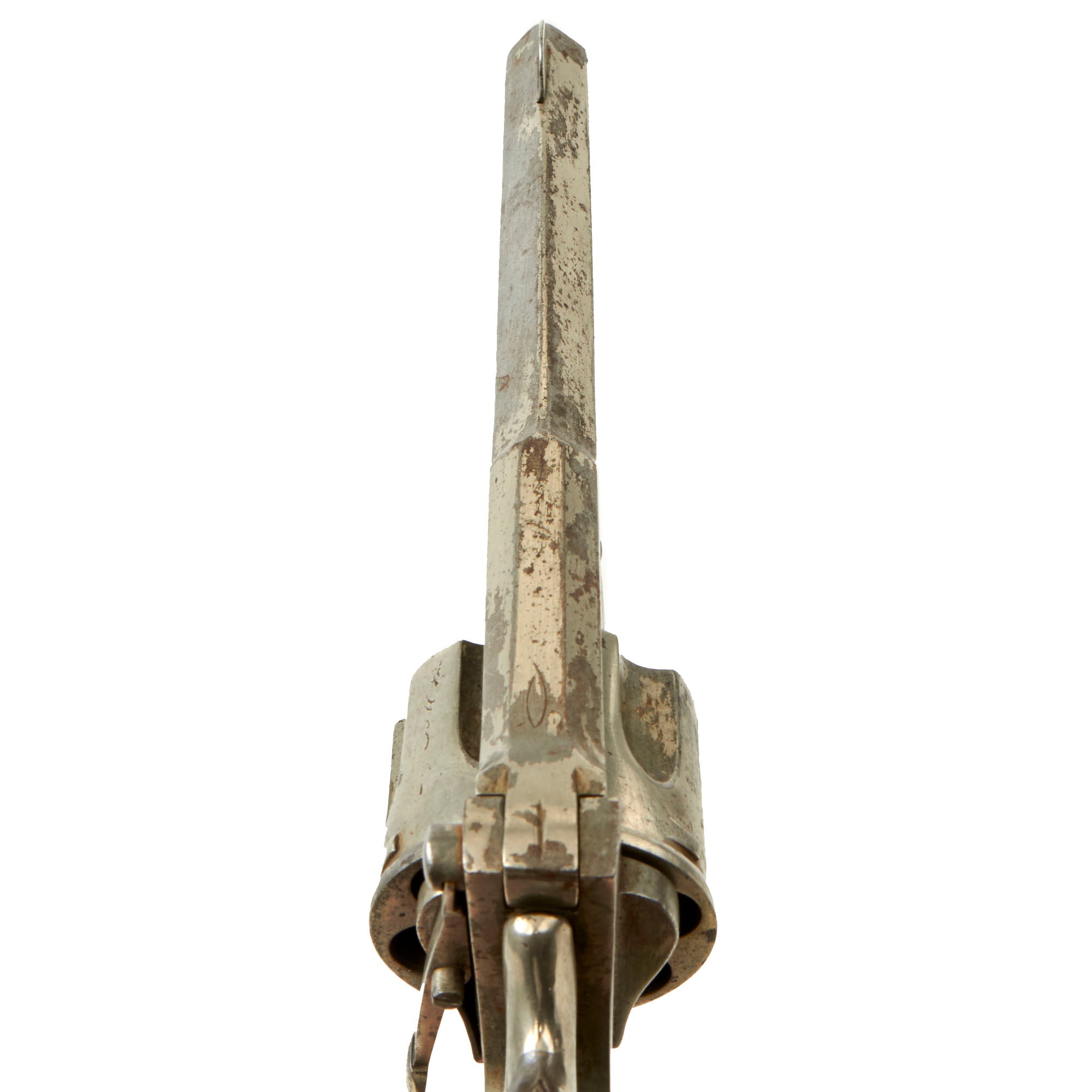 There is no caliber marking that we could find on the revolver, but the bore measures about .440" land to land at both the muzzle and the breech end, with the cylinder chambers measuring about .460" at the muzzle and .486" at the breech ends. The cylinder is only 1.42 inches long, which is too short for .455 Webley, and borderline for .476 Enfield. We assume this is for a .45 Adams / Boxer black powder centerfire cartridge.